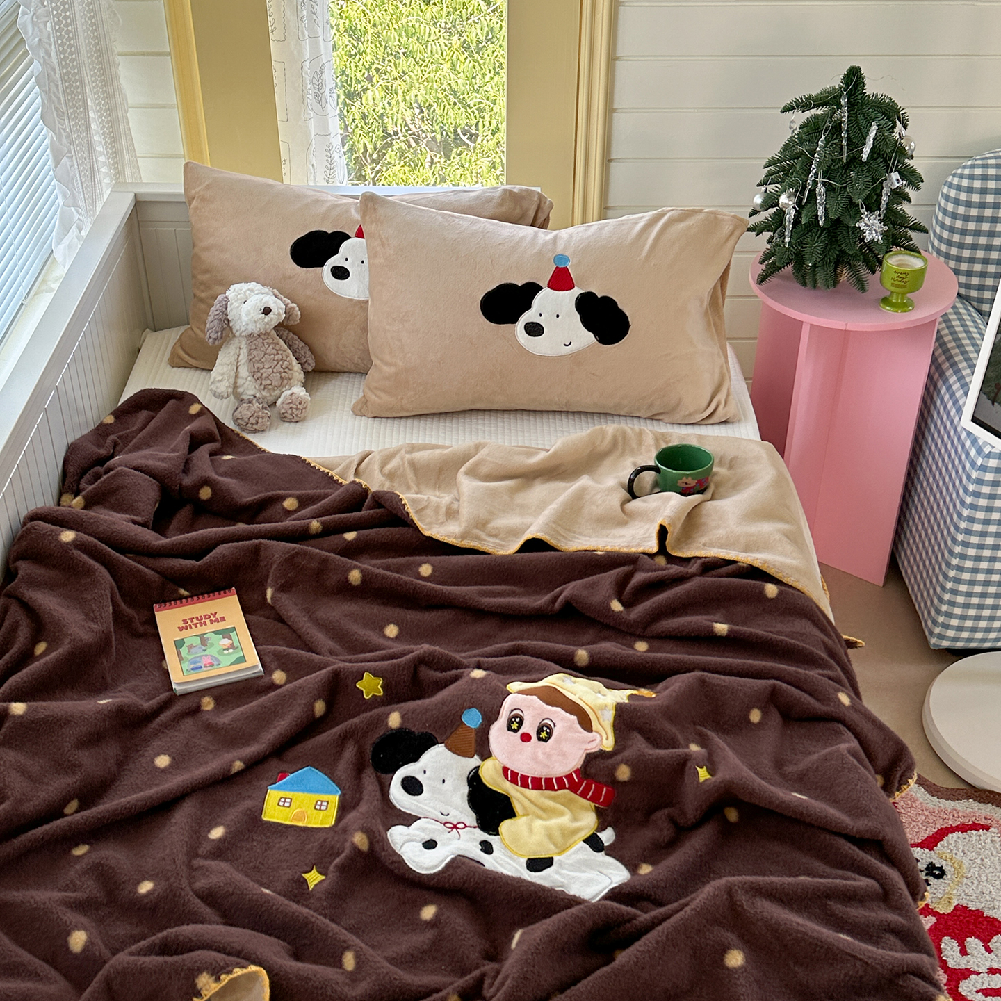 (总)柚子YOUTH 2025新款加厚牛奶绒卡通毛巾绣四件套-印加绣送同款毛毯,蛋糕小狗,公主猫,头套猫,兔兔花园,小伙伴,雪纳瑞