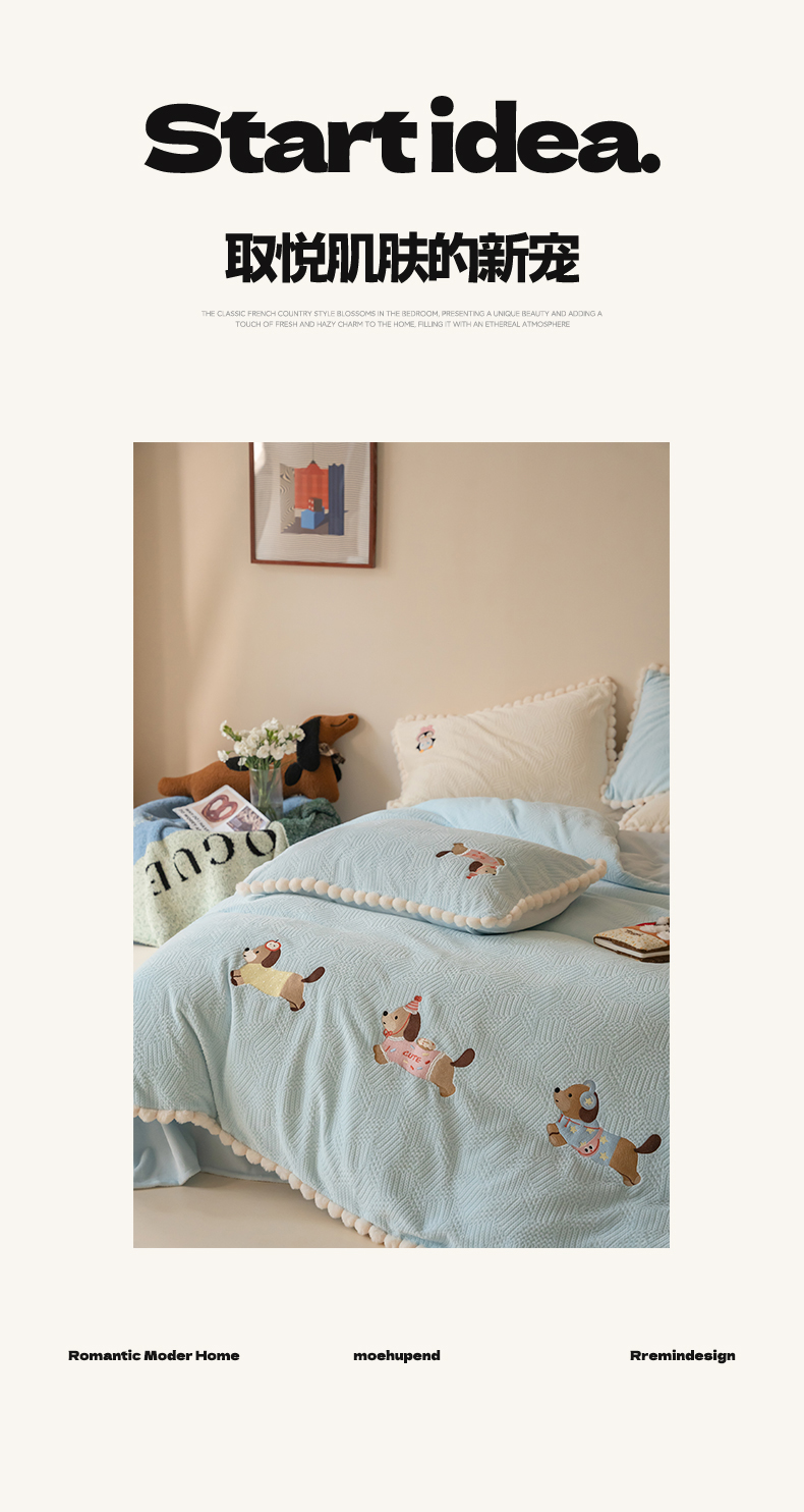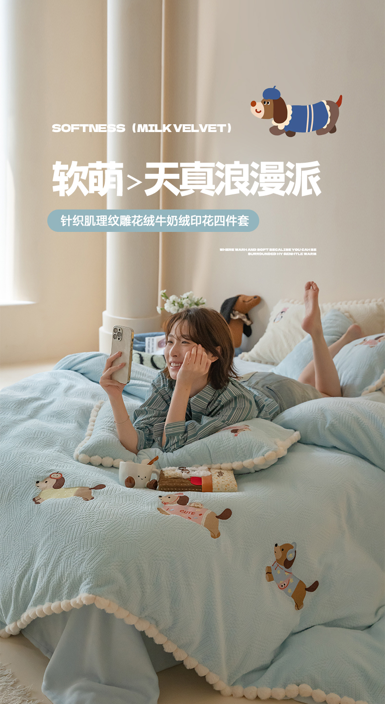圆岛家纺 2025新款针织肌理纹雕花立体牛奶绒刺绣四件套 腊肠小队