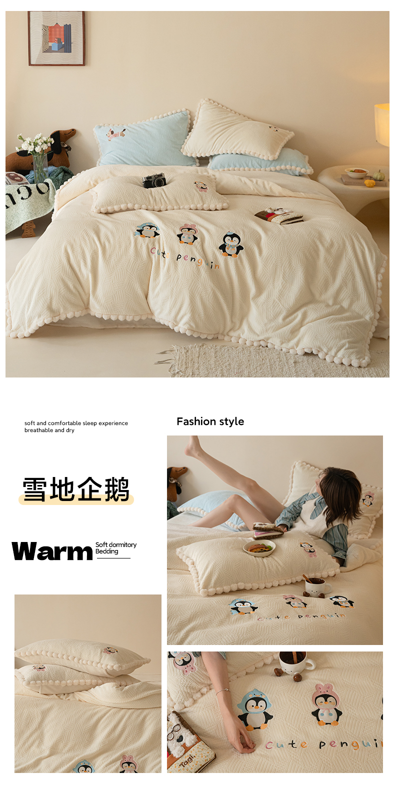 (总)圆岛家纺 2023新款可爱元气秋冬毛巾绣牛奶绒四件套,企鹅伙伴,玩偶猫