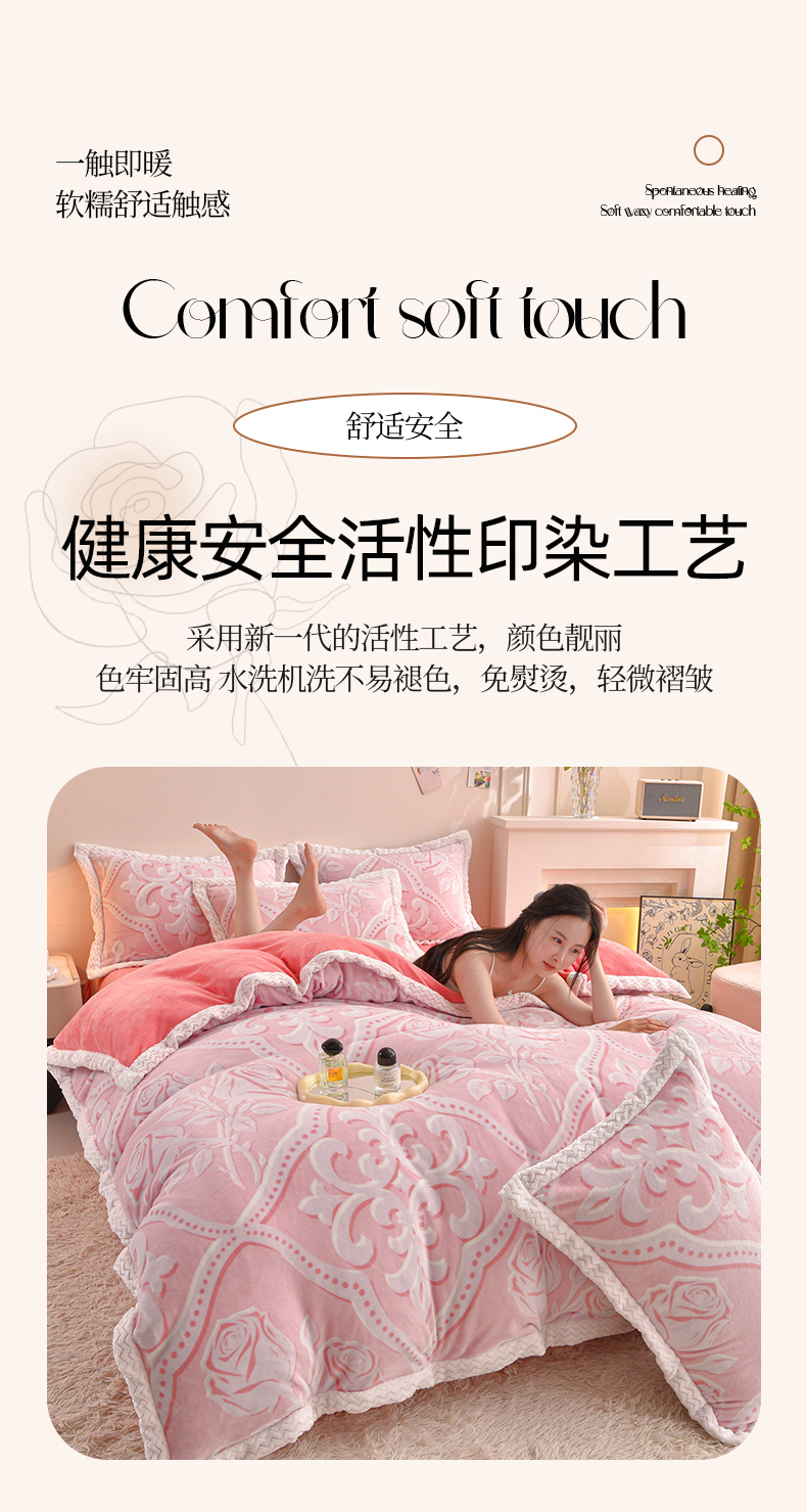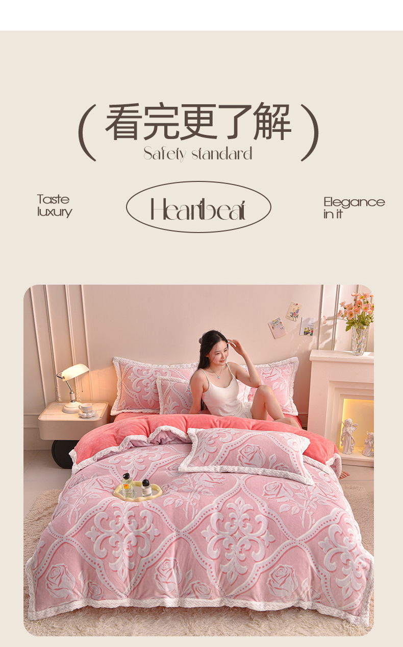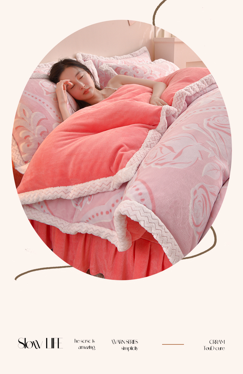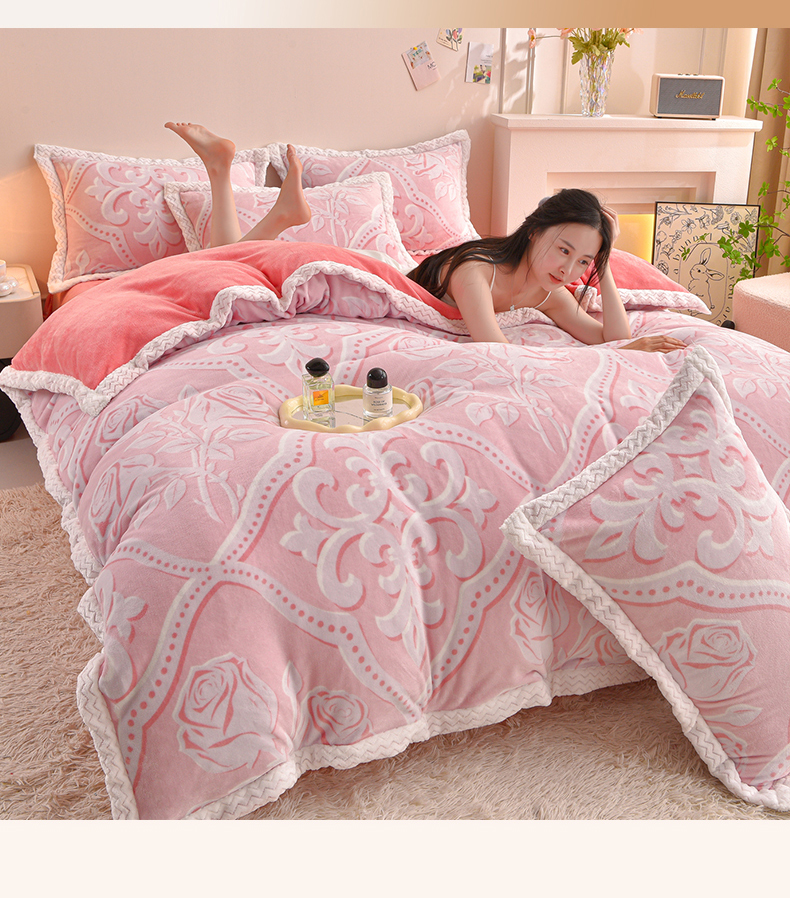 董成龙家纺 2025新款直播爆款牛奶绒四件套雕花压线款法莱绒四件套11 欧雅-粉