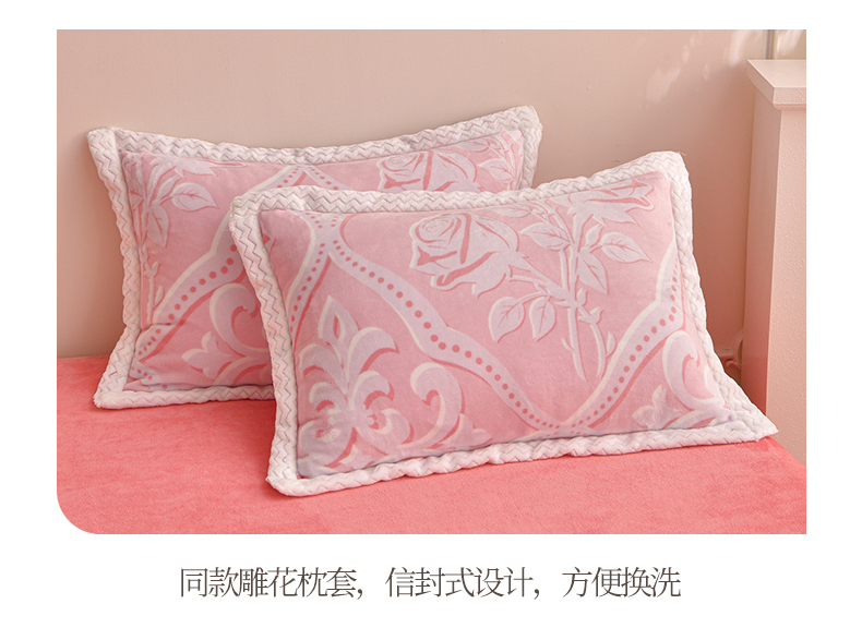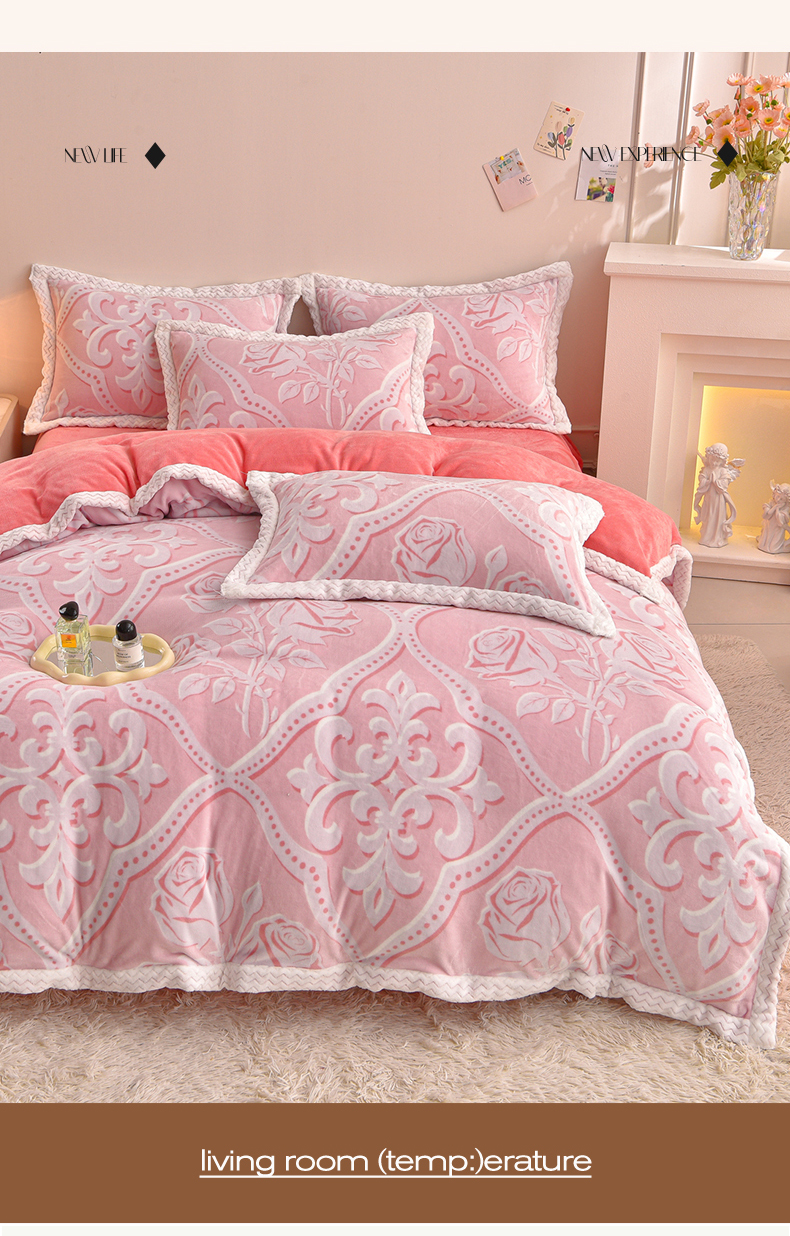 商品名称:董成龙家纺 2025新款直播爆款牛奶绒四件套雕花压线款法莱绒四件套11 欧雅-粉