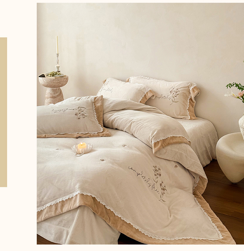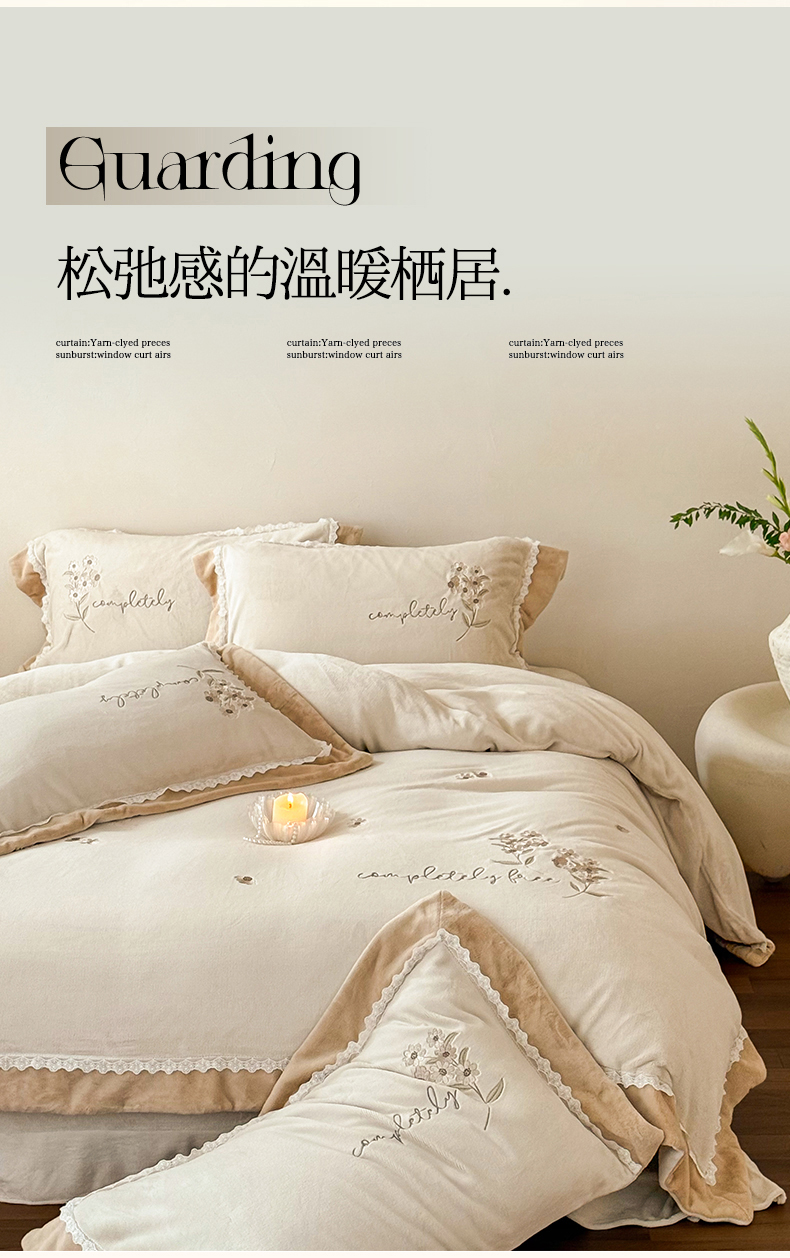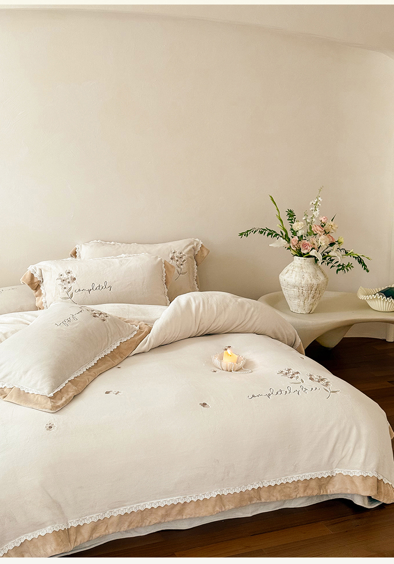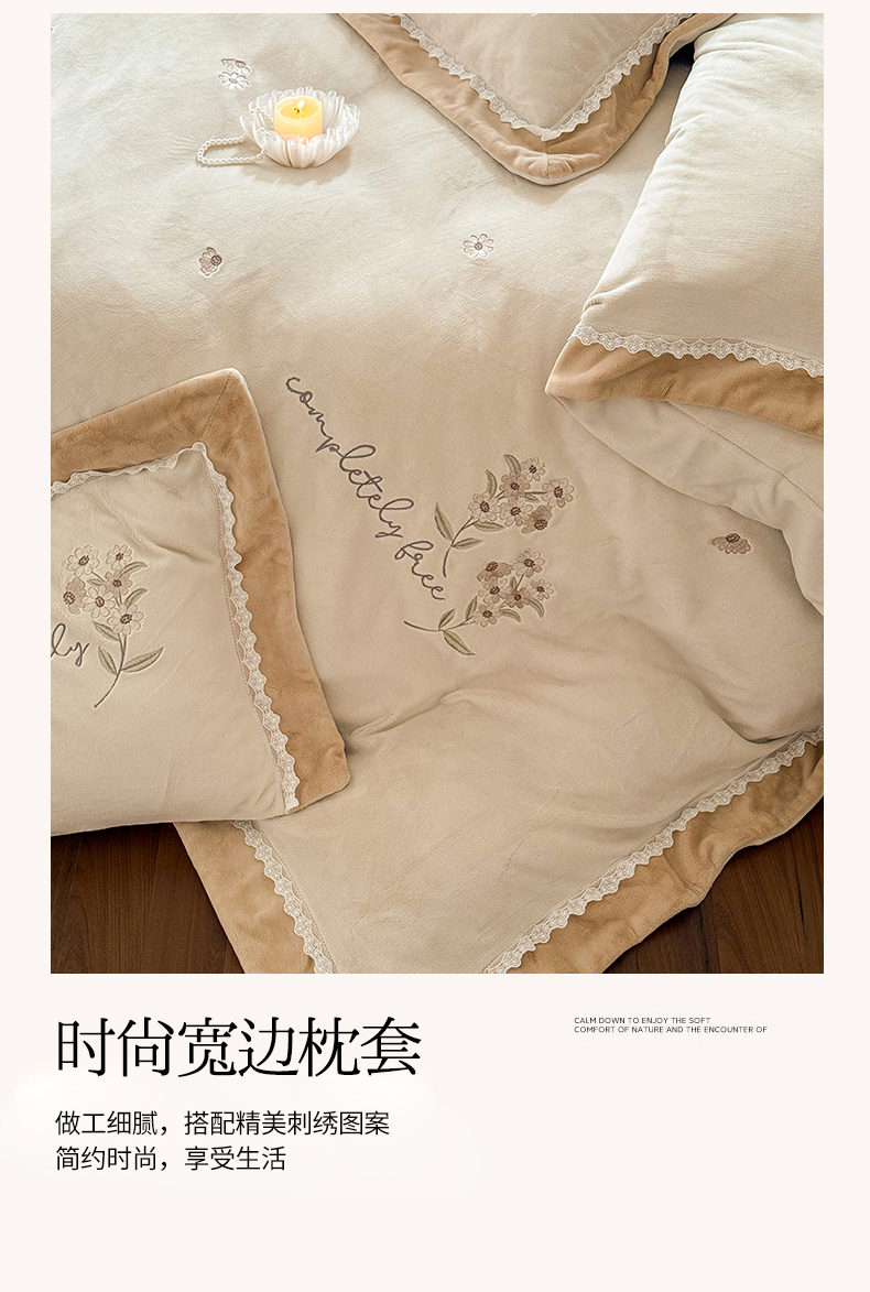 泽西家纺+V17798841158发大图 2025新品秋冬加厚保暖240克奶肤绒小清新花边宽边刺绣牛奶绒四件套-雏菊轻语 雏菊轻语-浅杏