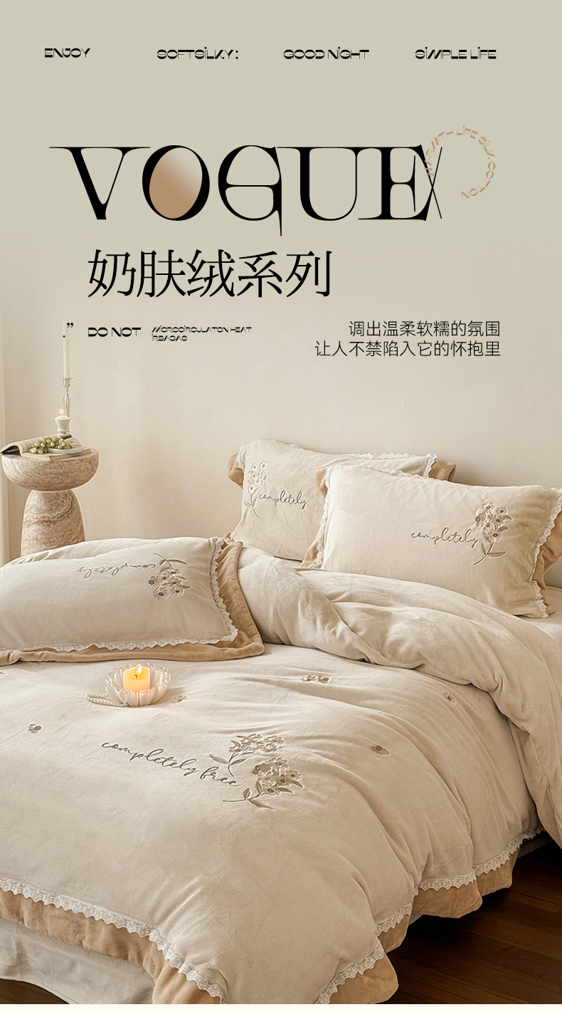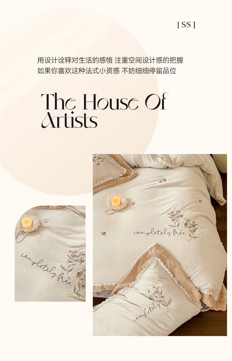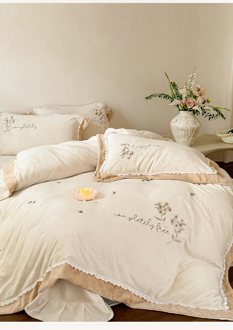 泽西家纺+V17798841158发大图 2025新品秋冬加厚保暖240克奶肤绒小清新花边宽边刺绣牛奶绒四件套-雏菊轻语 雏菊轻语-浅杏