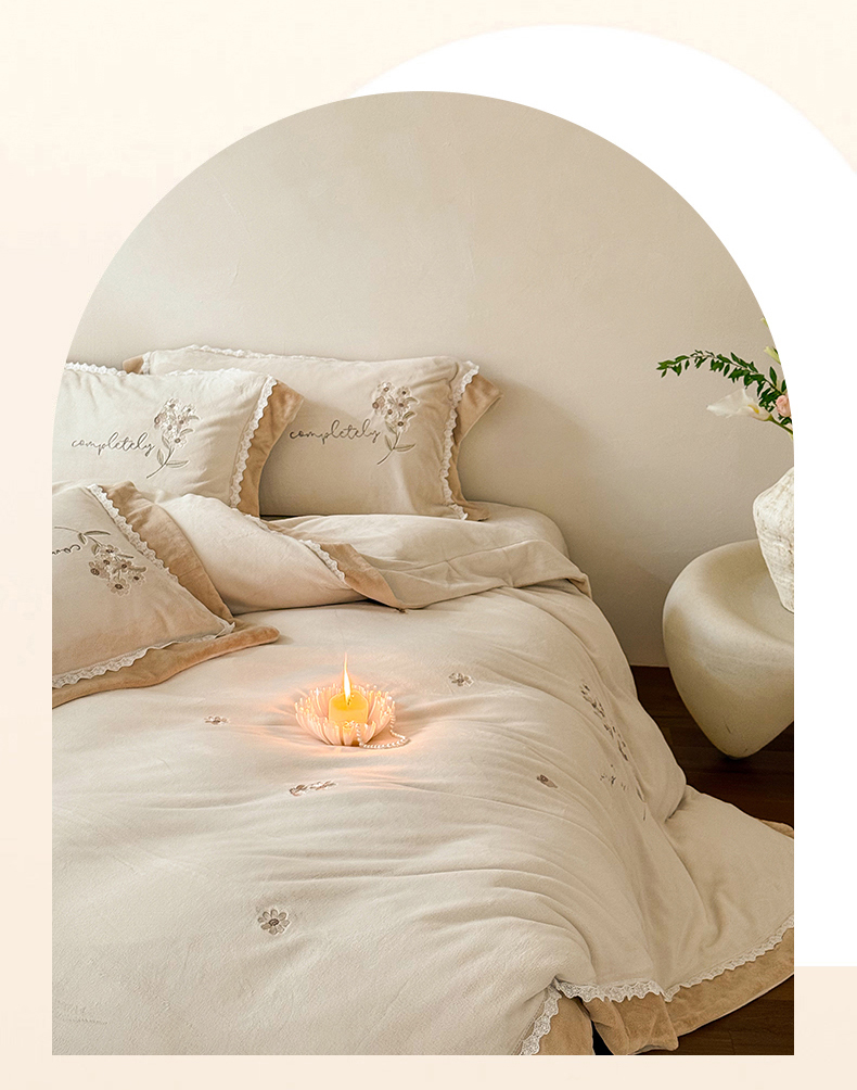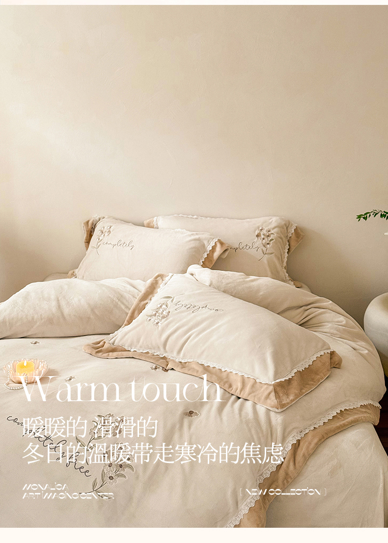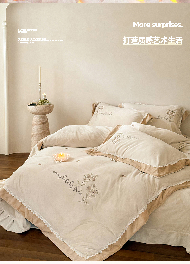 商品名称:泽西家纺+V17798841158发大图 2025新品秋冬加厚保暖240克奶肤绒小清新花边宽边刺绣牛奶绒四件套-雏菊轻语 雏菊轻语-浅杏