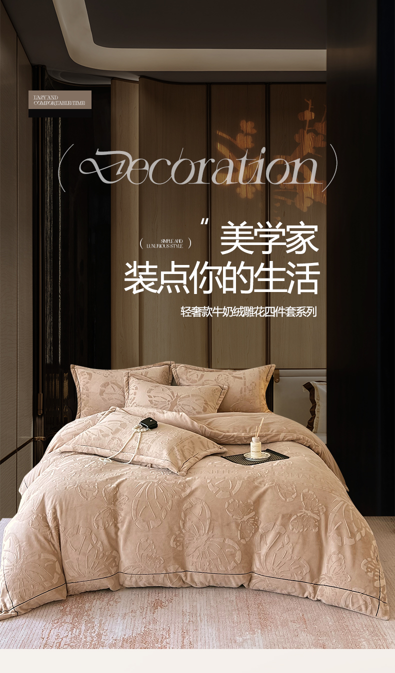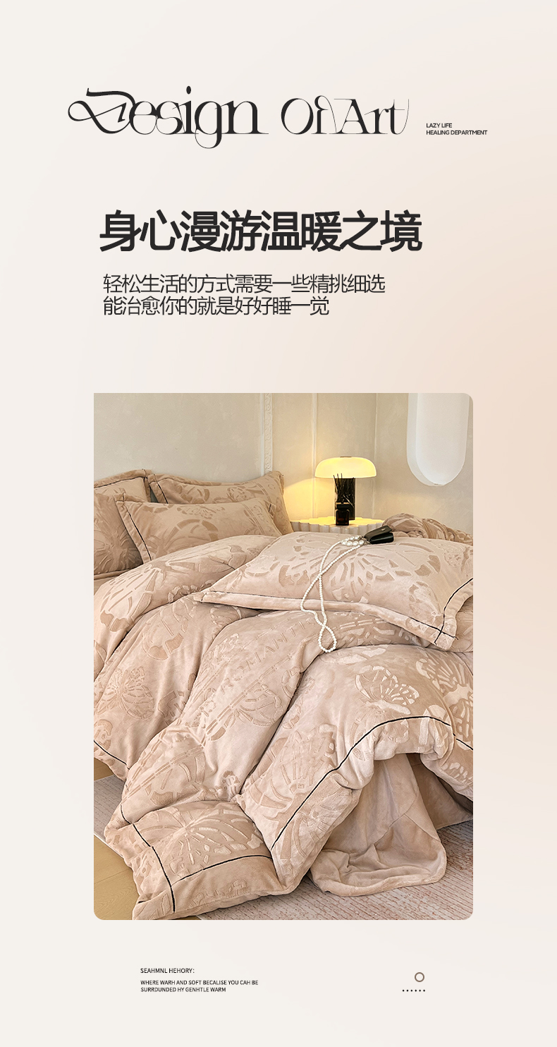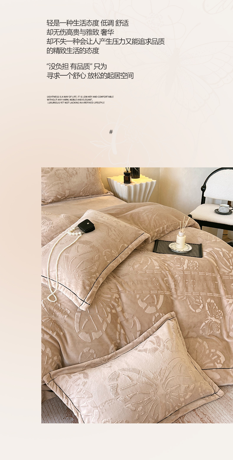 锦彩家居 2025新款高克重牛奶绒雕花四件套-蝶梦 蝶梦-可可棕