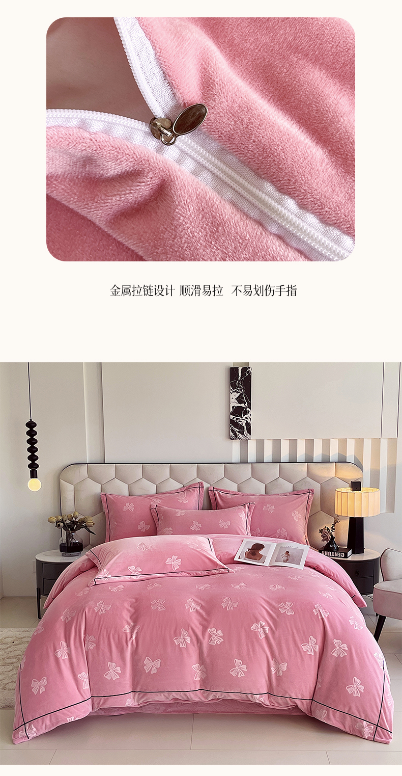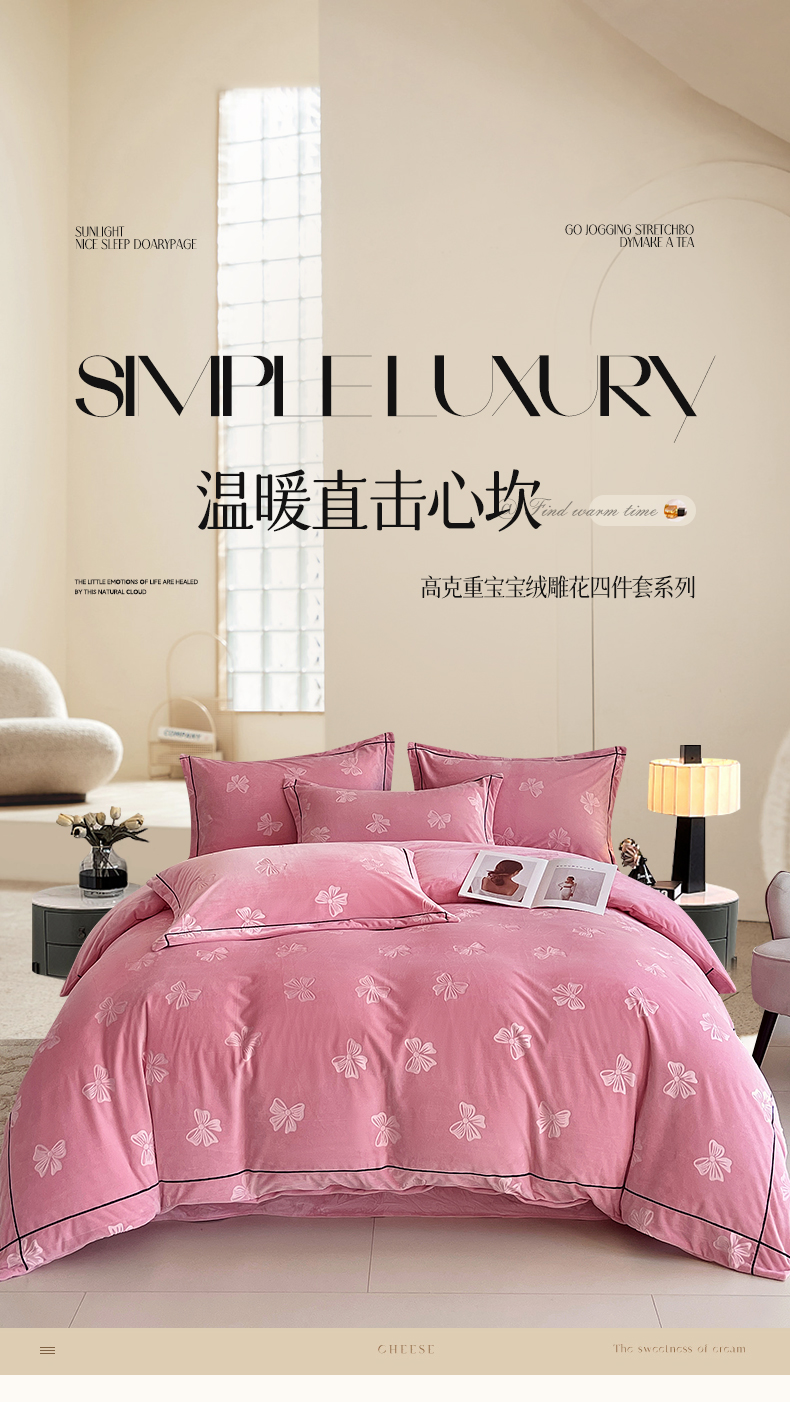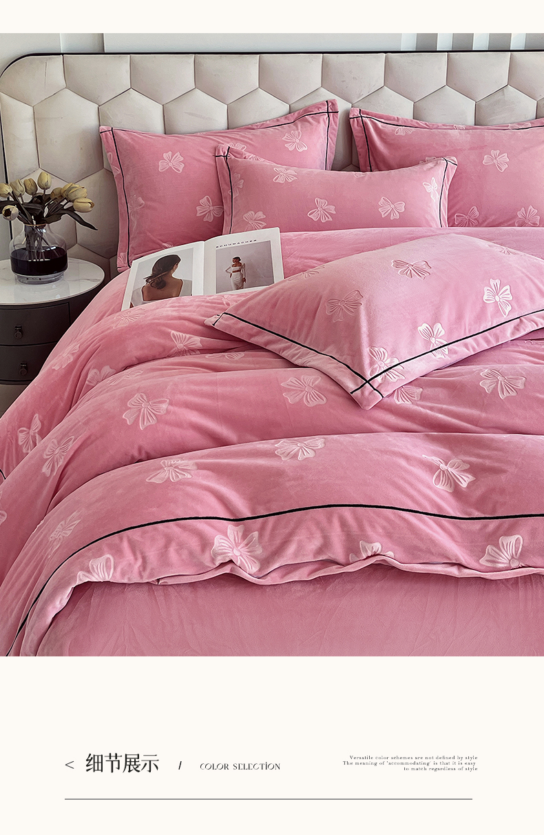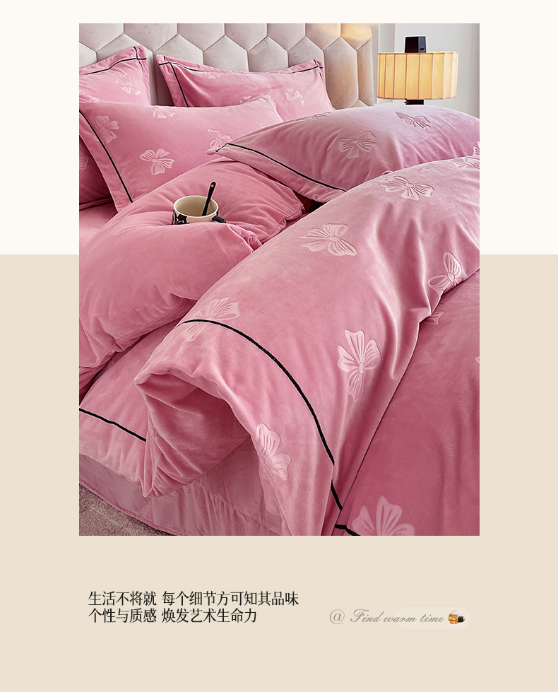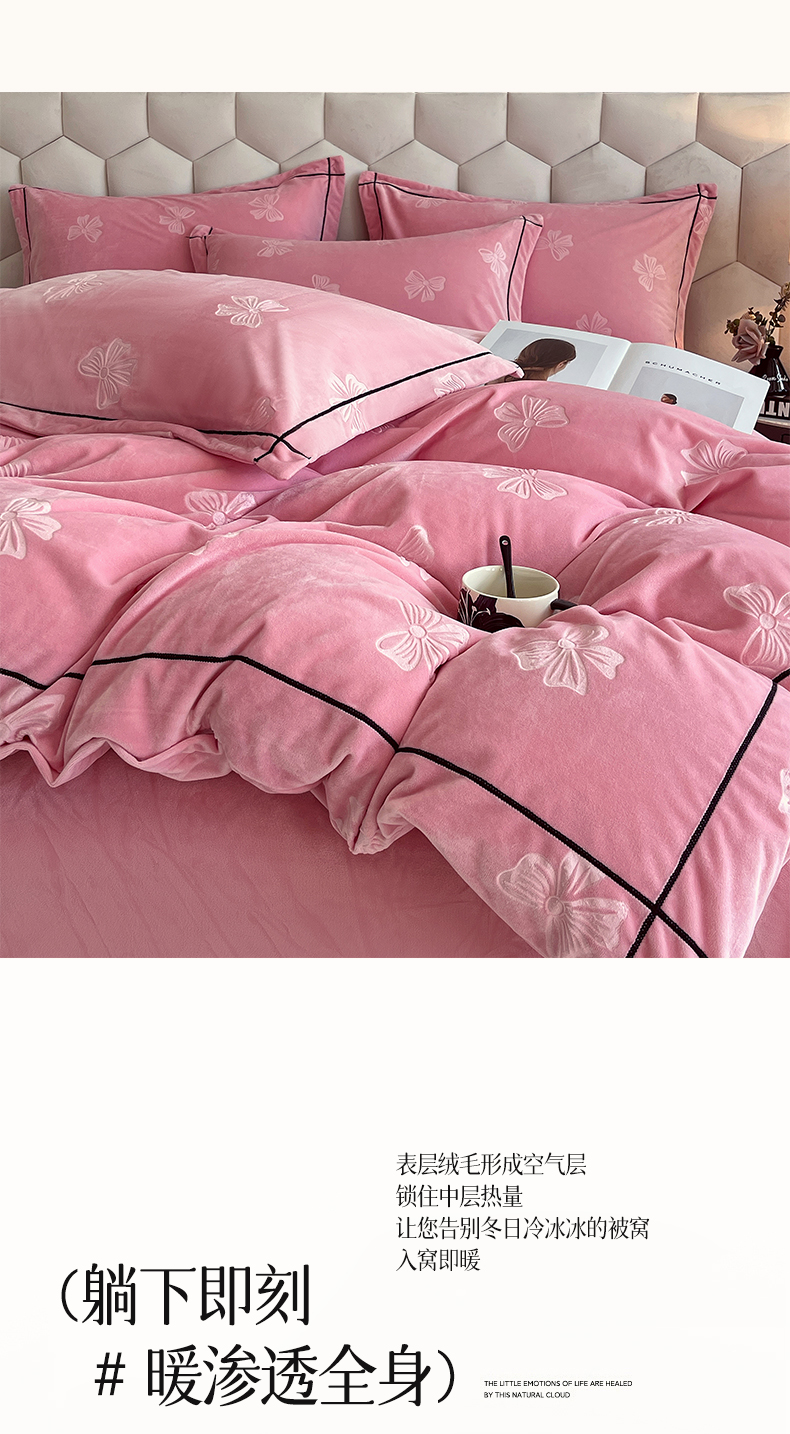 商品名称:锦彩家居 2025新款高克重牛奶绒婴儿绒雕花四件套-暮光花园 暮光花园-苏梅粉