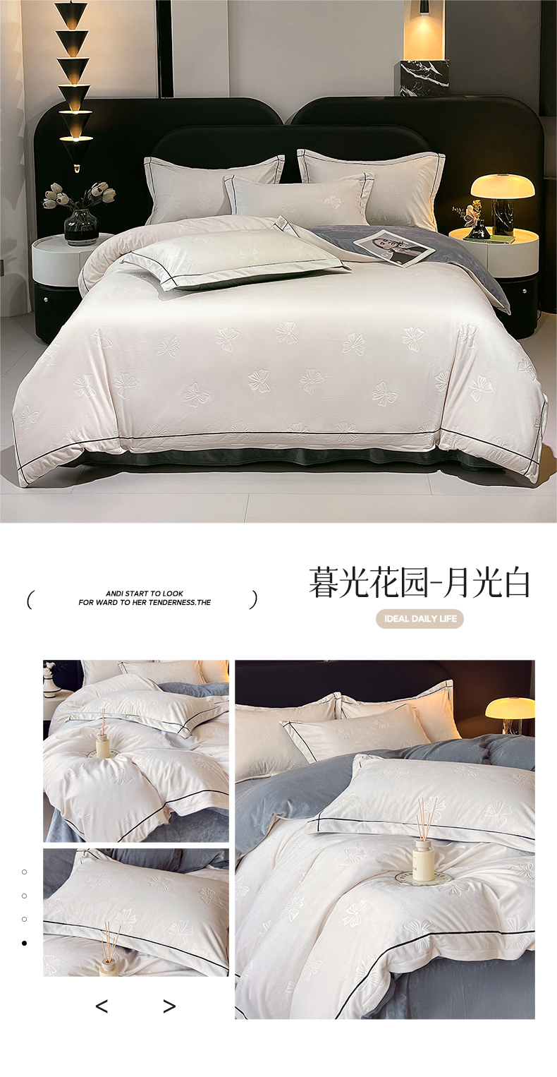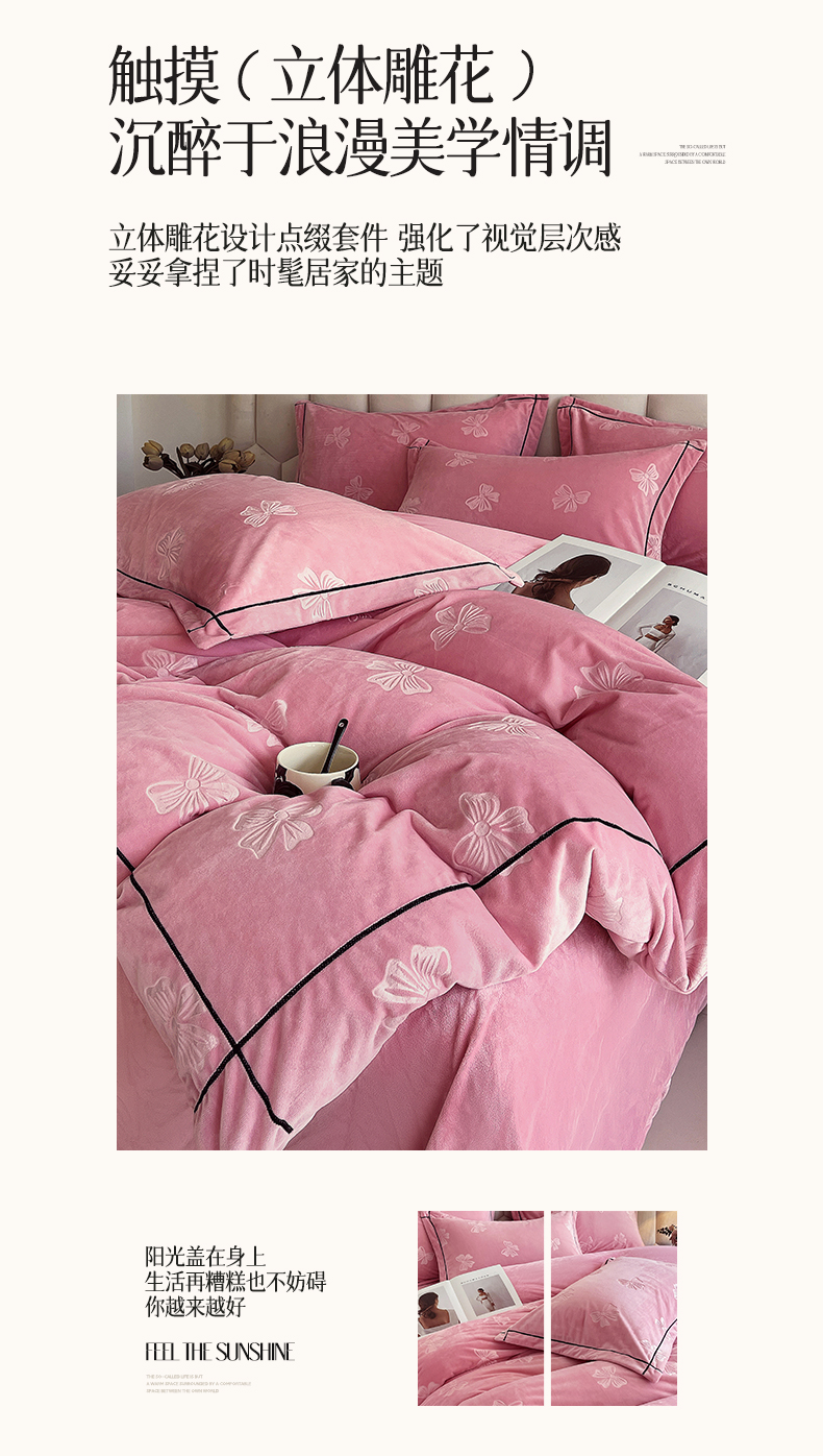 锦彩家居 2025新款高克重牛奶绒婴儿绒雕花四件套-暮光花园 暮光花园-苏梅粉