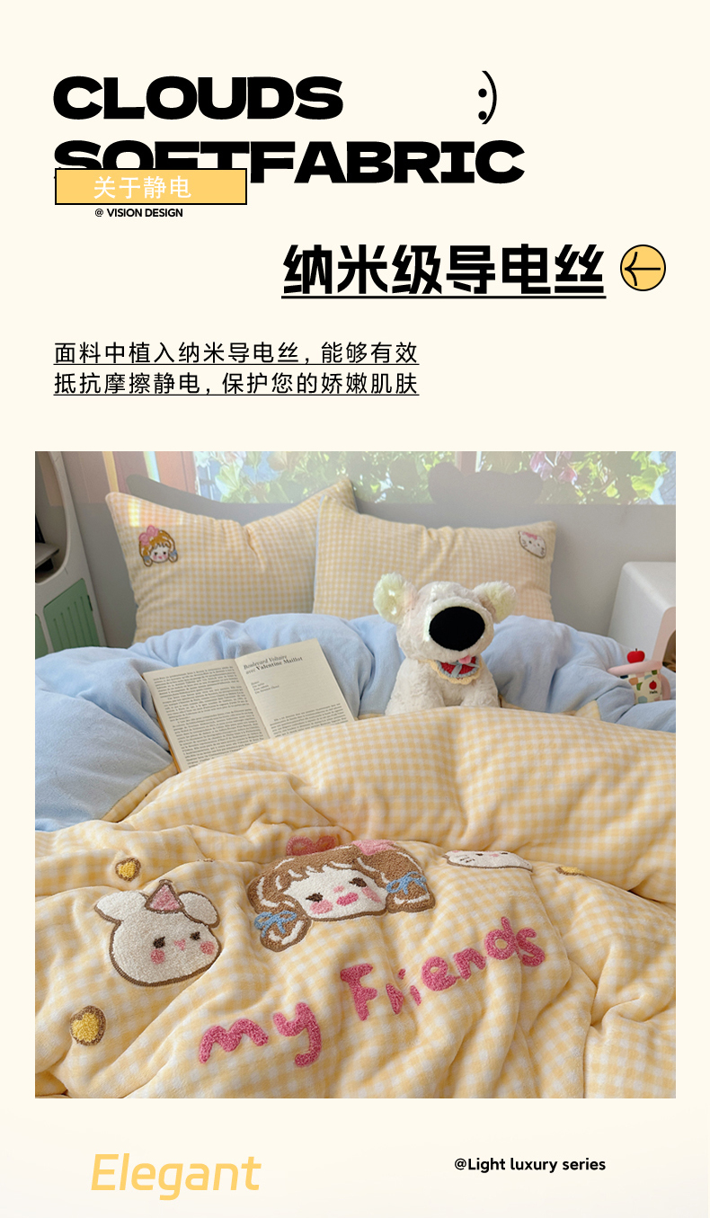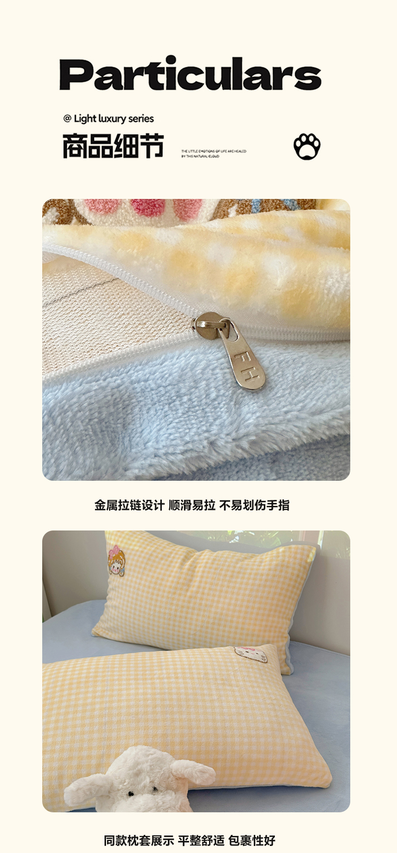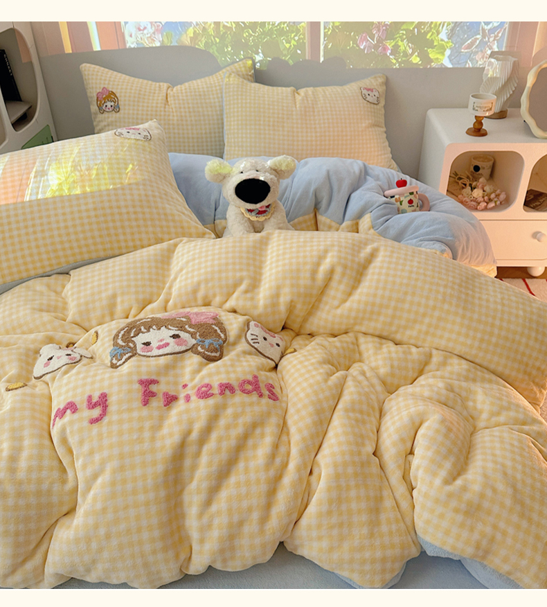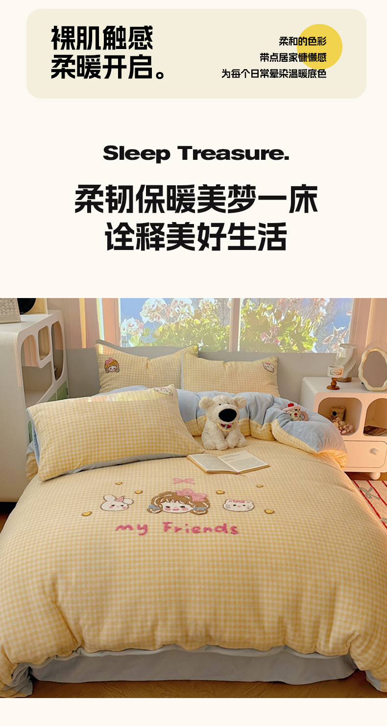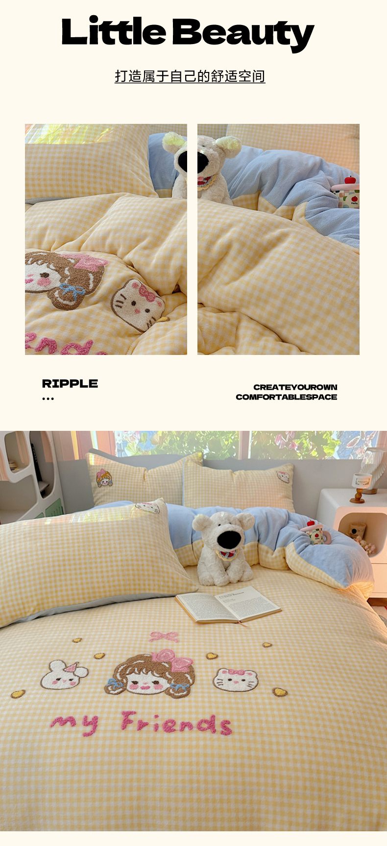 当前位置: 91家纺网 > 商品网购 > 床品套件 > 四件套 > 牛奶绒四件套 > 小叮当家纺仓储工厂店 买家秀 爆款花型2025新款秋冬保暖牛奶绒卡通小清新毛巾绣系列四件套 黄格小女孩