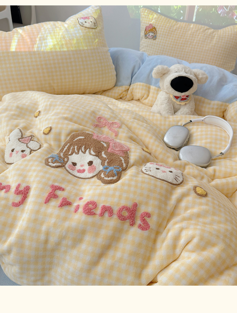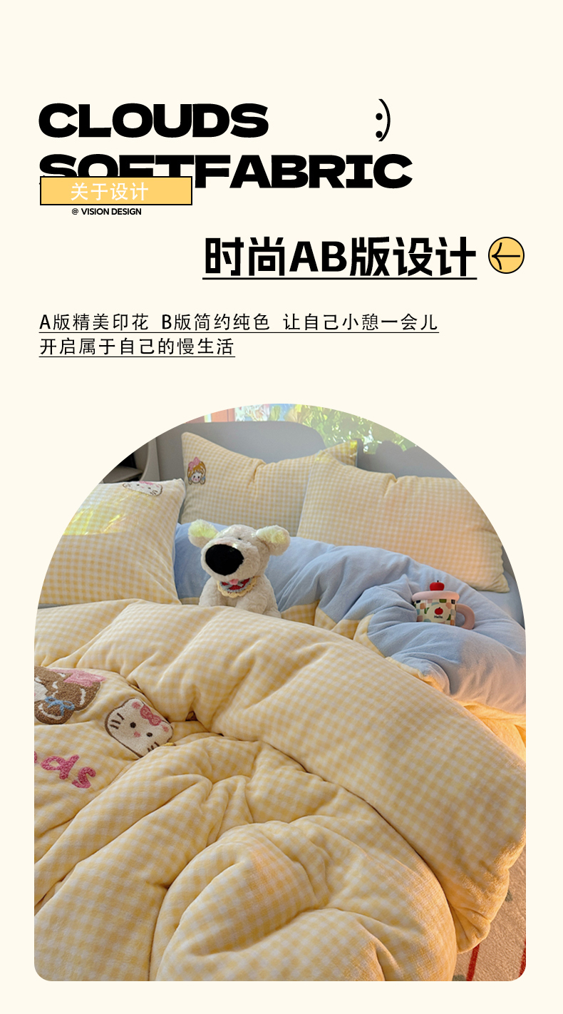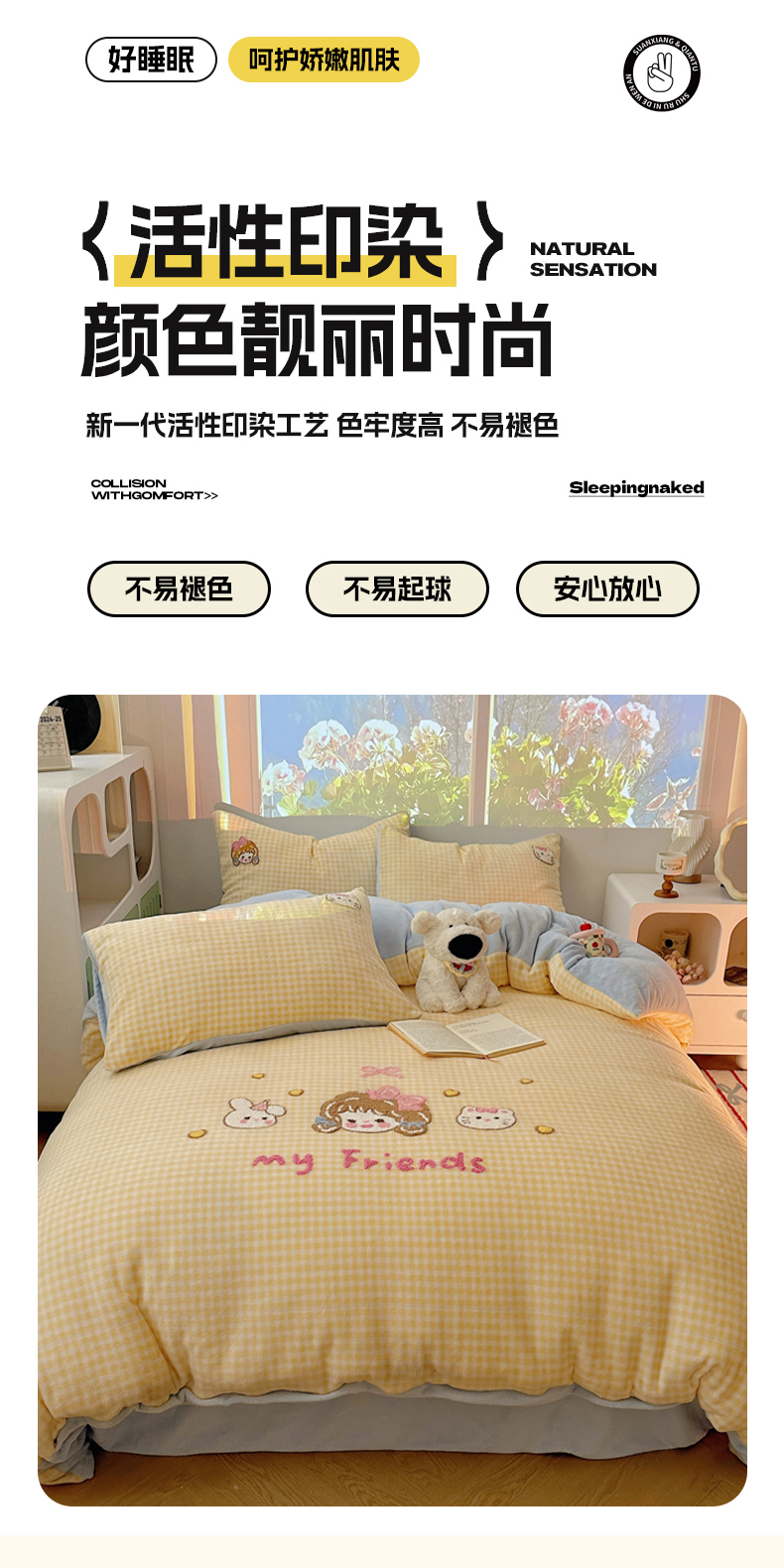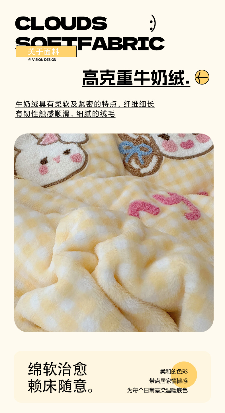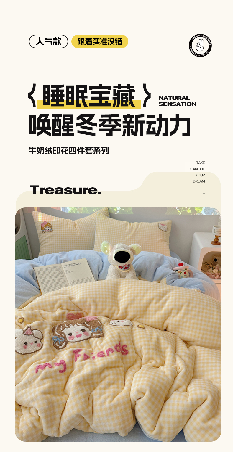 当前位置: 91家纺网 > 商品网购 > 床品套件 > 四件套 > 牛奶绒四件套 > 小叮当家纺仓储工厂店 买家秀 爆款花型2025新款秋冬保暖牛奶绒卡通小清新毛巾绣系列四件套 黄格小女孩