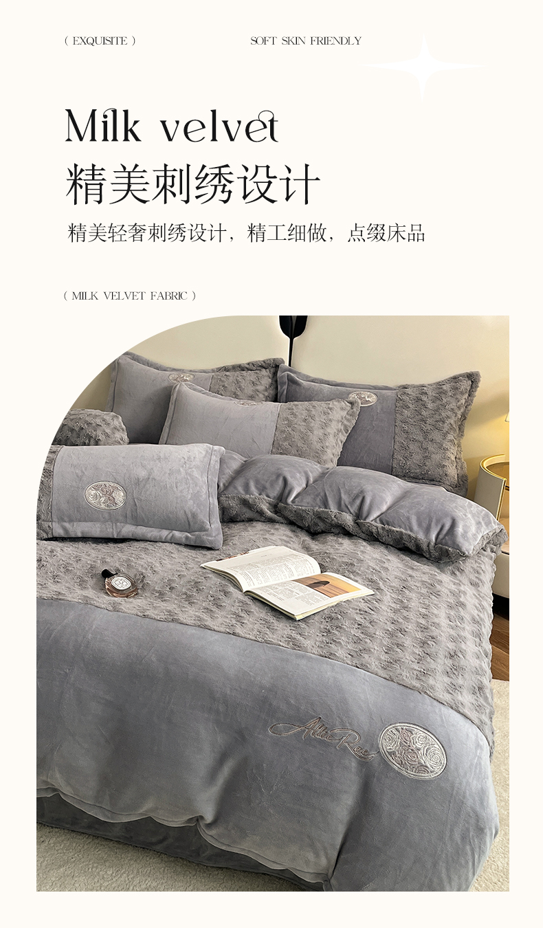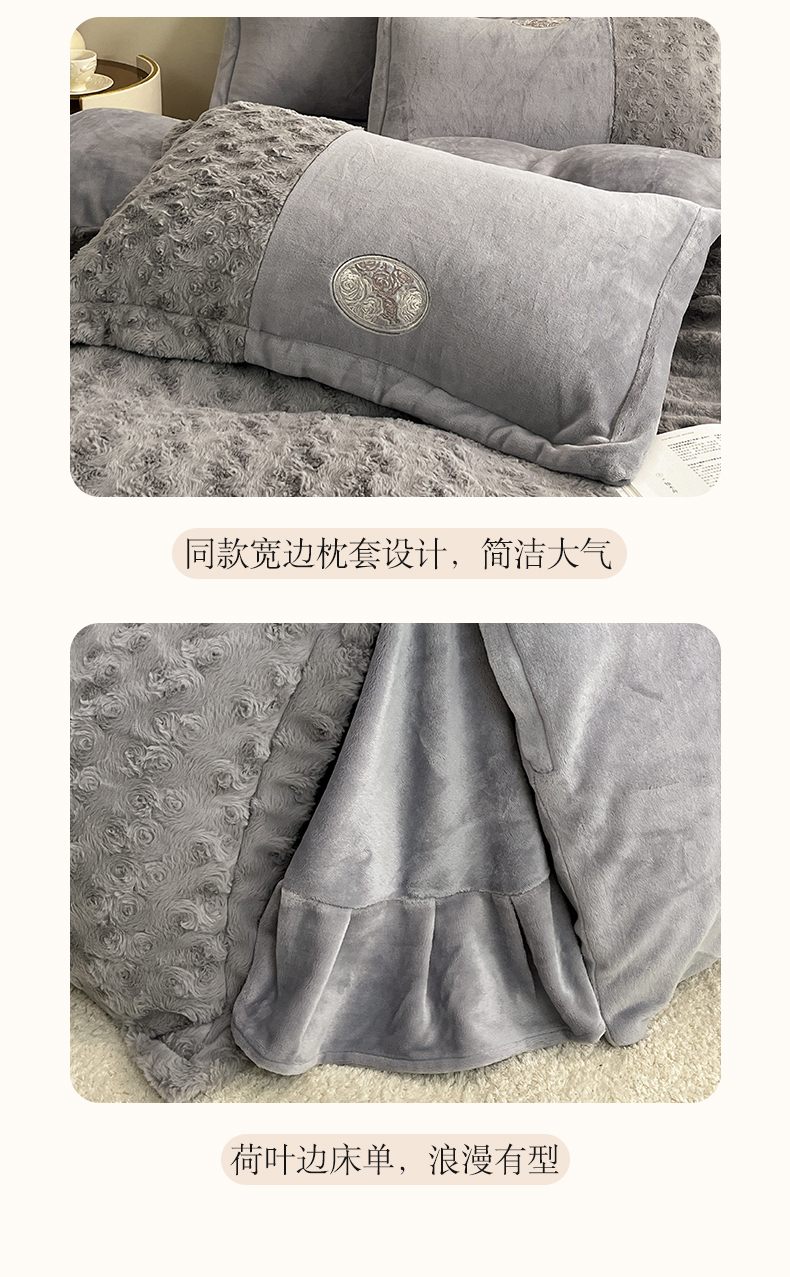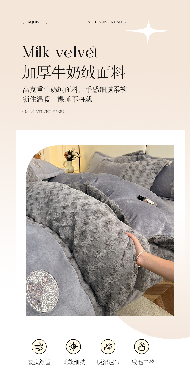 商品名称:梓之赫 2025新款全消光牛奶绒四件套-浪漫玫瑰 浪漫玫瑰-高级灰