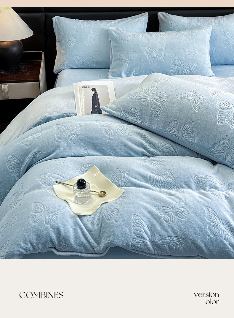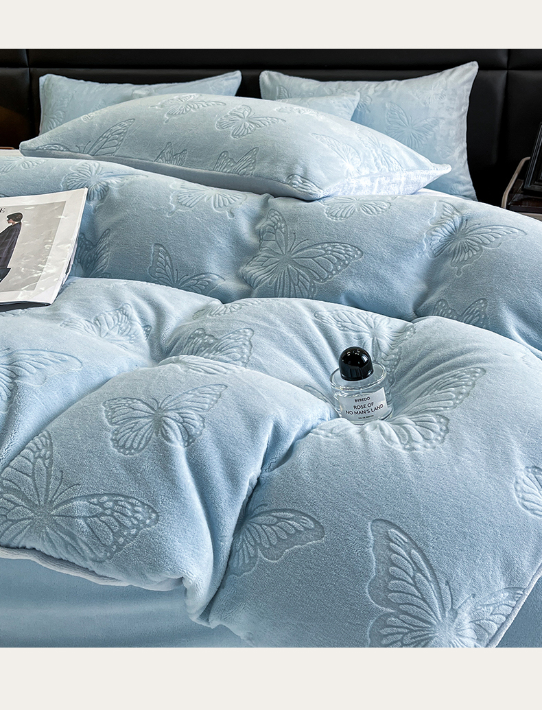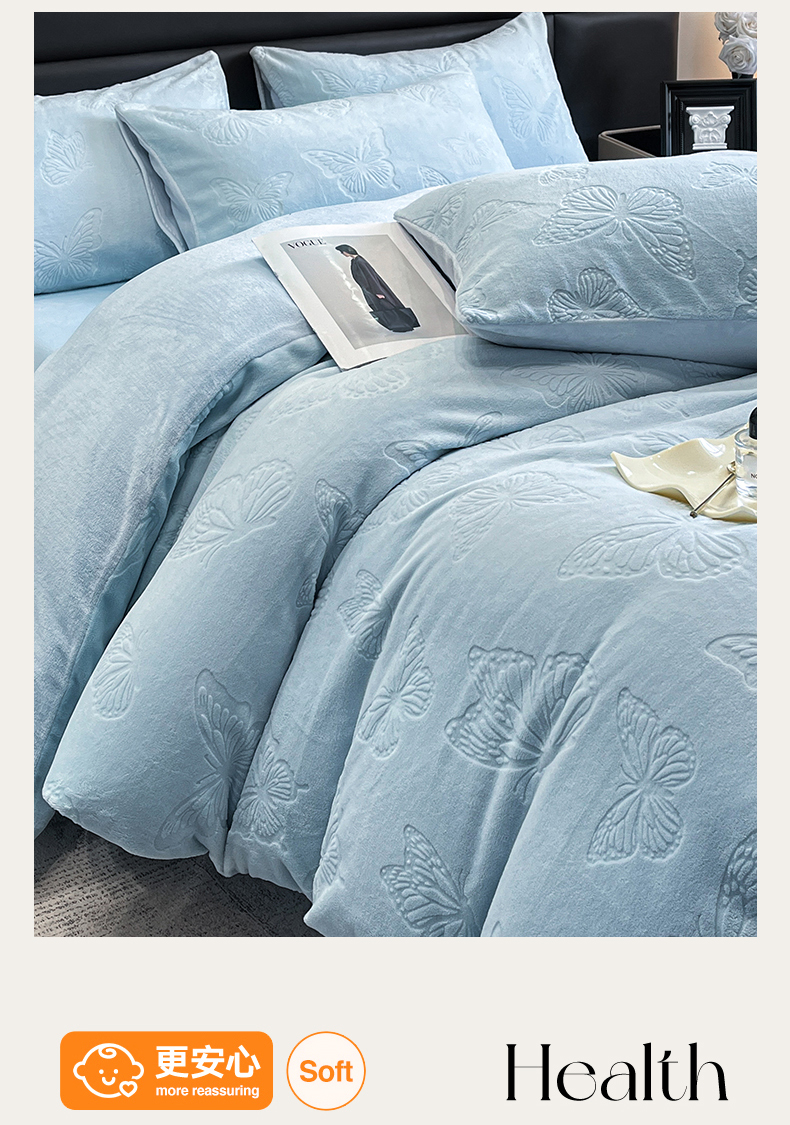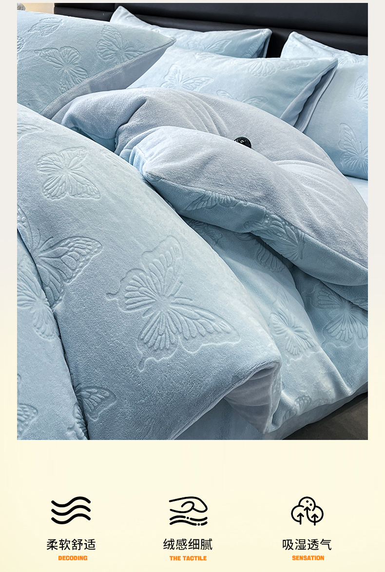 商品名称:星座家纺 2025新款牛奶绒雕花四件套 蝴蝶翩翩-蓝