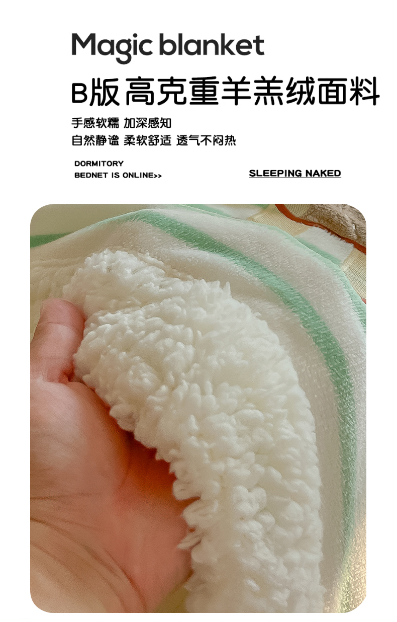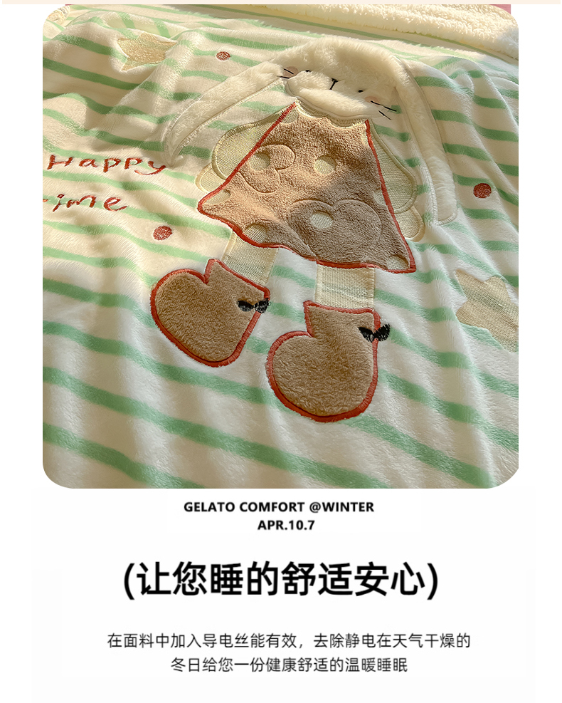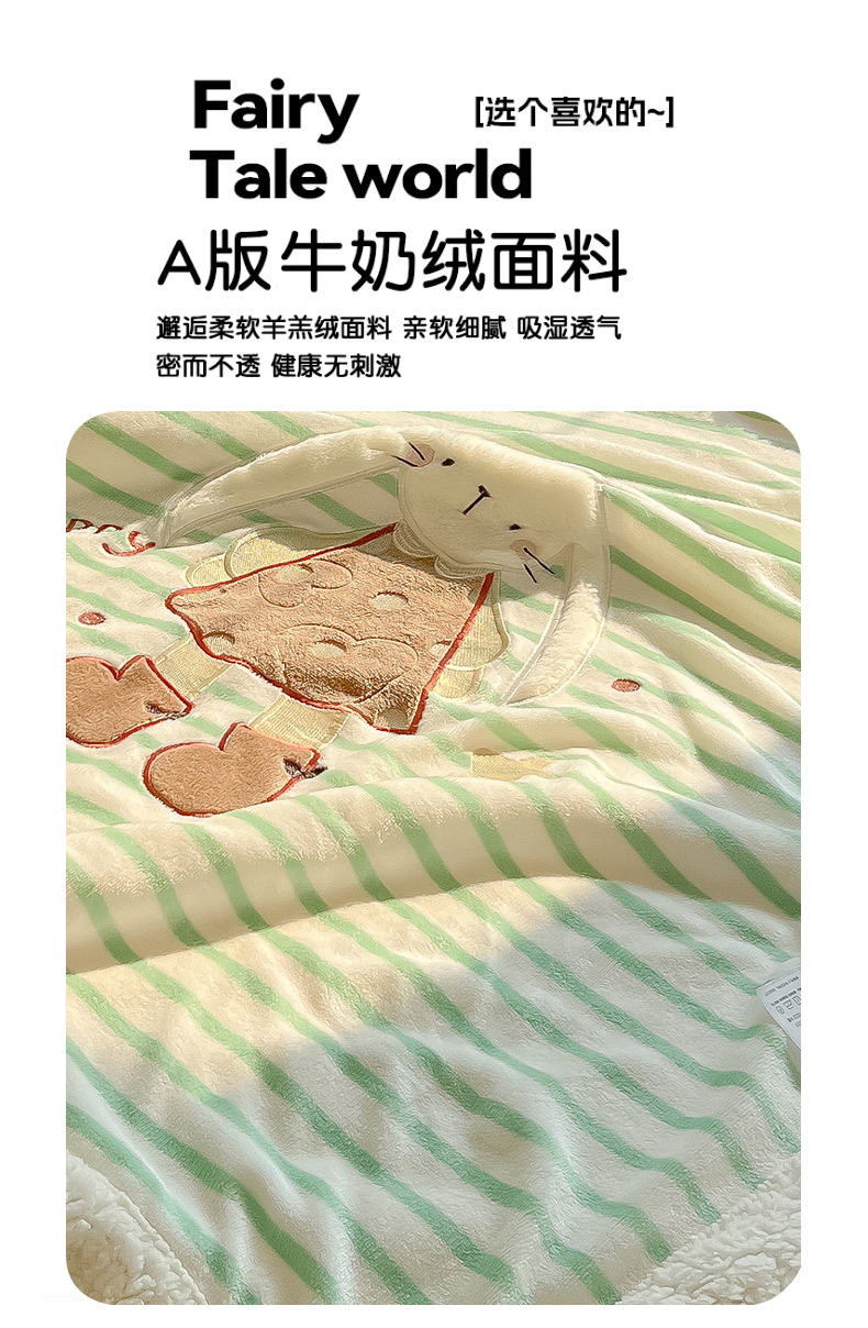 商品名称:子钦家纺 2025新款牛奶绒条纹贴布绣翻边毛毯 皇冠兔-绿条纹
