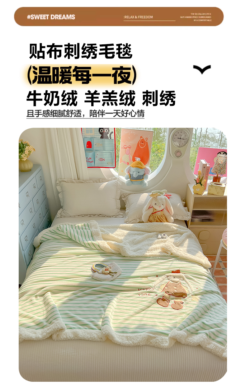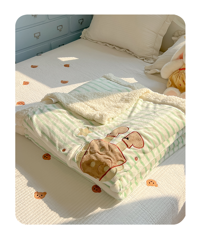 子钦家纺 2025新款牛奶绒条纹贴布绣翻边毛毯 皇冠兔-绿条纹
