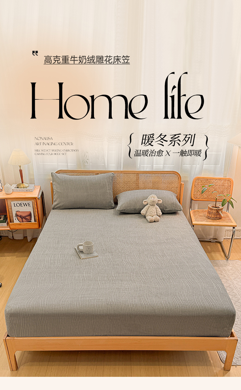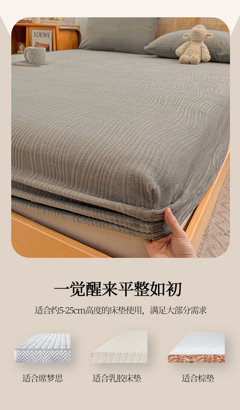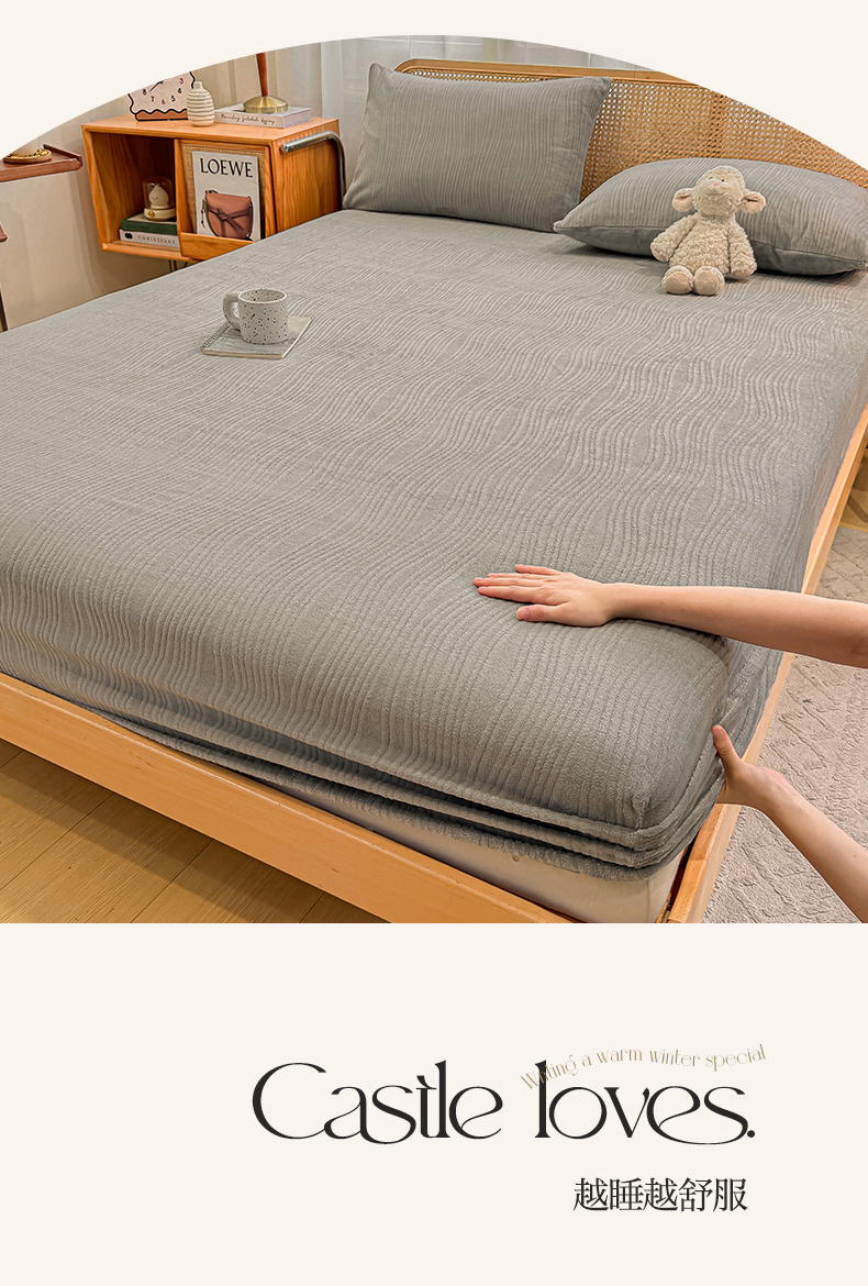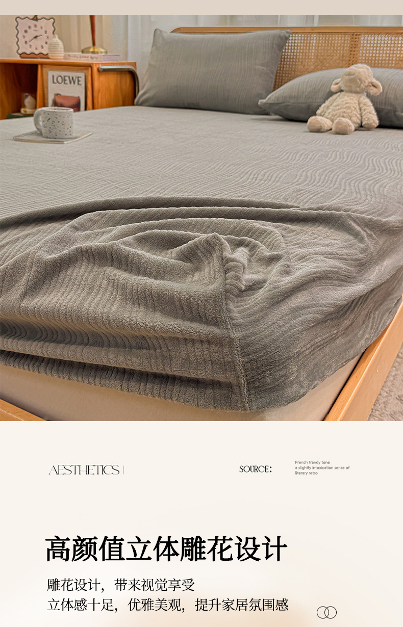 灰鲸 2025新款纯色简约高克重雕花牛奶绒单品床笠 温妮-绅士灰