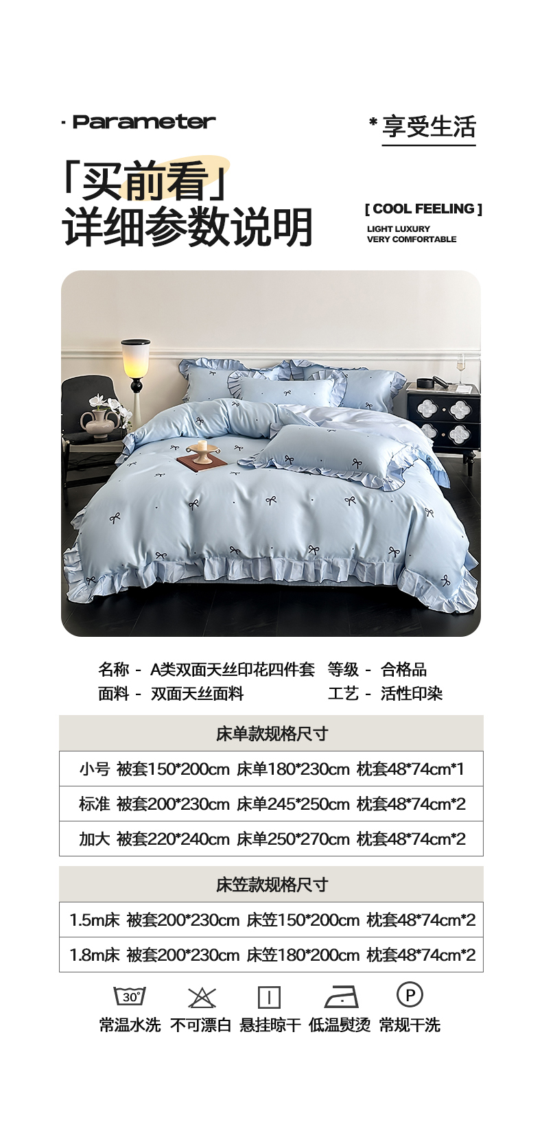 当前位置: 91家纺网 > 商品网购 > 床品套件 > 四件套 > 其它四件套 > 置顶家纺 2025新款初心蝴蝶结水洗天丝印花四件套 蝴蝶结-天空蓝