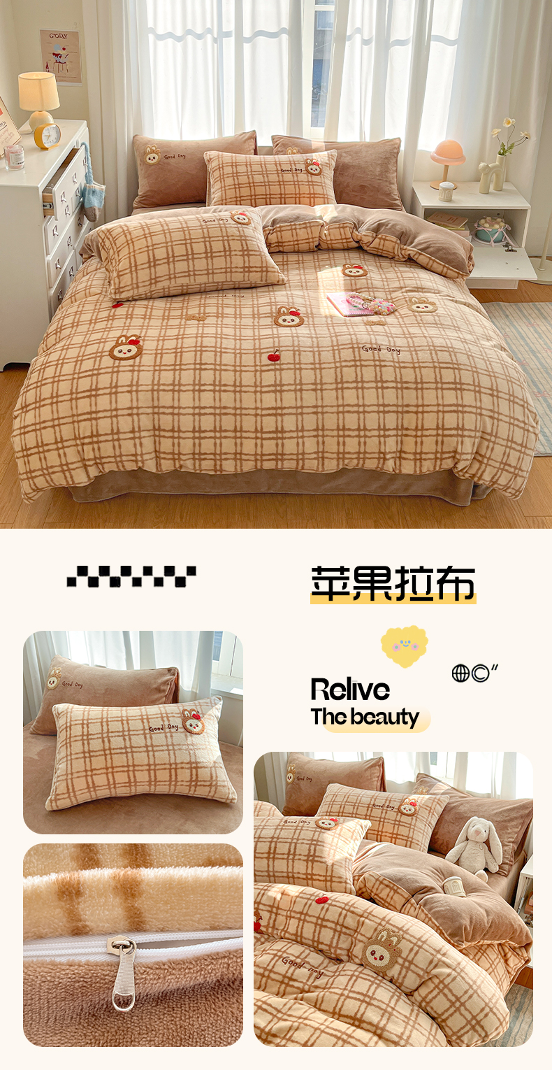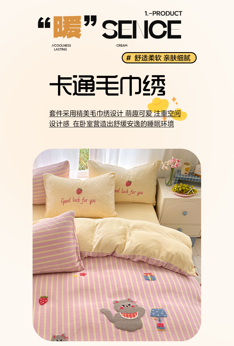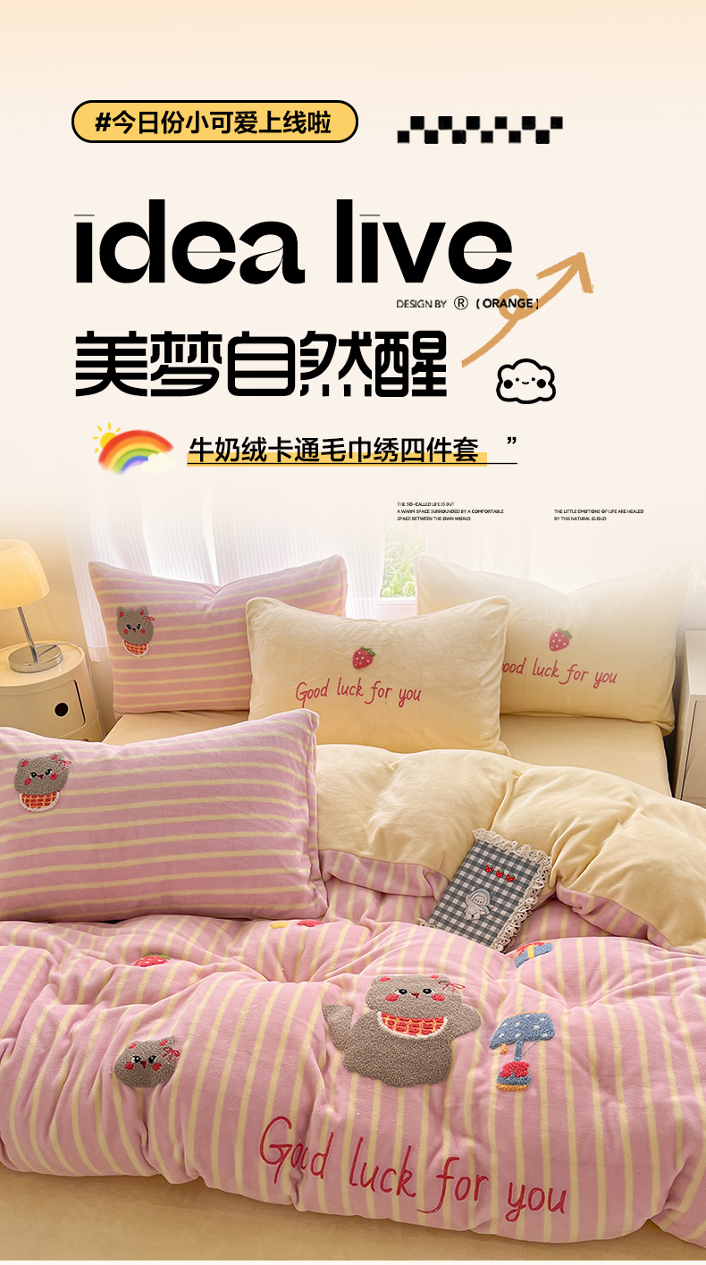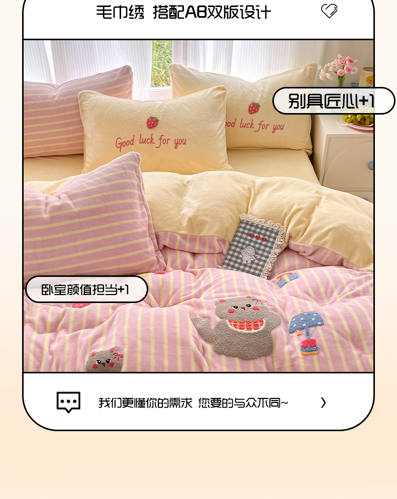 (总)如一 2025新款卡通毛巾绣系列牛奶绒四件套,卡皮柿子,爱心天使,豹纹黑皮,草莓灰猫,蛋糕小狗,粉格小猫,海绵宝宝,快乐企鹅,拉布饼干,蓝格黑猫,领结粉兔,苹果拉布,竖条西高,晚安小象,星星宝贝,星星木马,星星派对,星星苹果,星月猫咪,樱桃黑猫