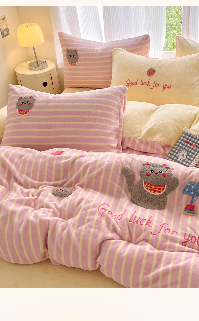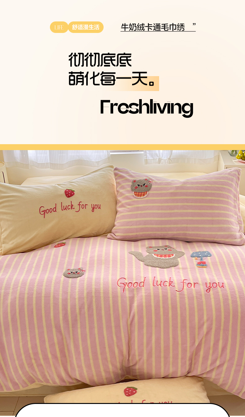 如一 2025新款卡通毛巾绣系列牛奶绒四件套 草莓灰猫