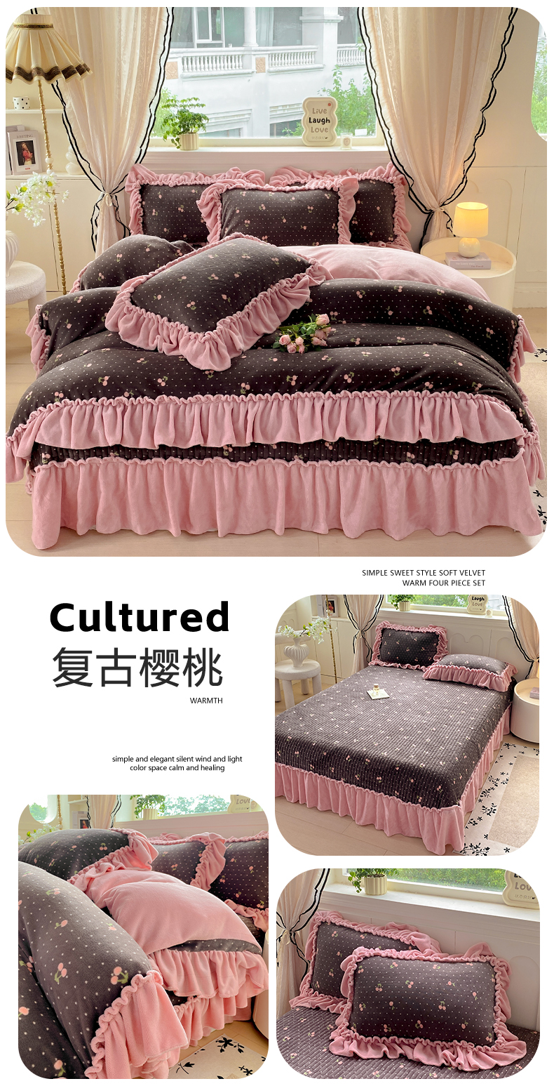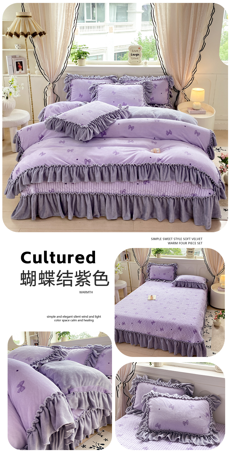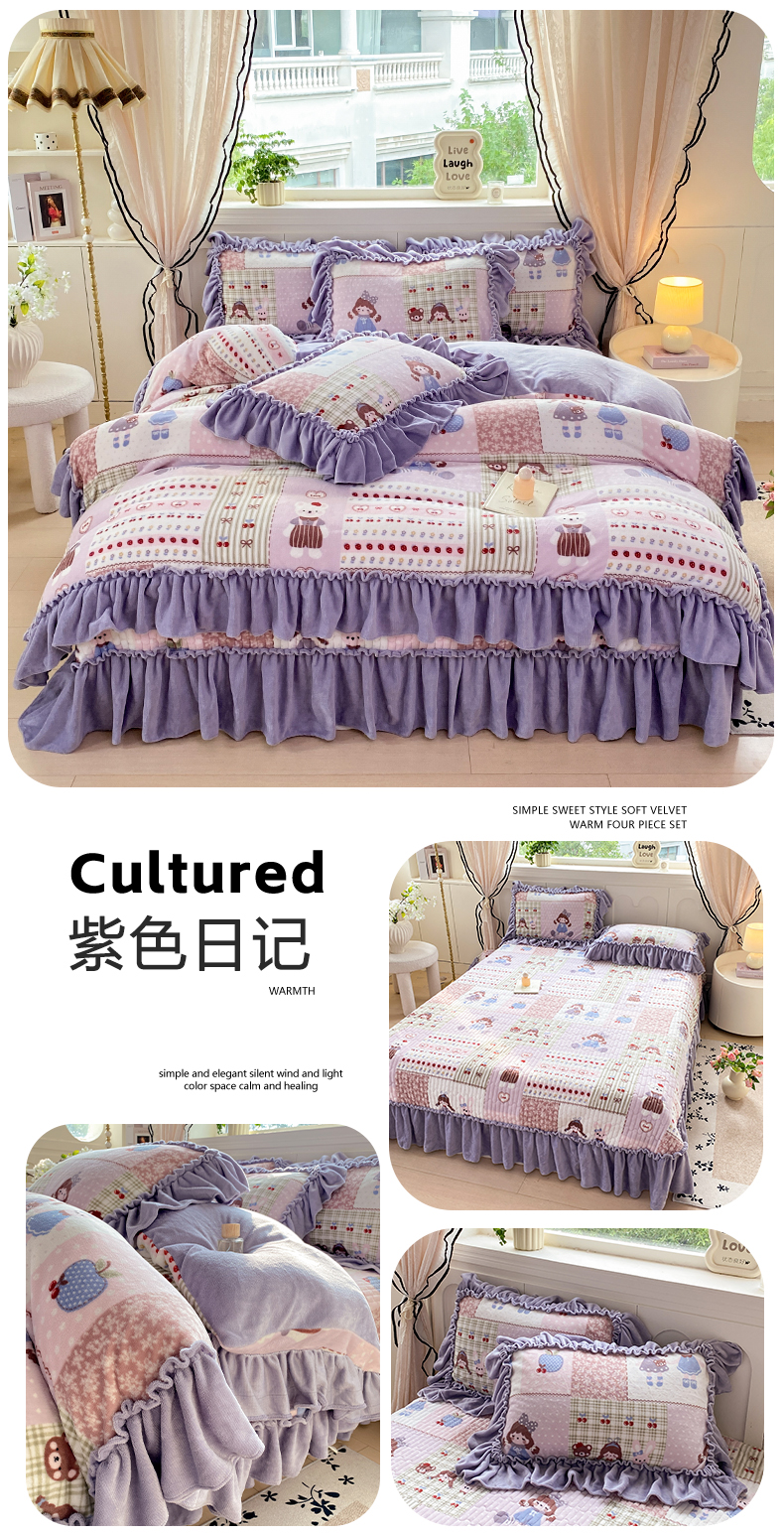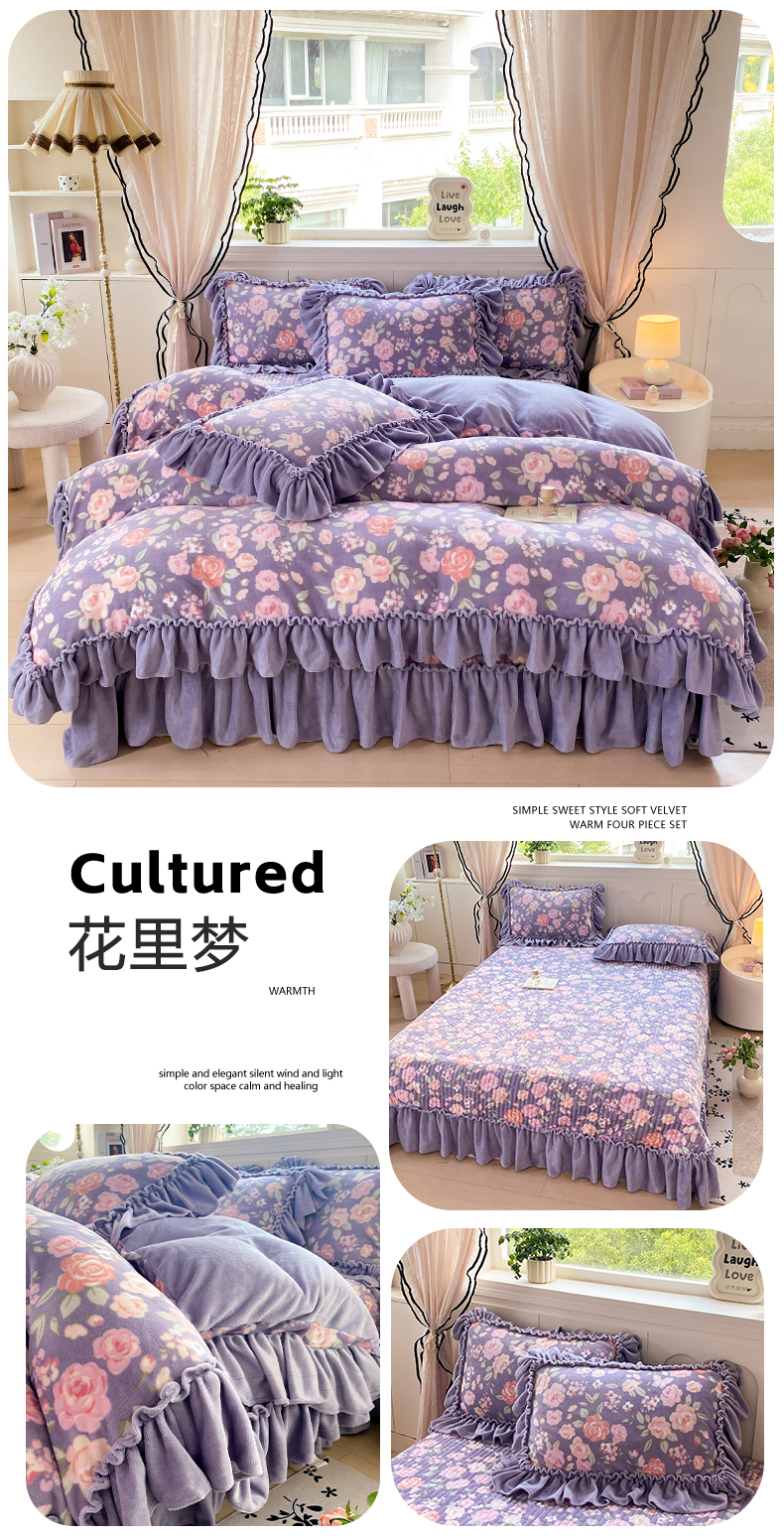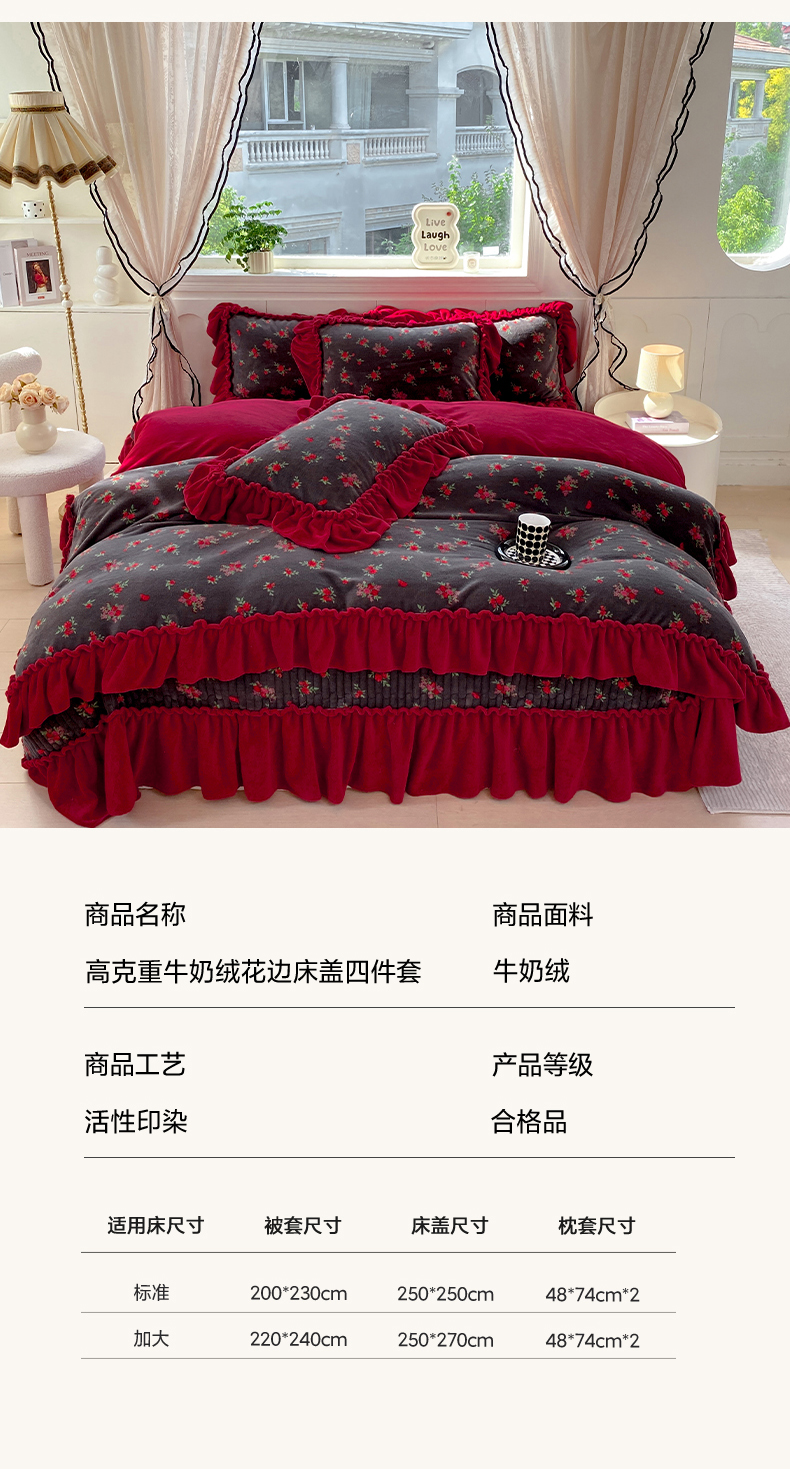 (总)云木里 2025新款热卖大宽花边牛奶绒床盖款四件套,豹纹,波点,复古樱桃,蝴蝶结紫色,花里梦,玫瑰故事,玫瑰之约,美拉德猫,幽香,织梦空间,紫色日记