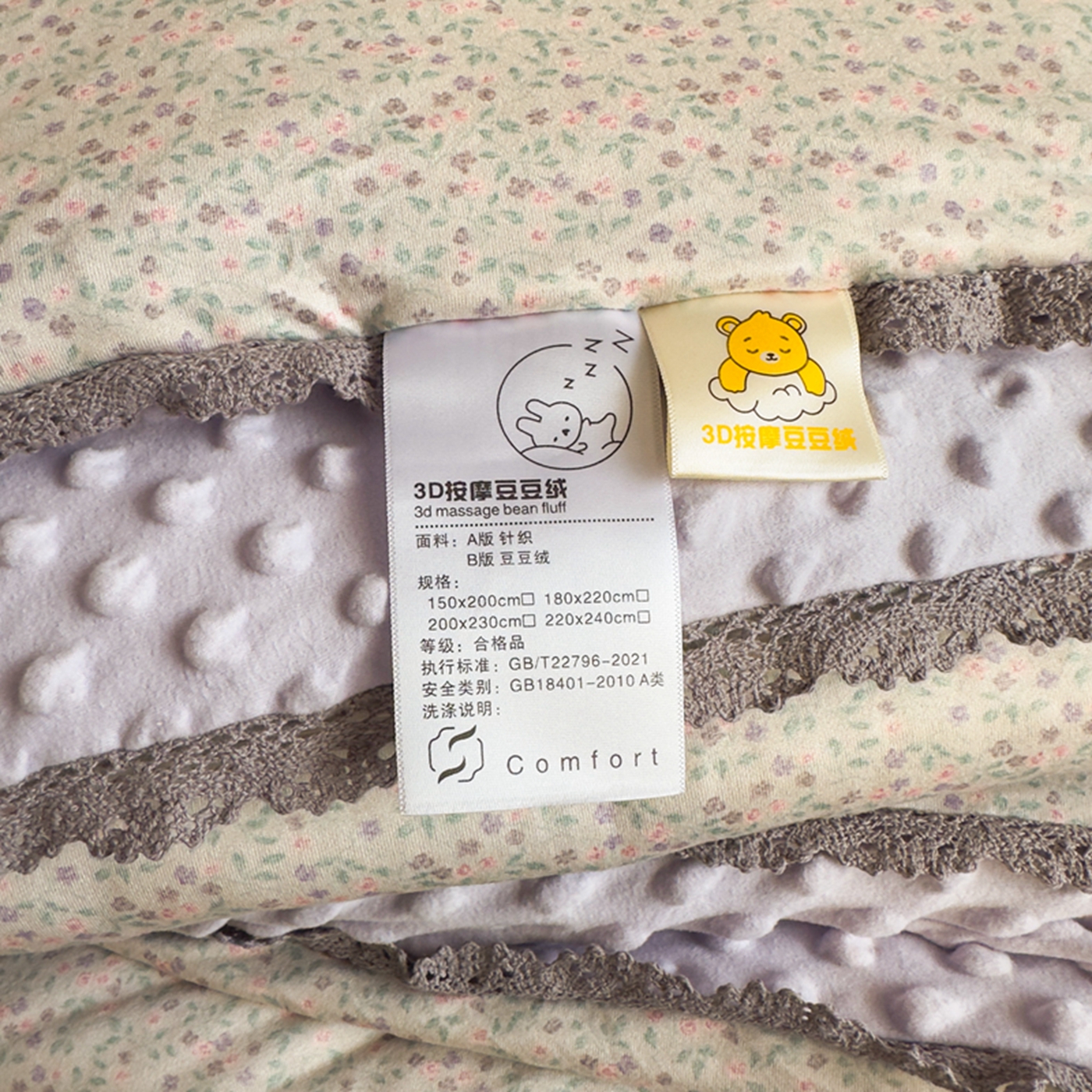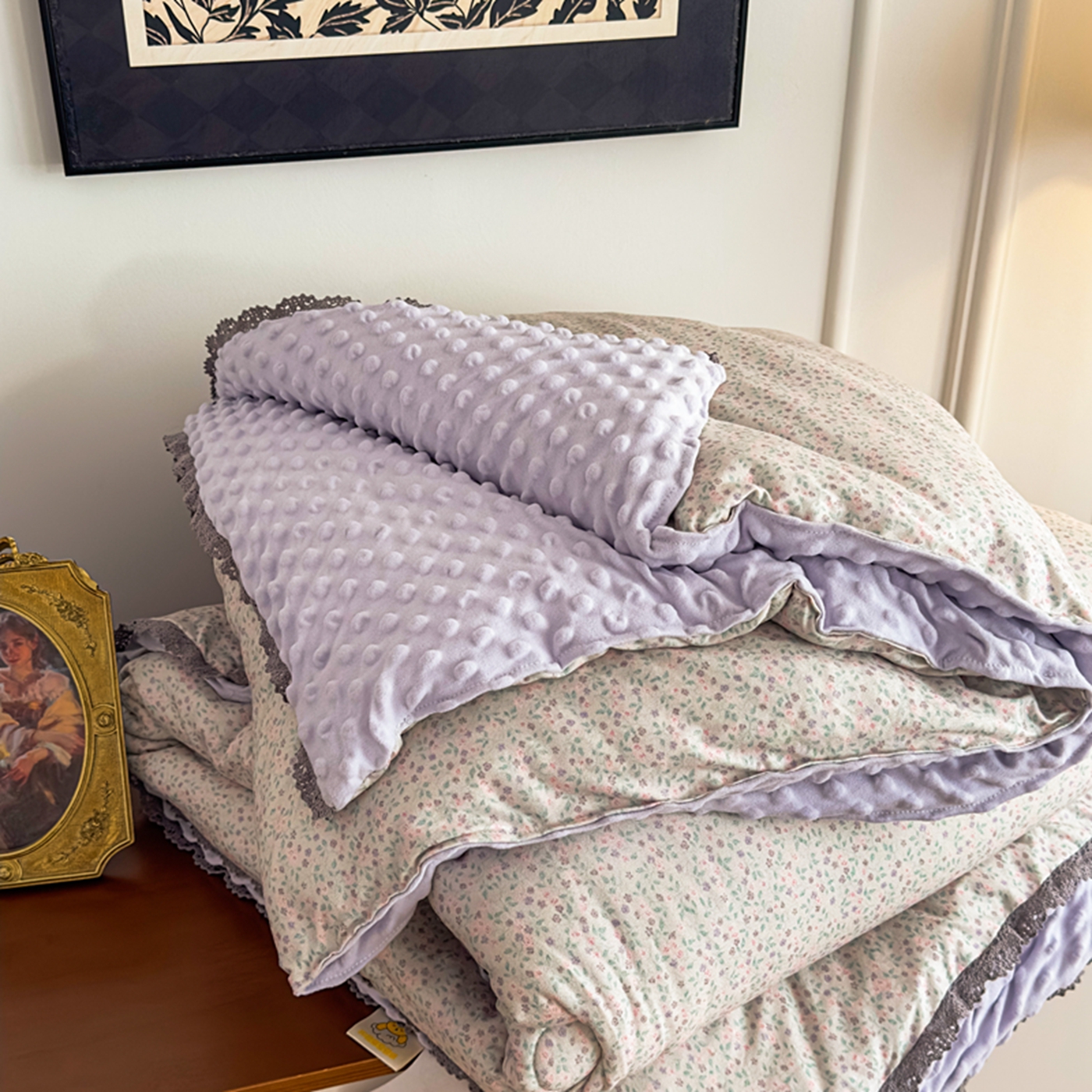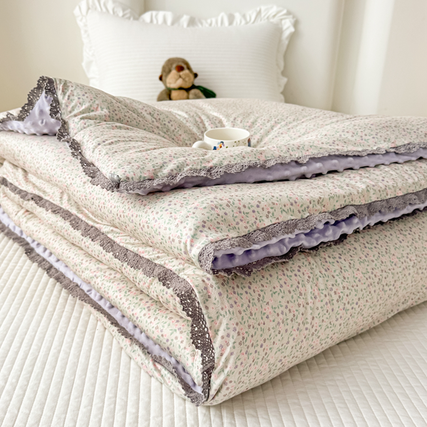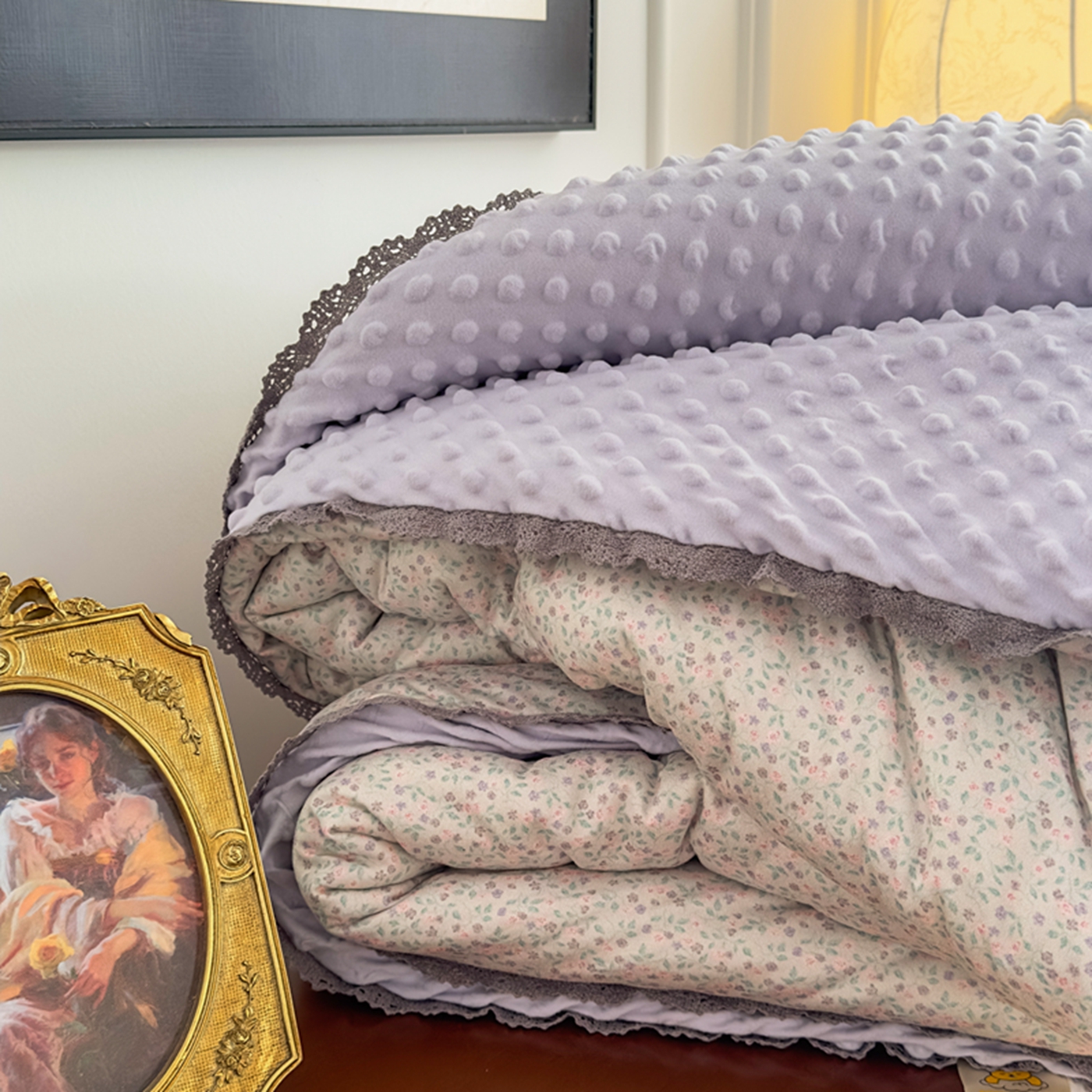 商品名称:睡美美家纺 2025新款秋冬亲肤柔软豆豆绒花边款冬被被芯 紫色庄园