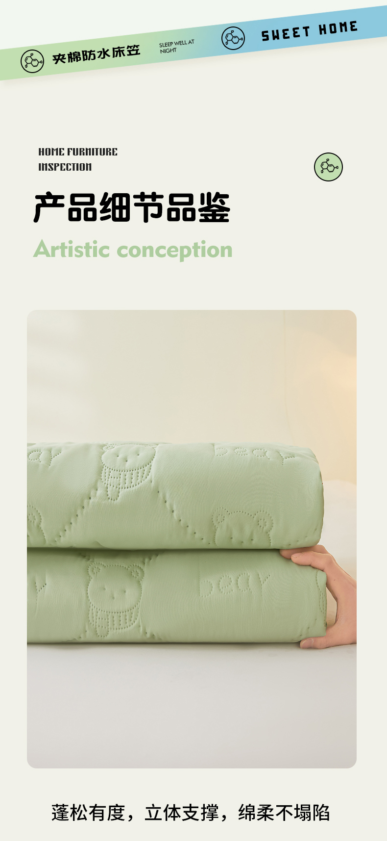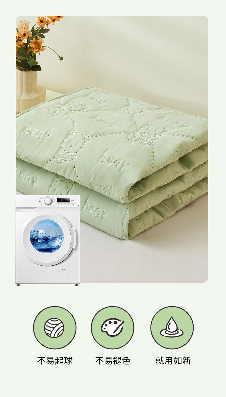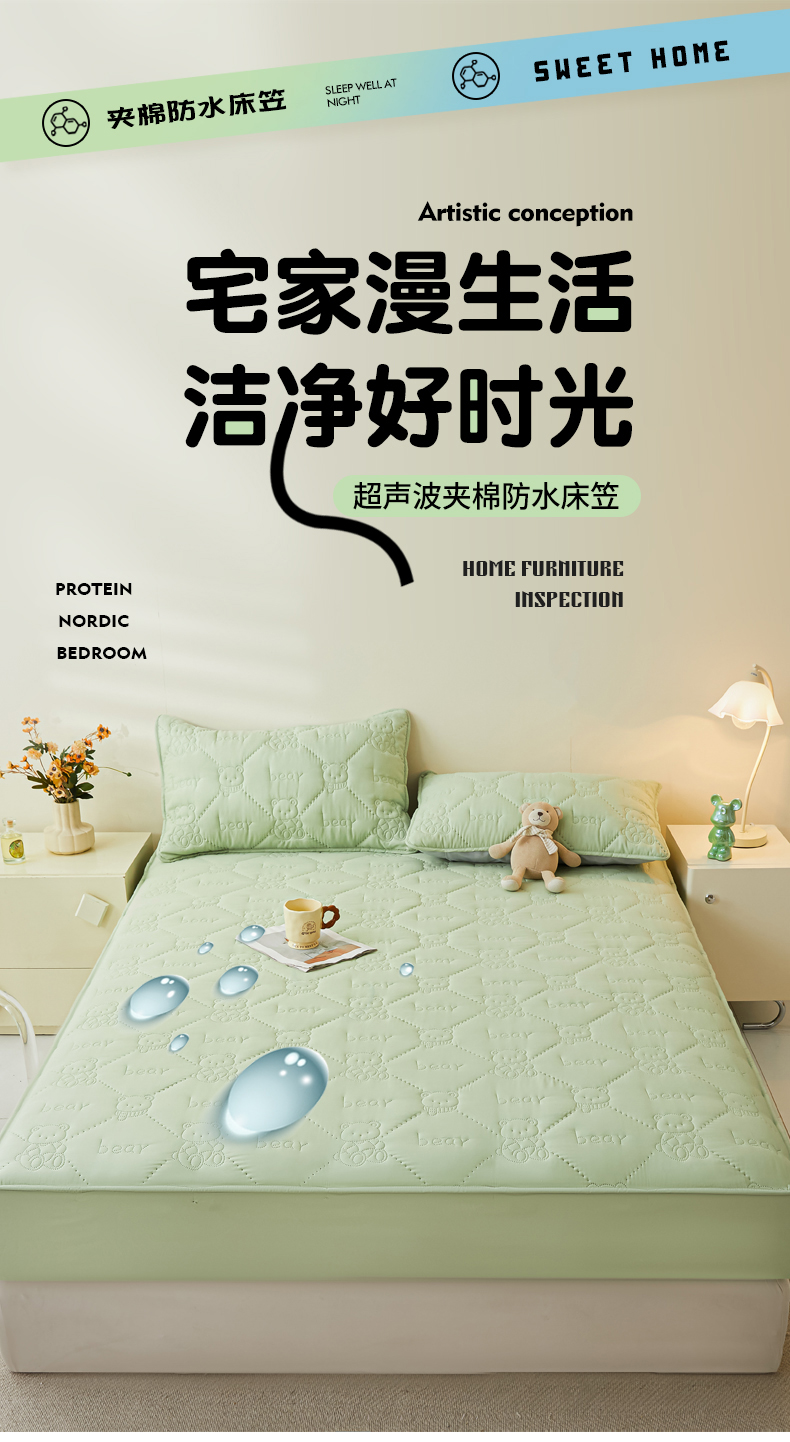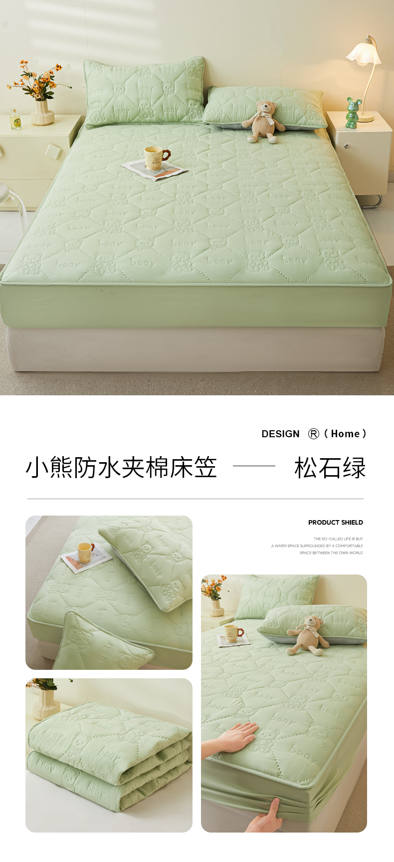 • 91家纺网 家纺一手货源 找家纺 LIFE.丽芙 2025新款磨毛单件超声波小熊夹棉防水床笠三件套 小熊防水夹棉床笠-松石绿