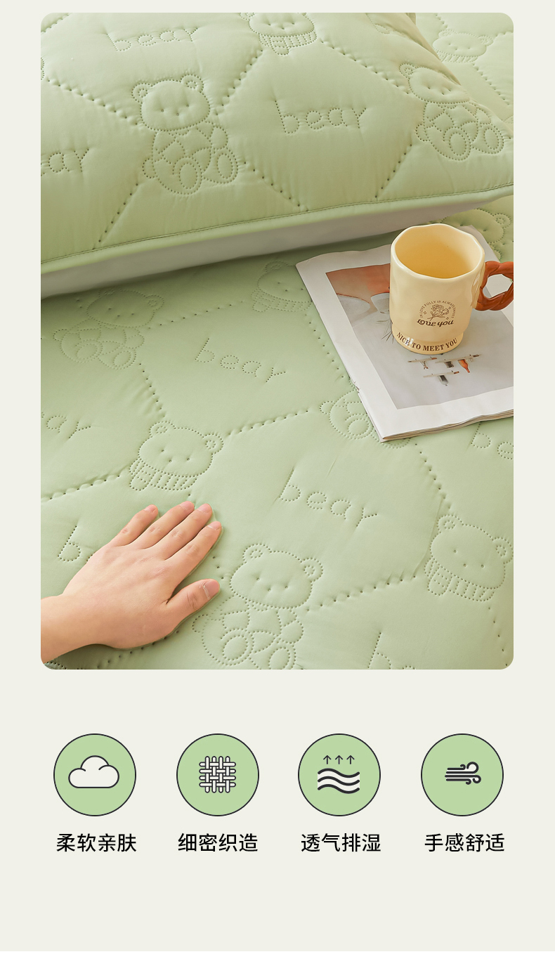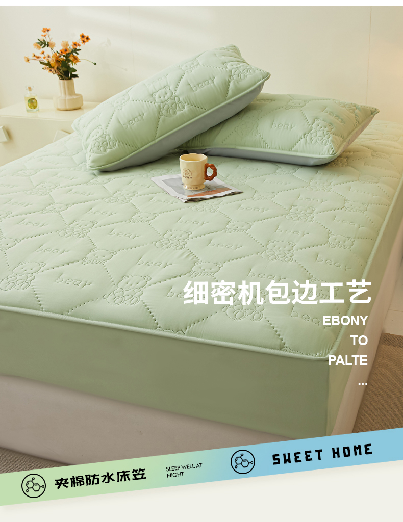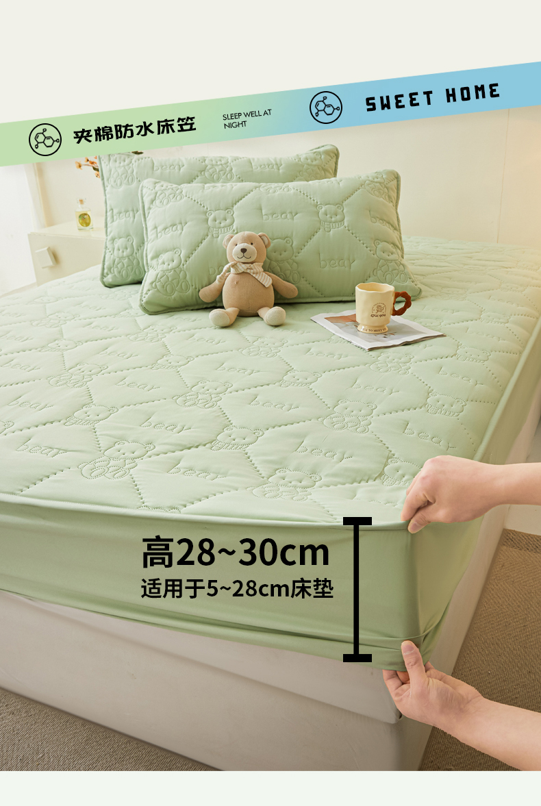 当前位置: 91家纺网 > 商品网购 > 床上用品 > 床笠 > LIFE.丽芙 2025新款磨毛单件超声波小熊夹棉防水床笠三件套 小熊防水夹棉床笠-松石绿