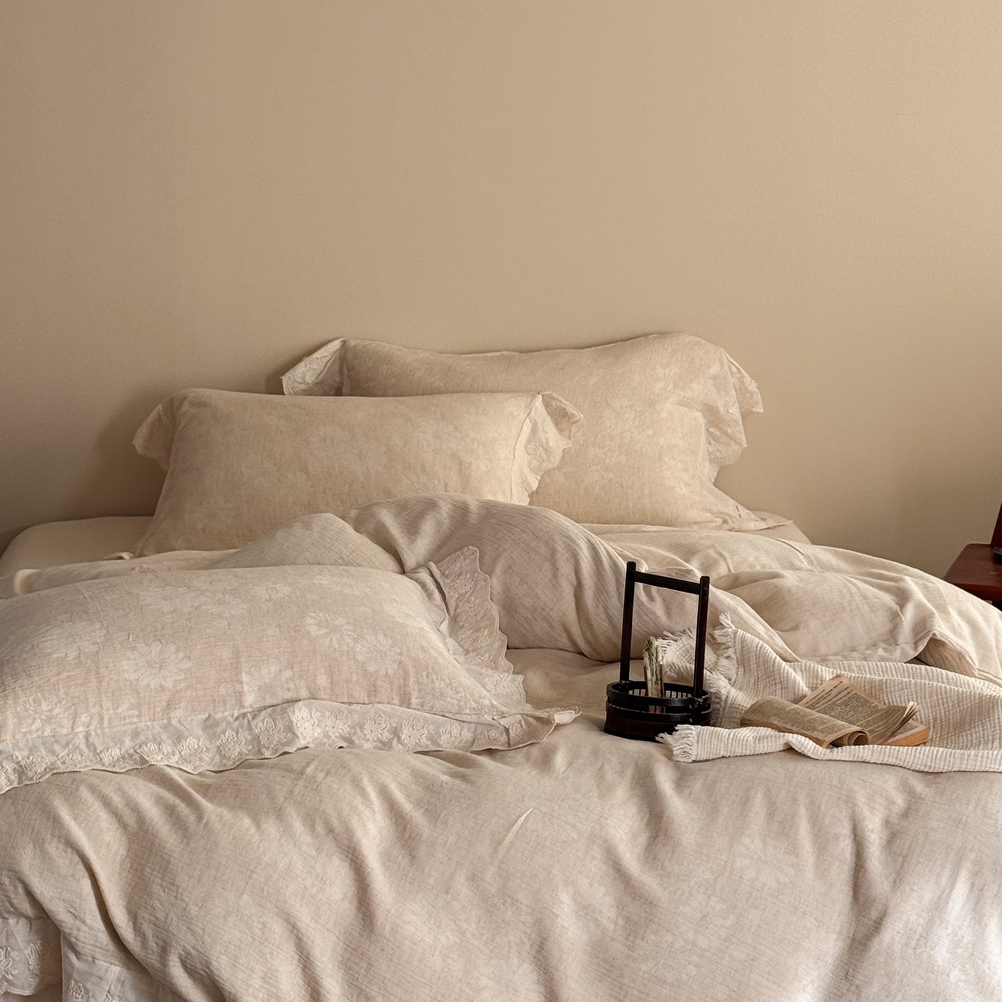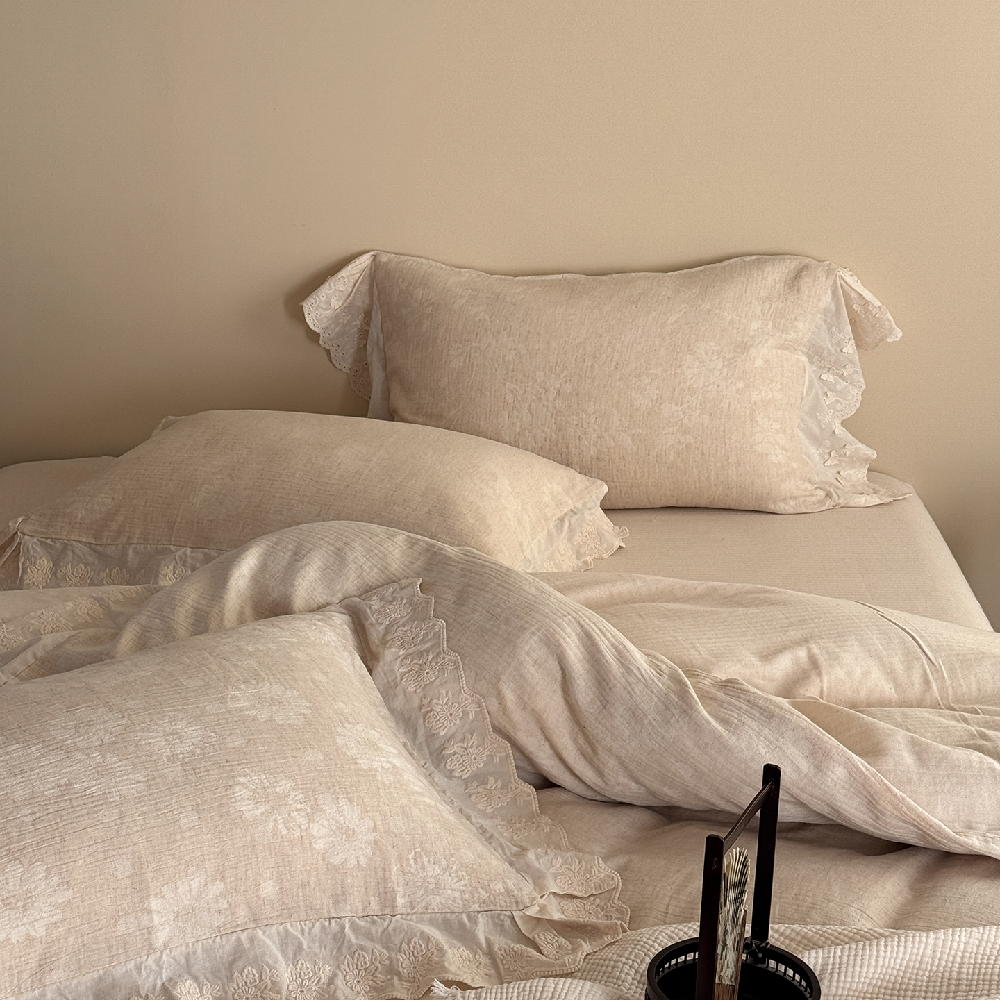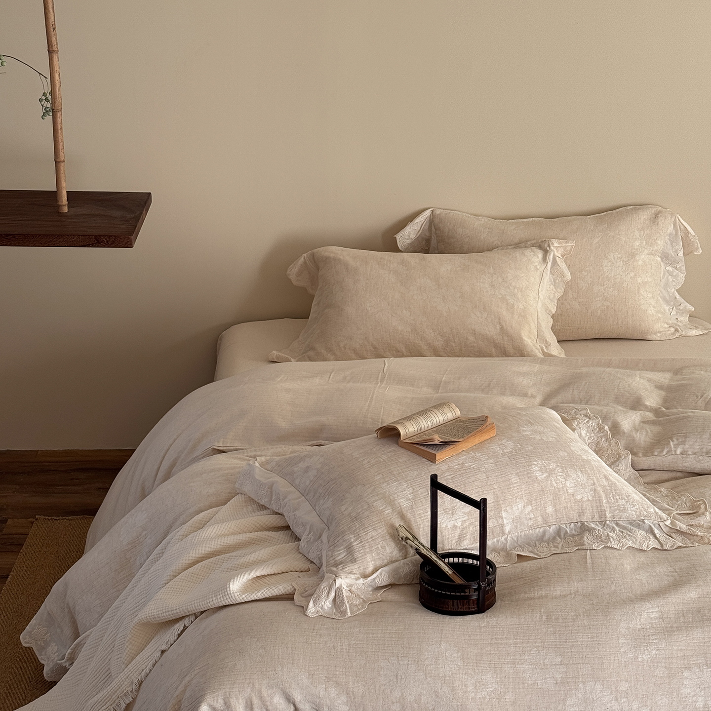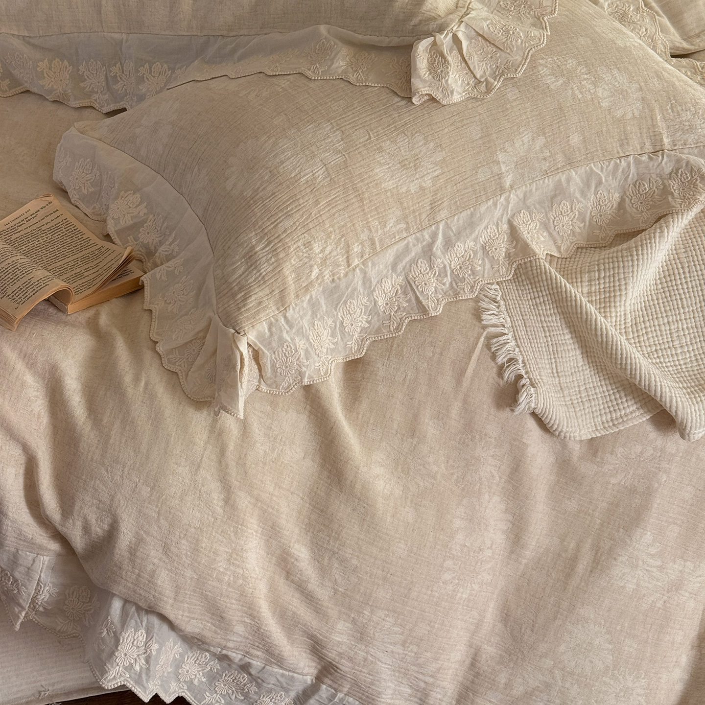 (总)爱丽丝 2026新款色织提花棉麻四件套-椿山集花边款,椿山集花边款