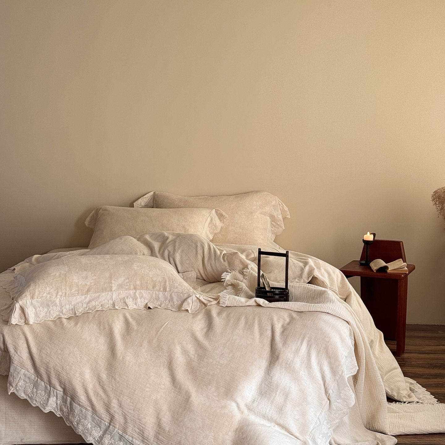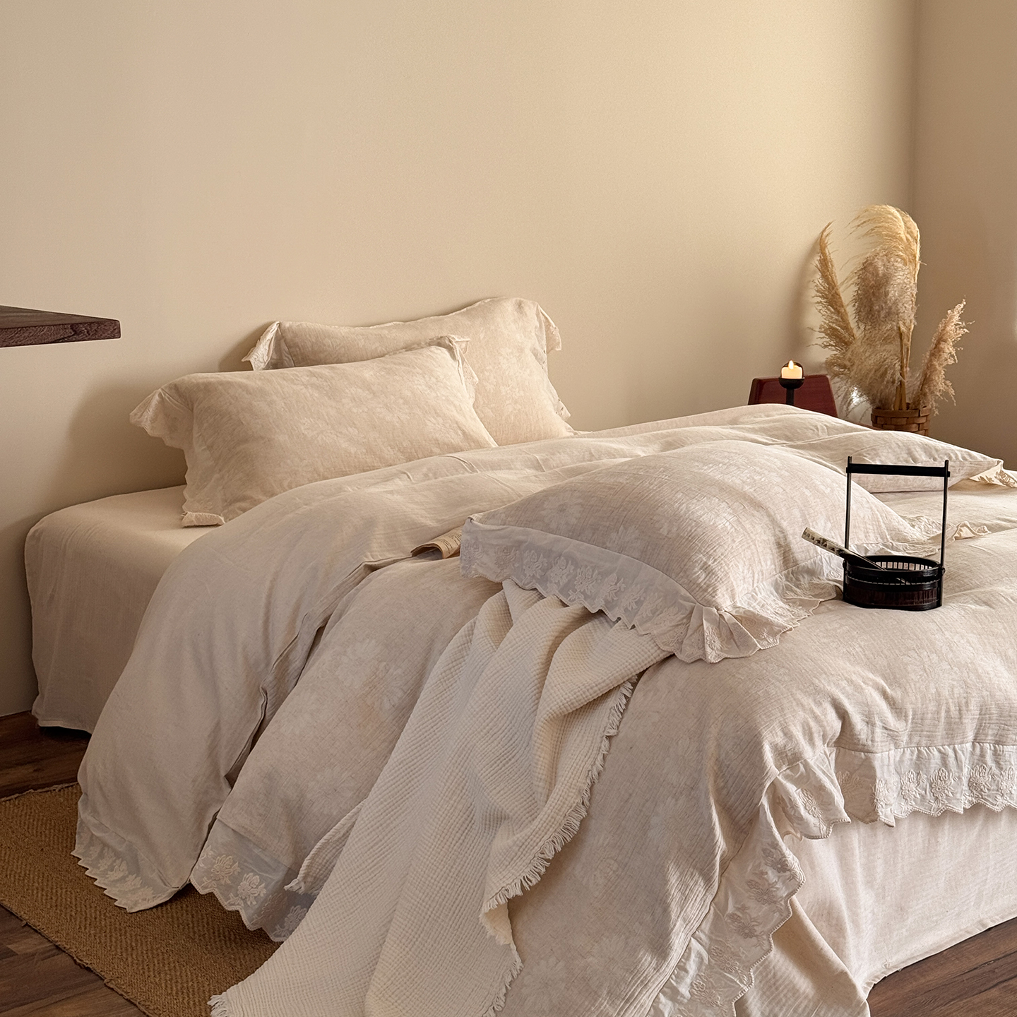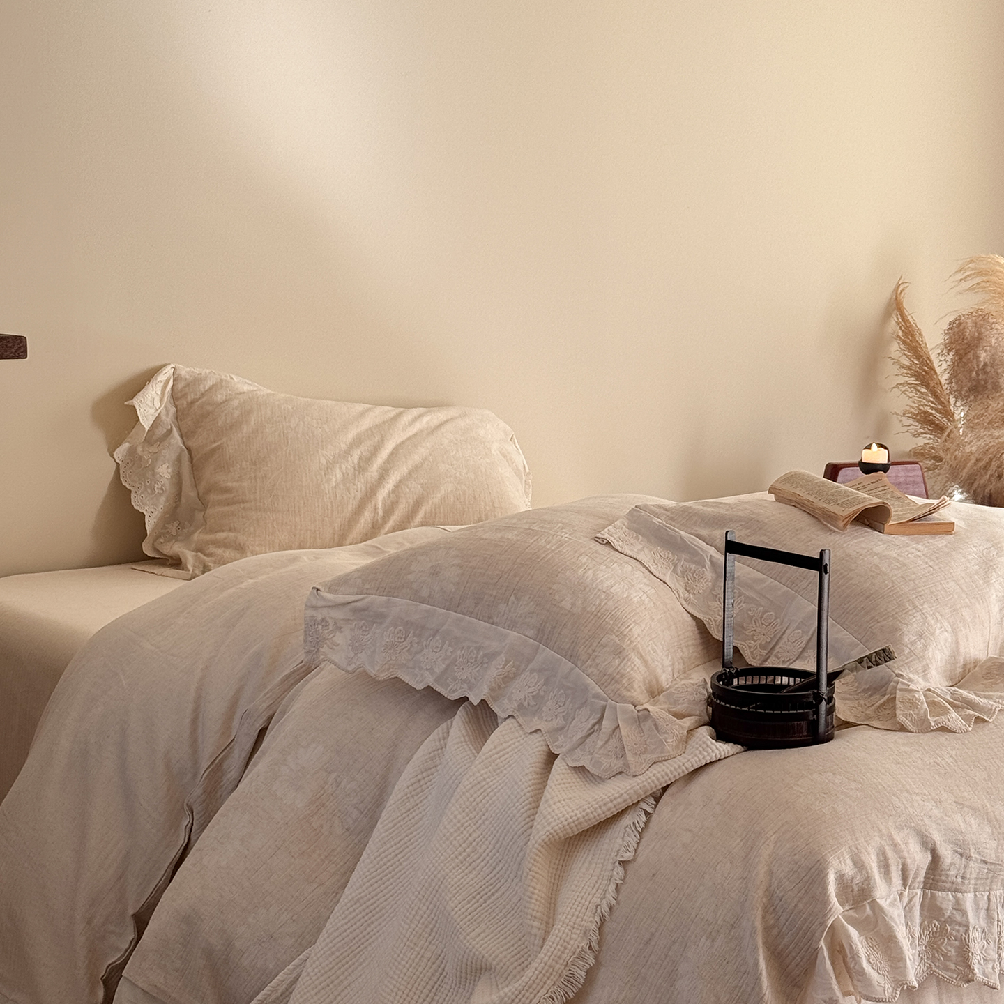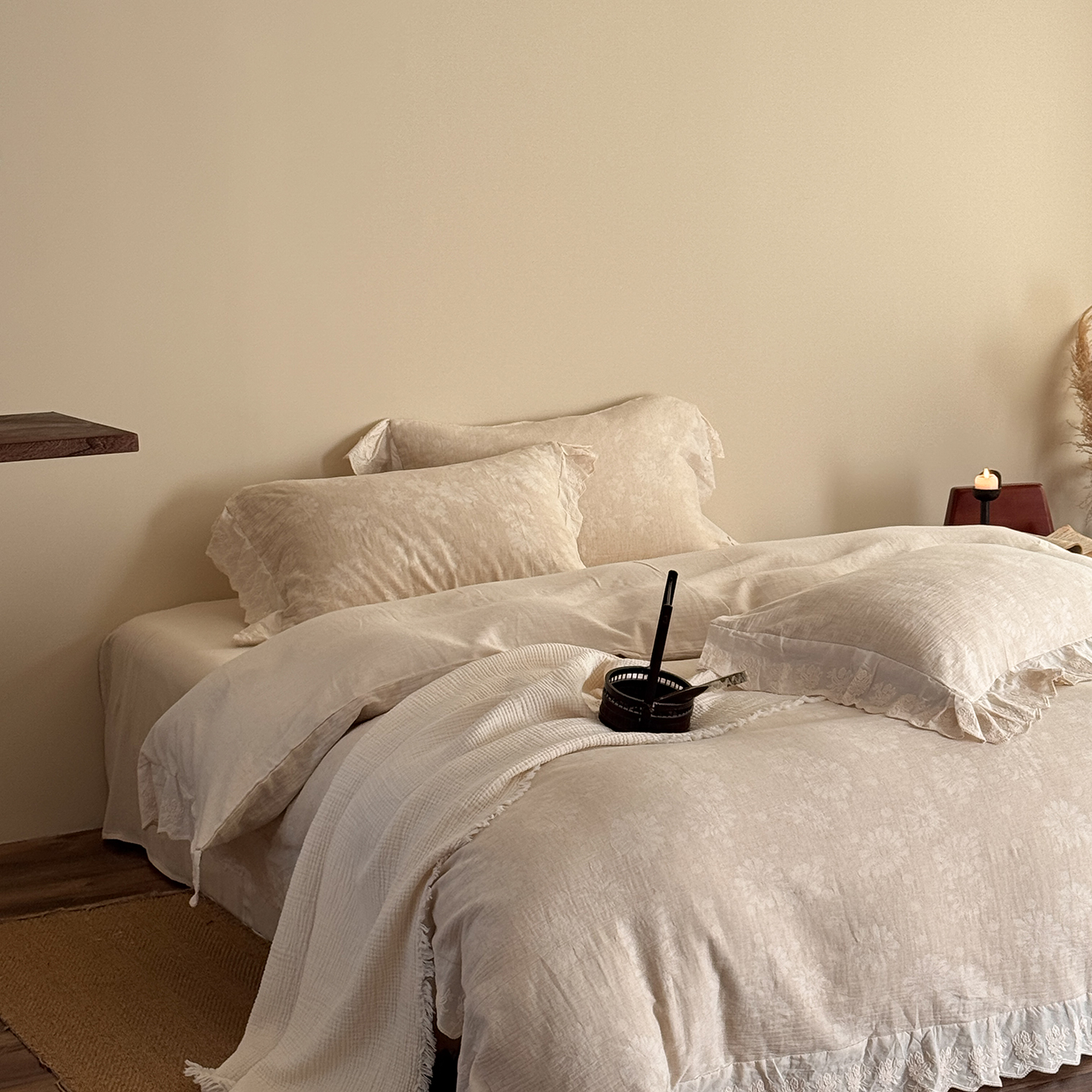 (总)爱丽丝 2026新款色织提花棉麻四件套-椿山集花边款,椿山集花边款