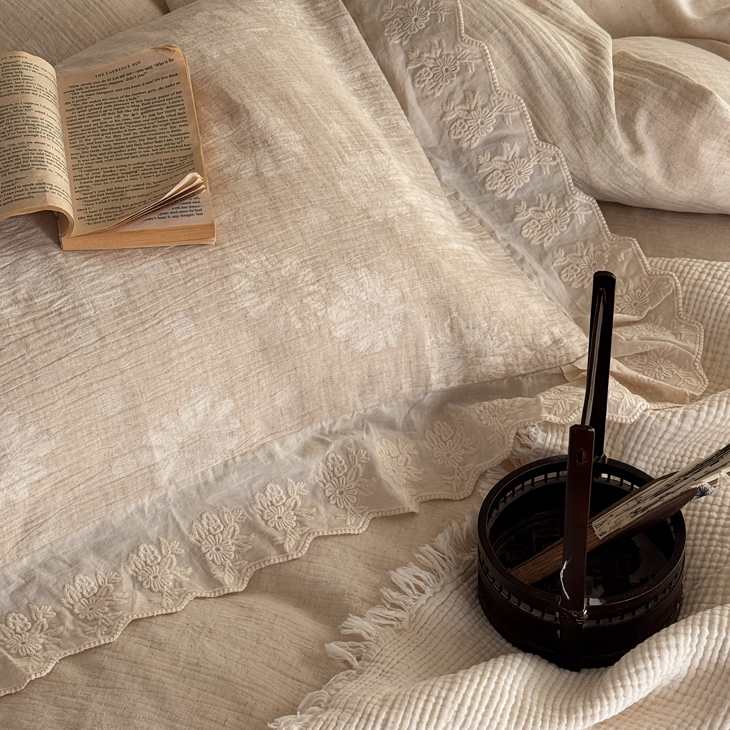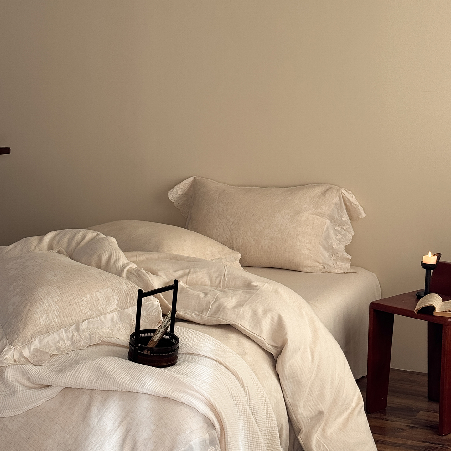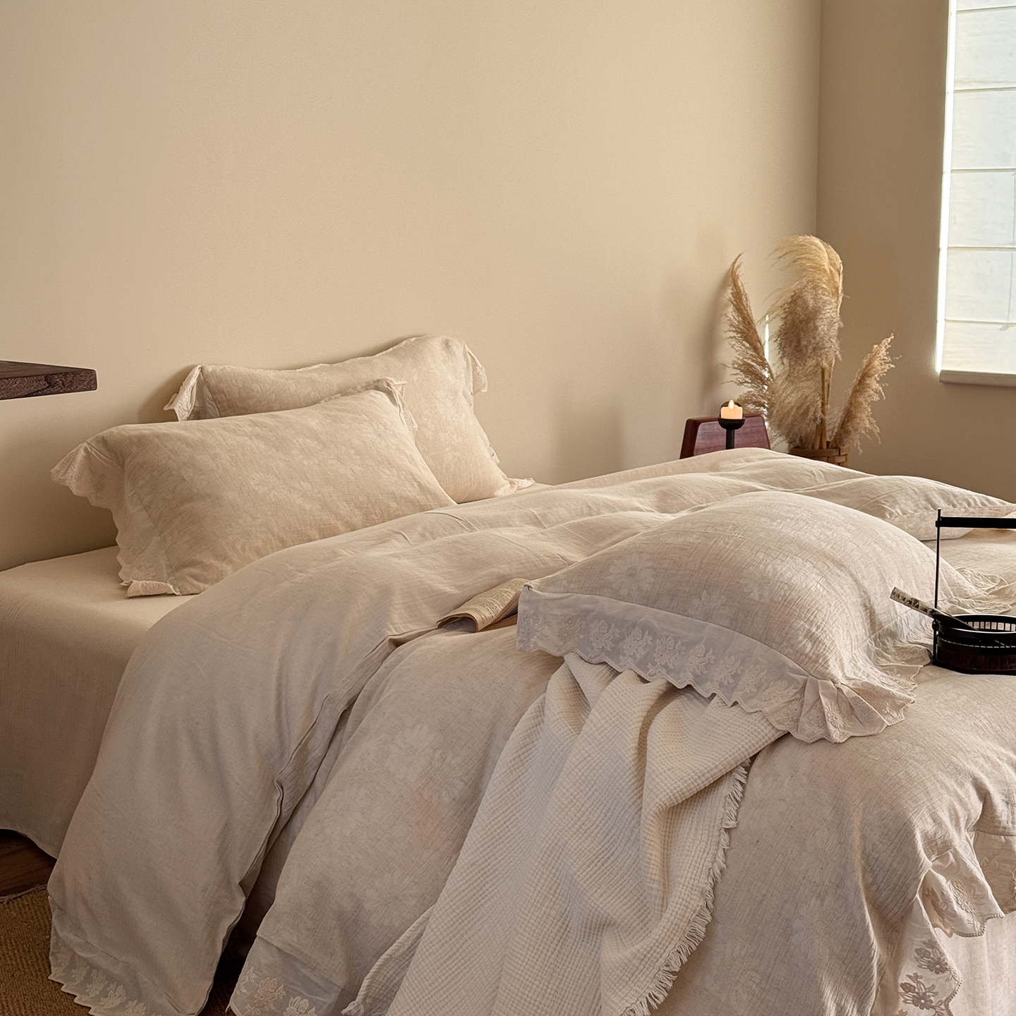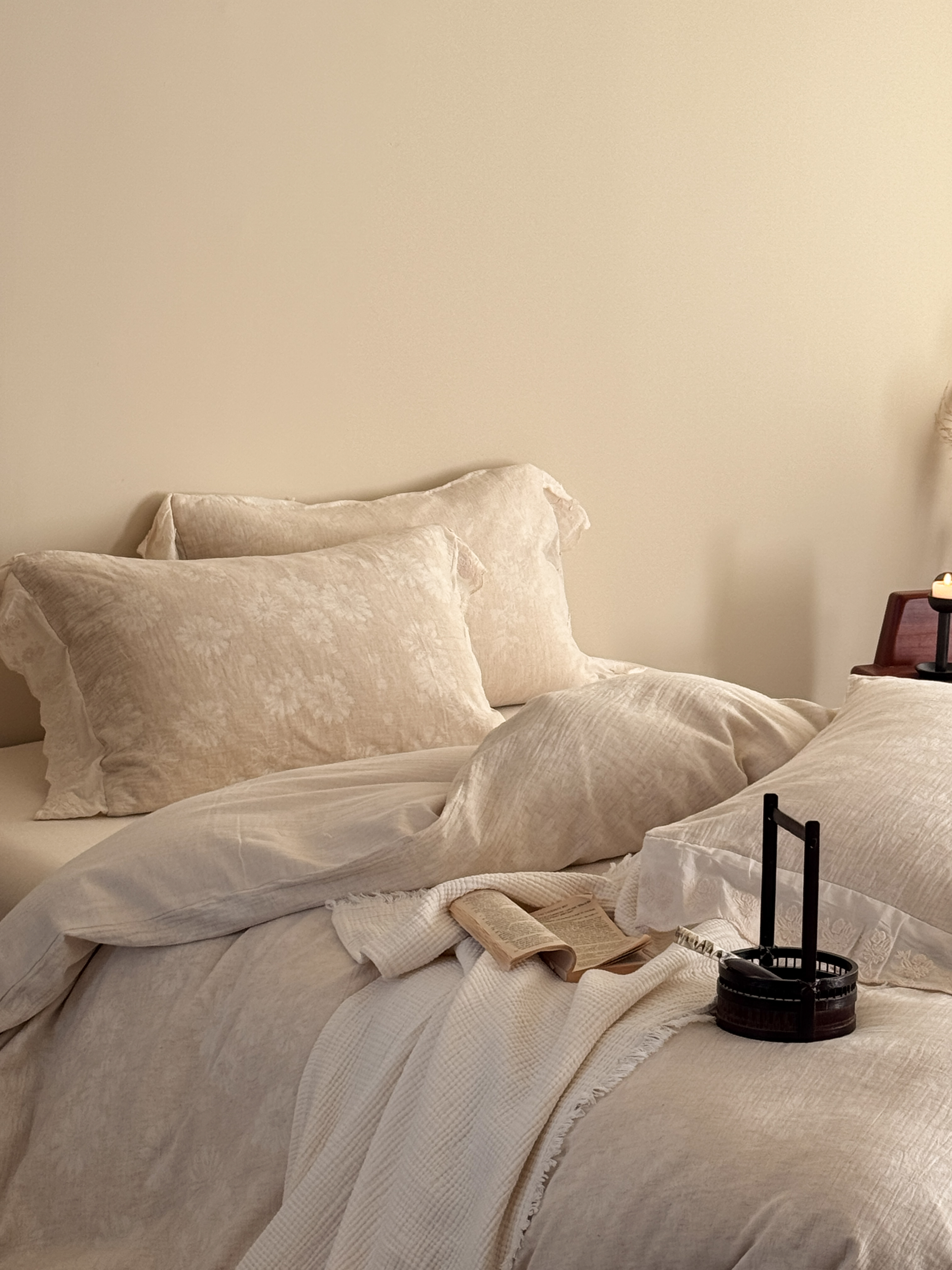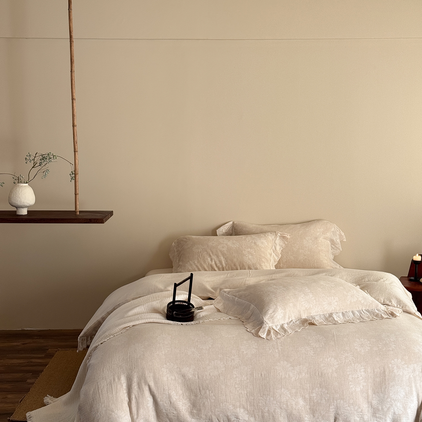 (总)爱丽丝 2026新款色织提花棉麻四件套-椿山集花边款,椿山集花边款