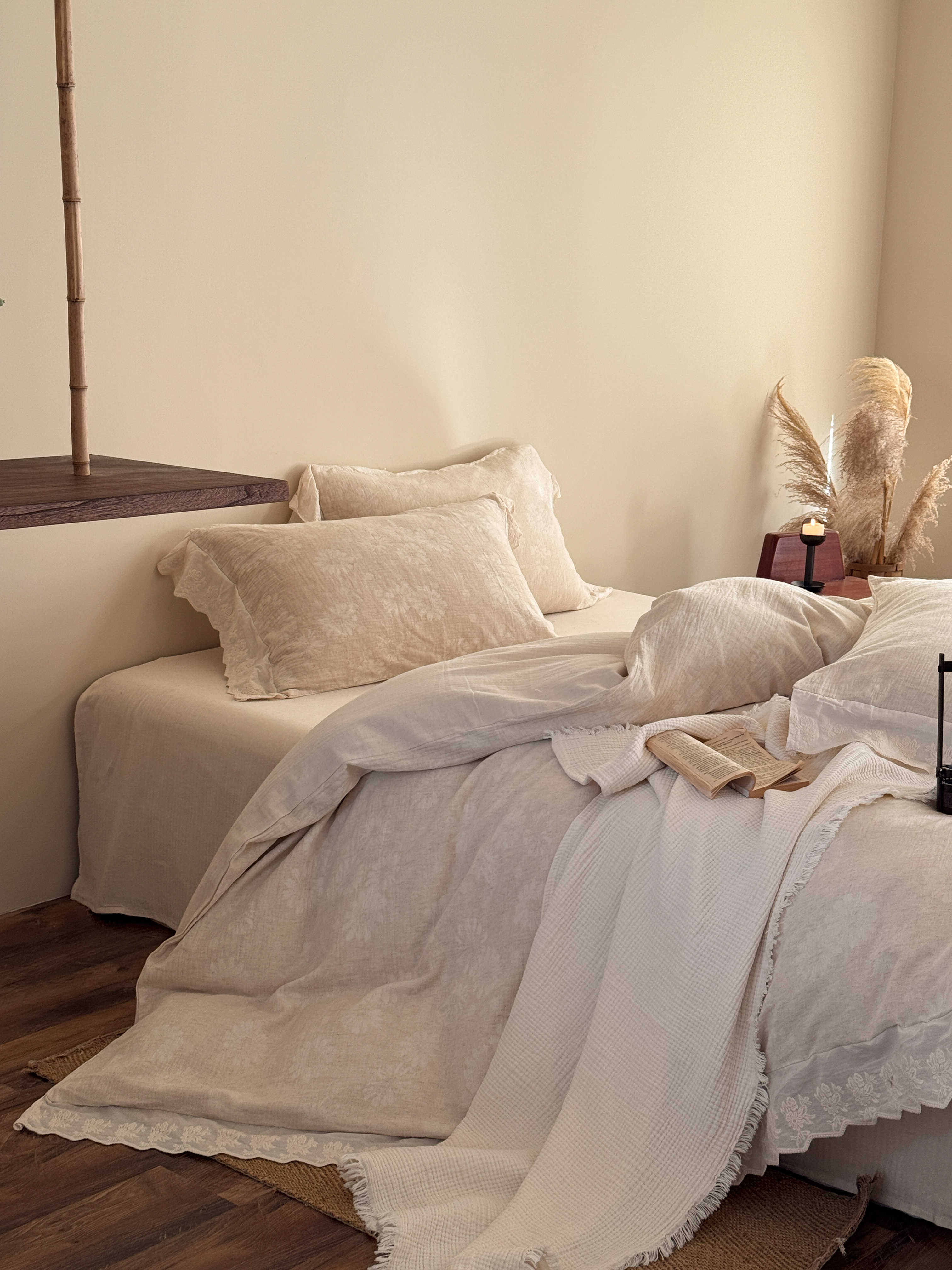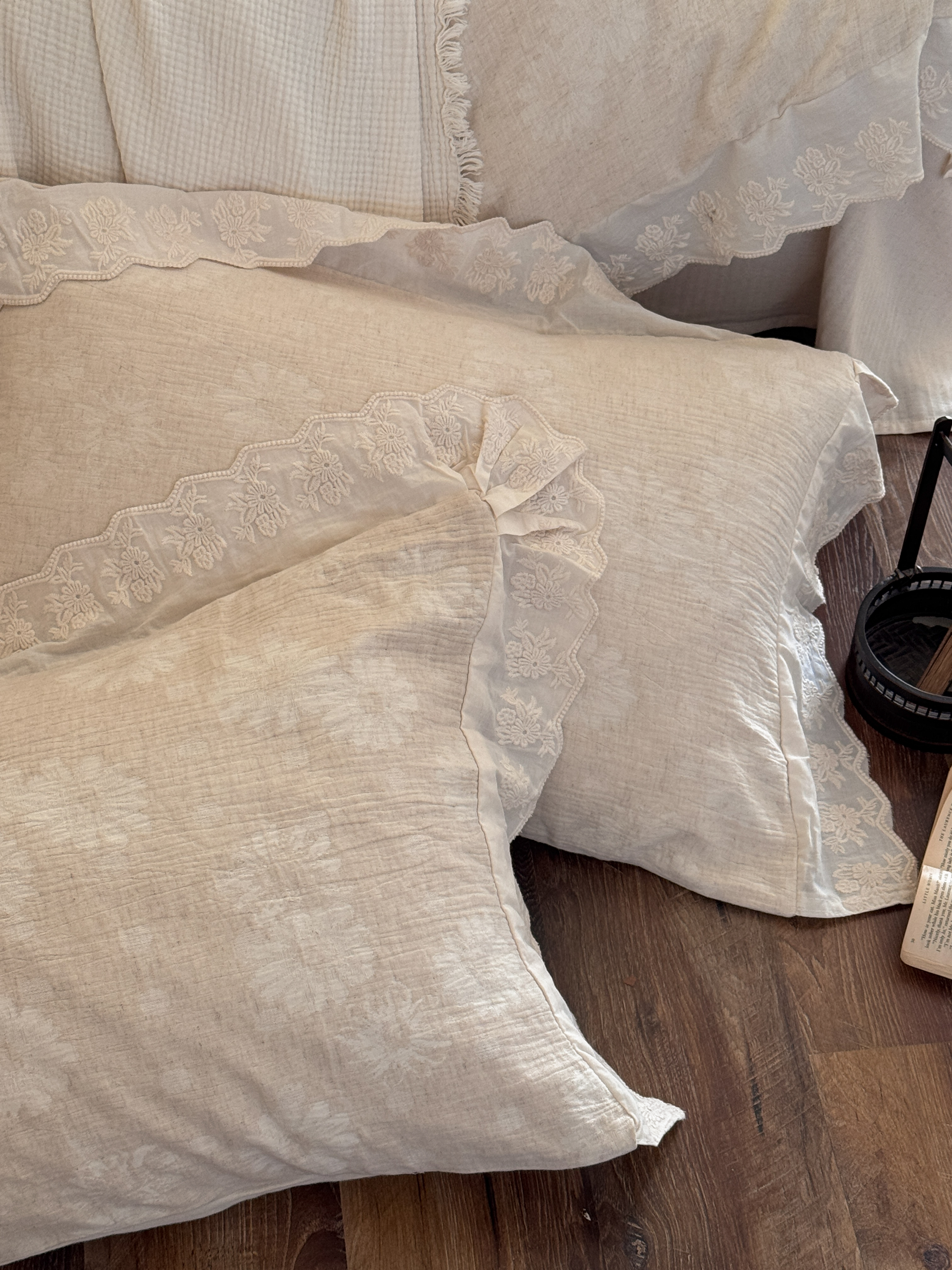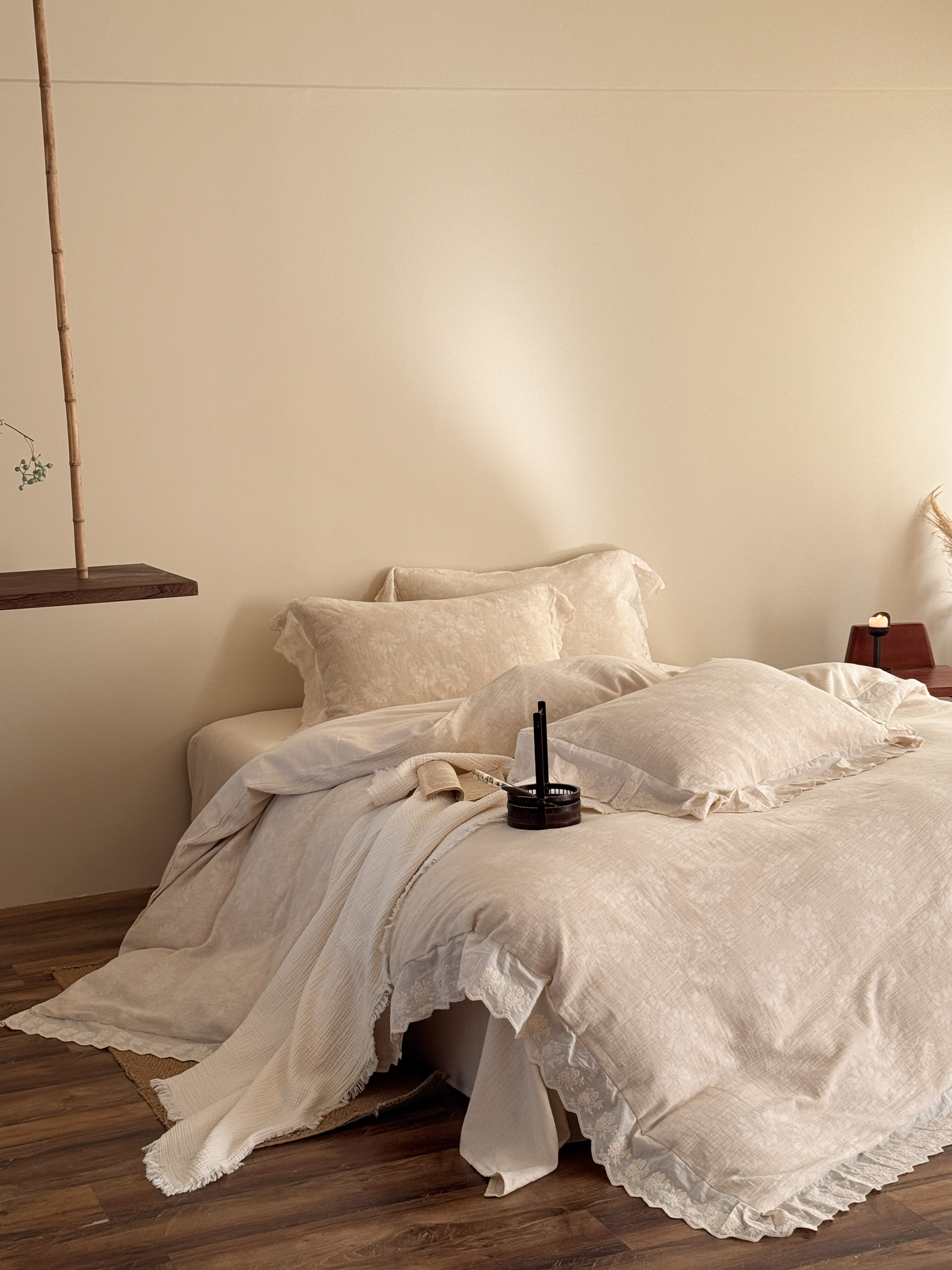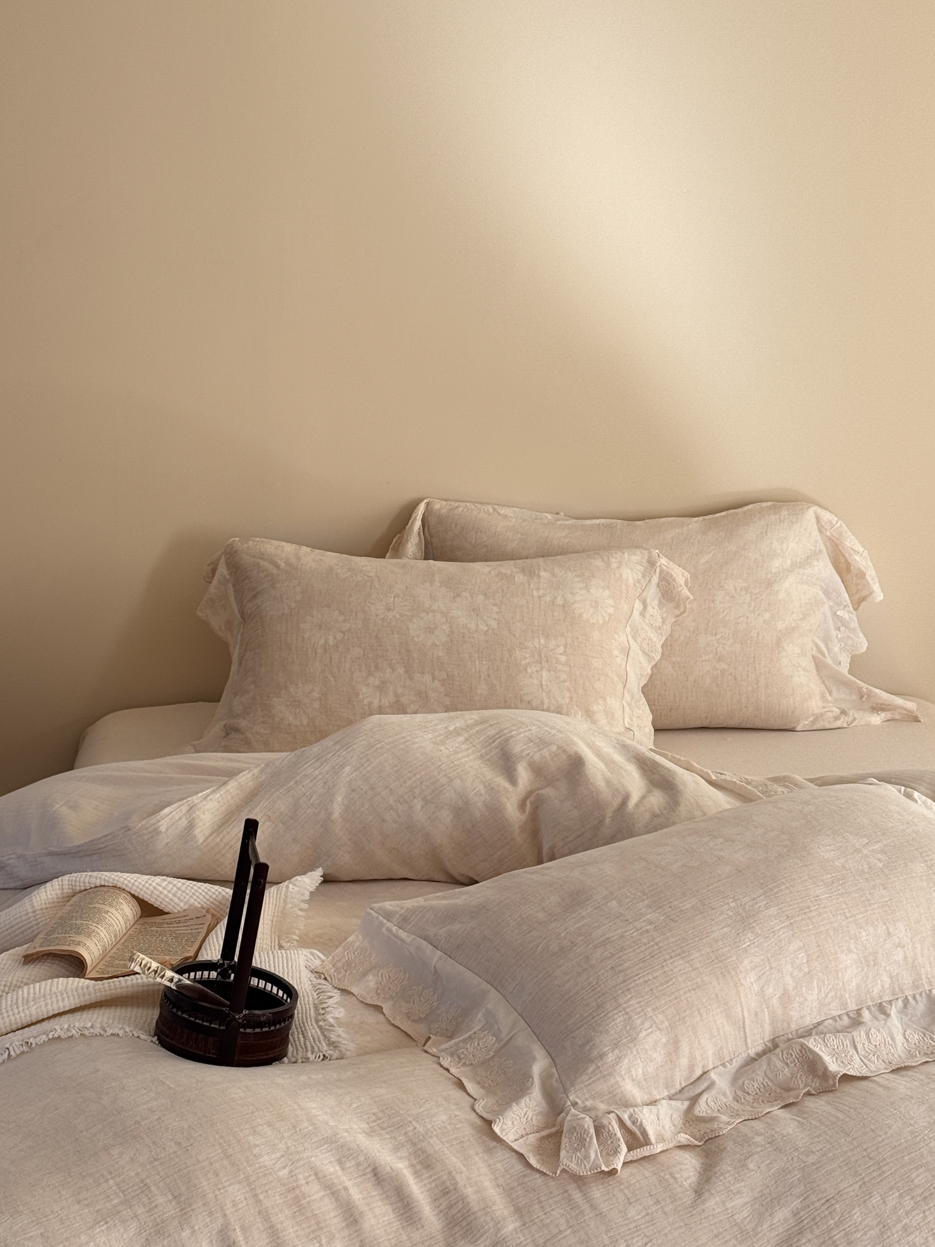 (总)爱丽丝 2026新款色织提花棉麻四件套-椿山集花边款,椿山集花边款