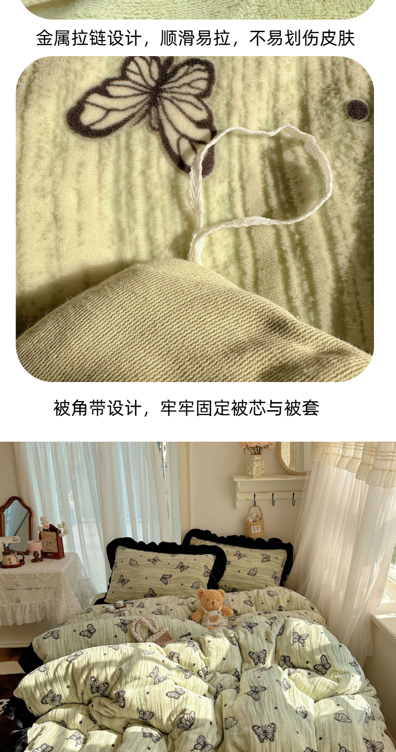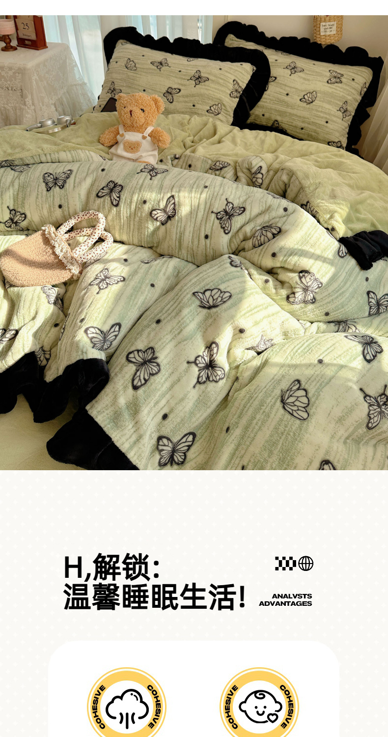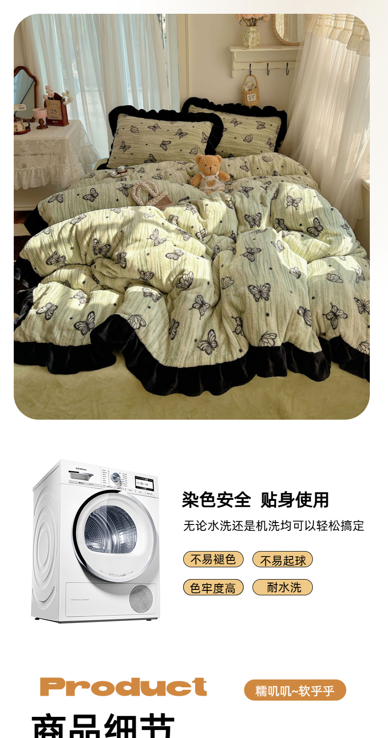 商品名称:欣宜家纺 2025新款蝴蝶烂花牛奶绒雕花绒花边款四件套 黑蝴蝶-绿