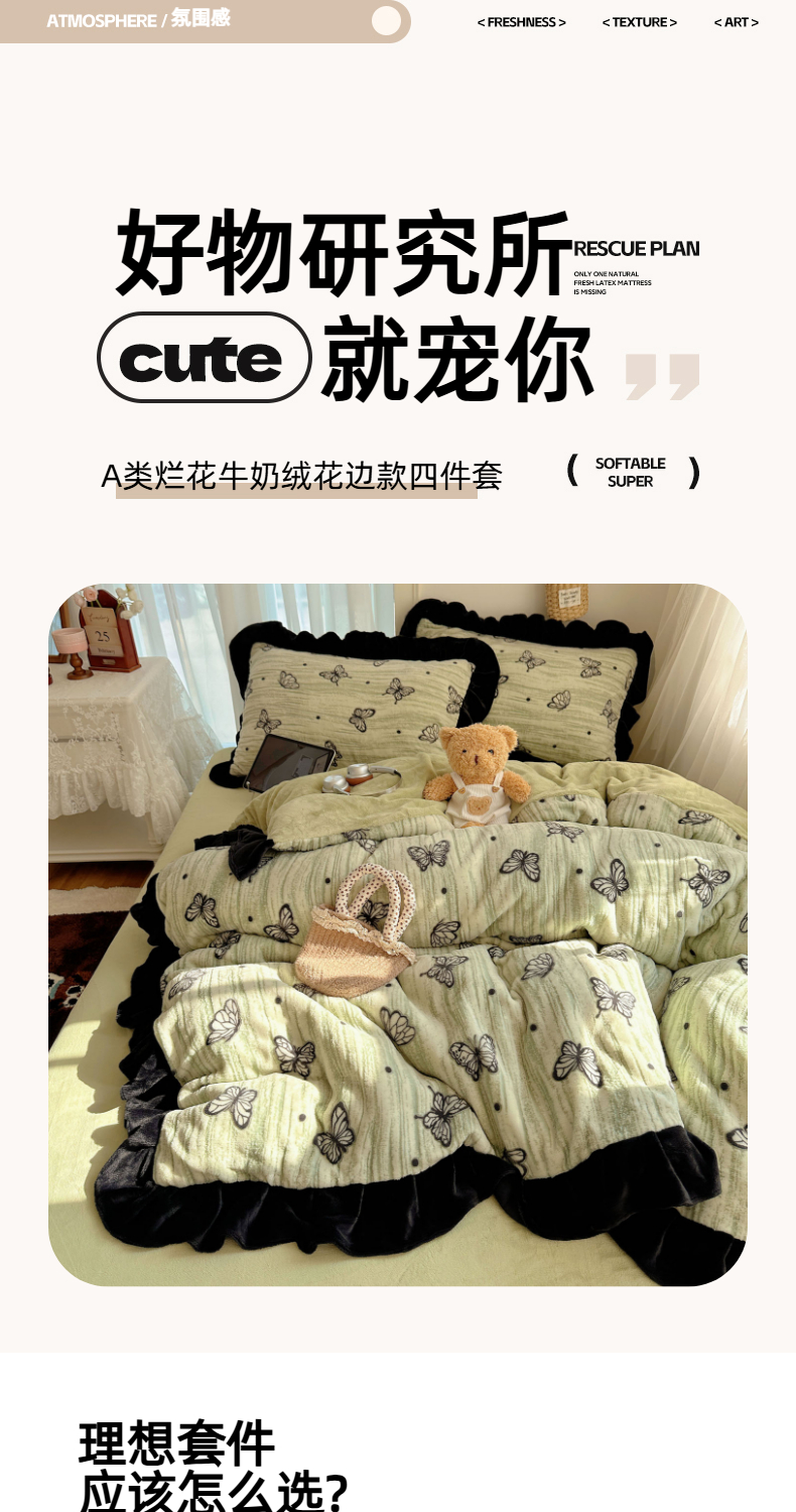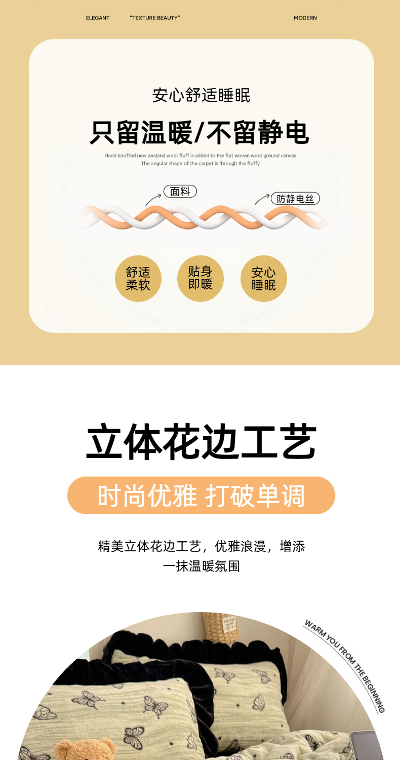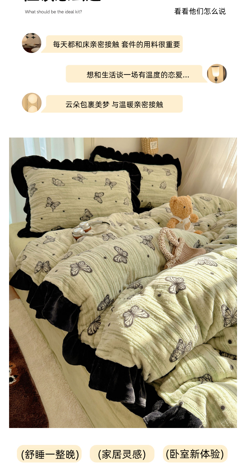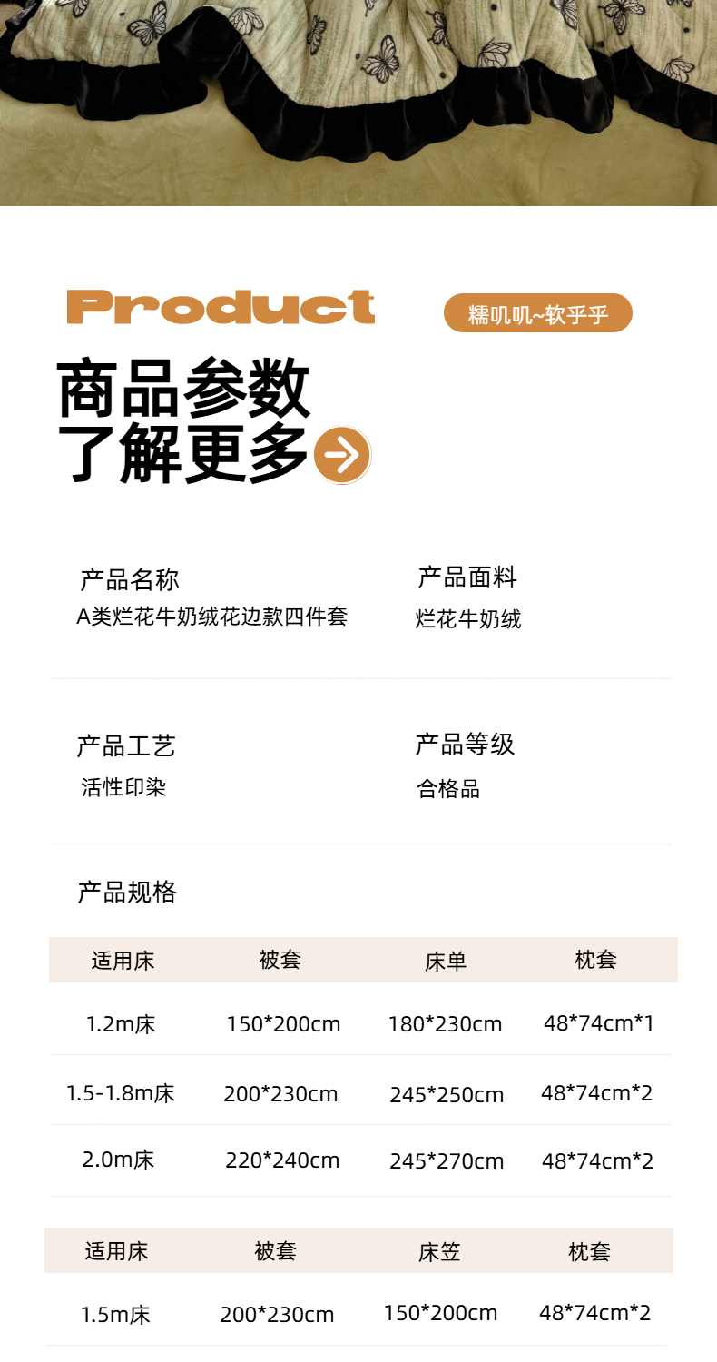 商品名称:欣宜家纺 2025新款蝴蝶烂花牛奶绒雕花绒花边款四件套 黑蝴蝶-绿