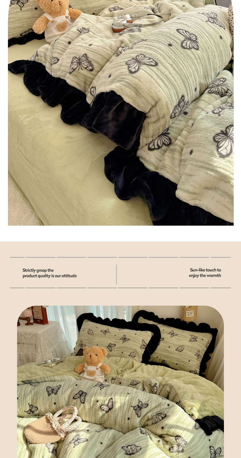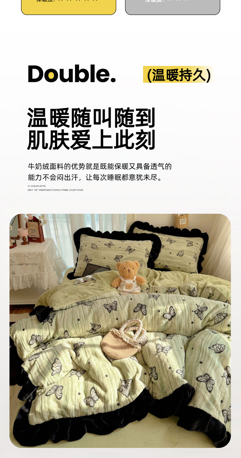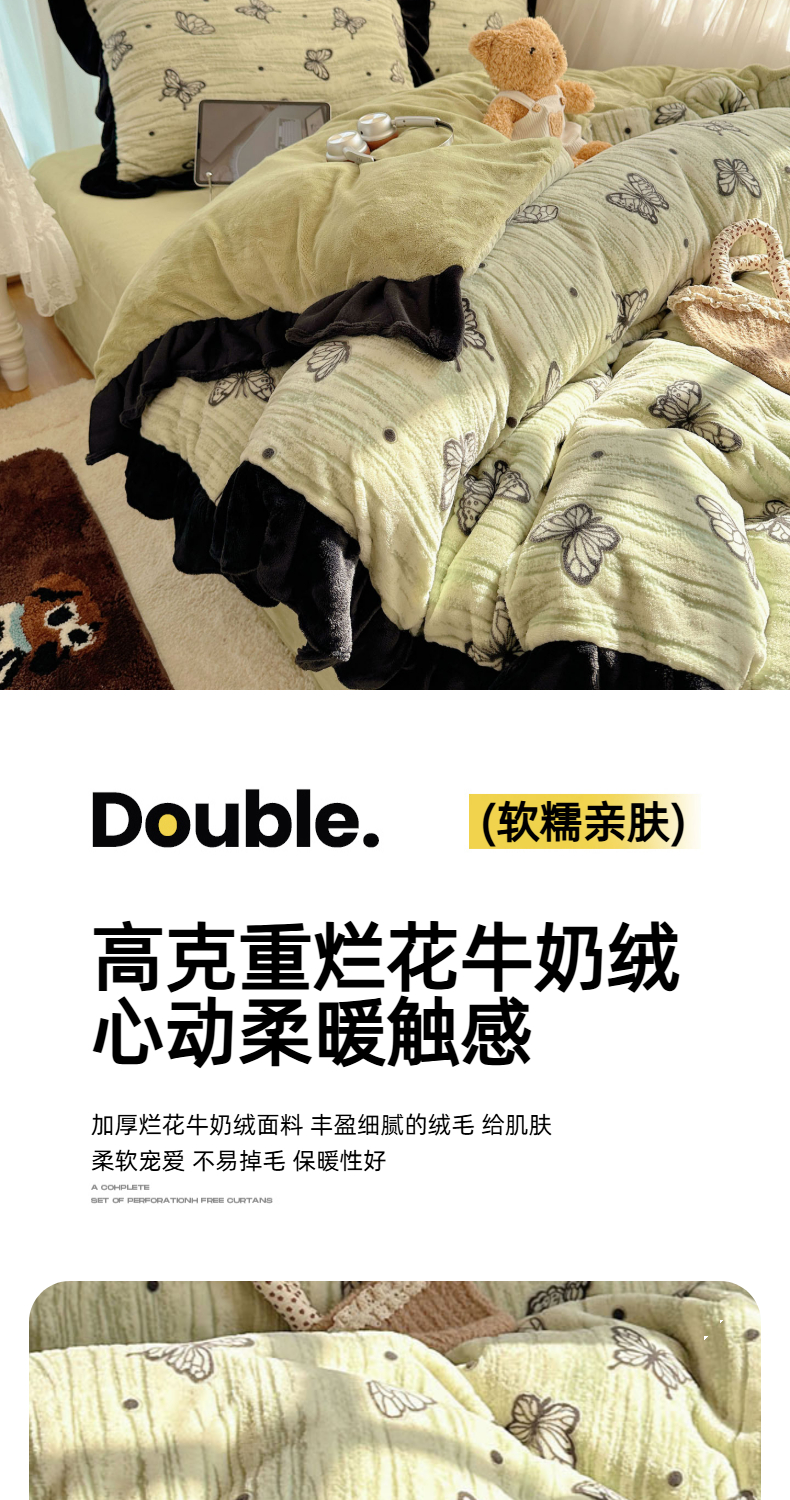 欣宜家纺 2025新款蝴蝶烂花牛奶绒雕花绒花边款四件套 黑蝴蝶-绿