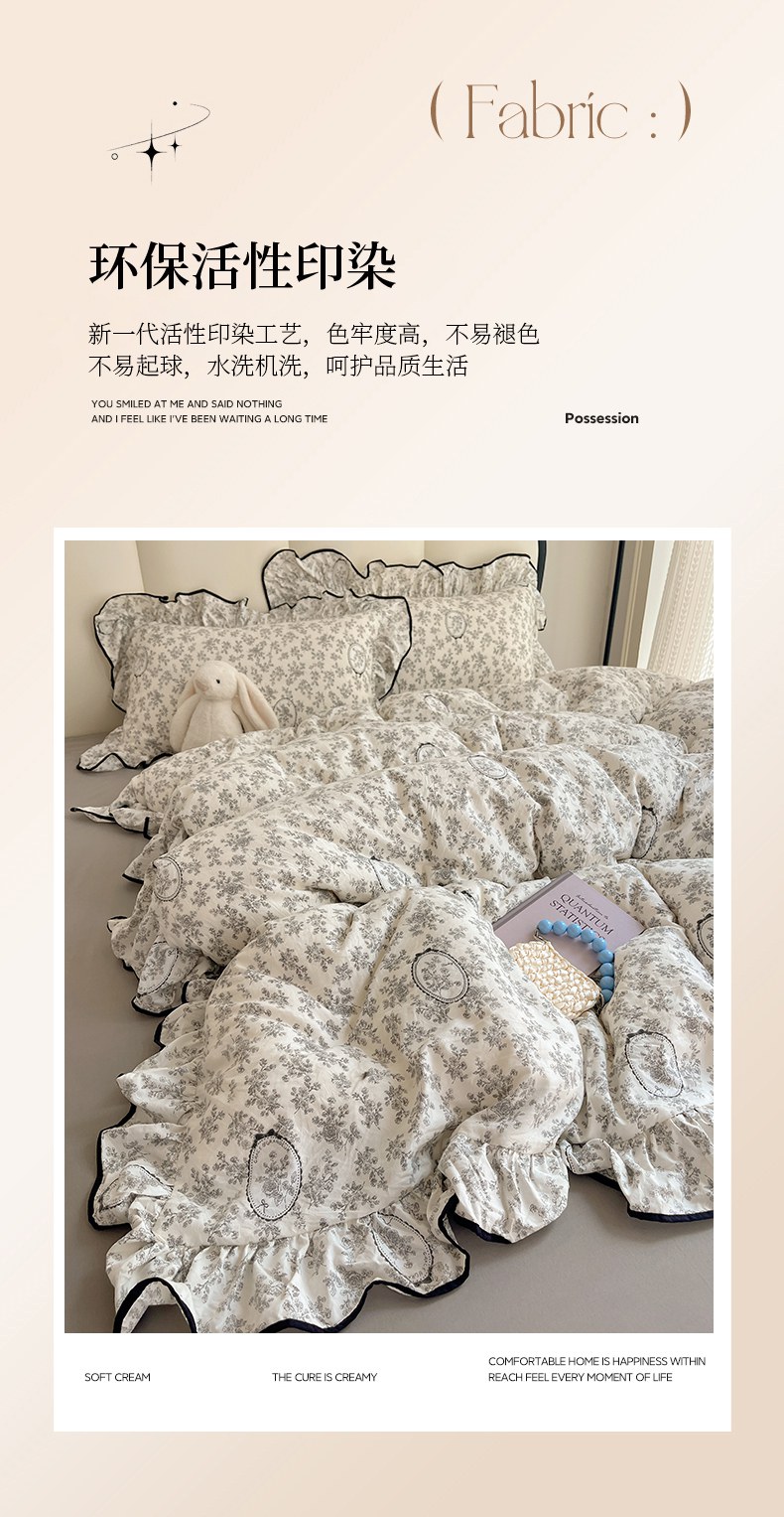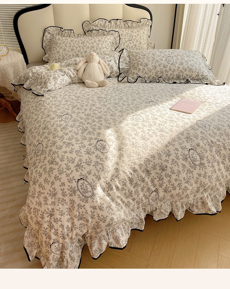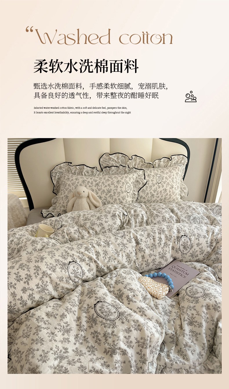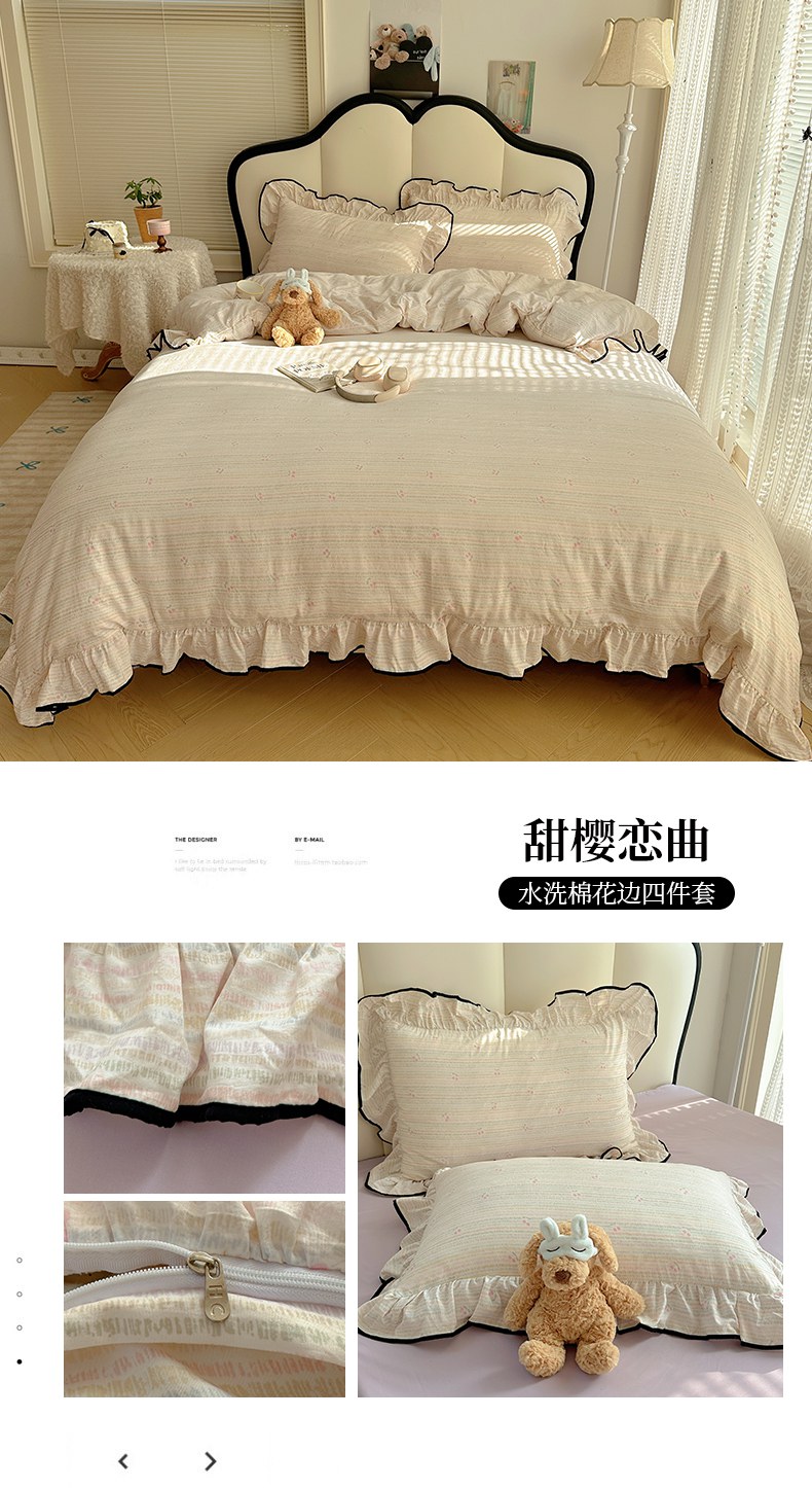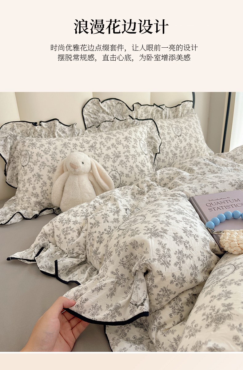 当前位置: 91家纺网 > 商品网购 > 床品套件 > 四件套 > 水洗棉四件套 > 韩巢家纺 2026新款水洗棉花边款四件套 花时宇间【大花边款】