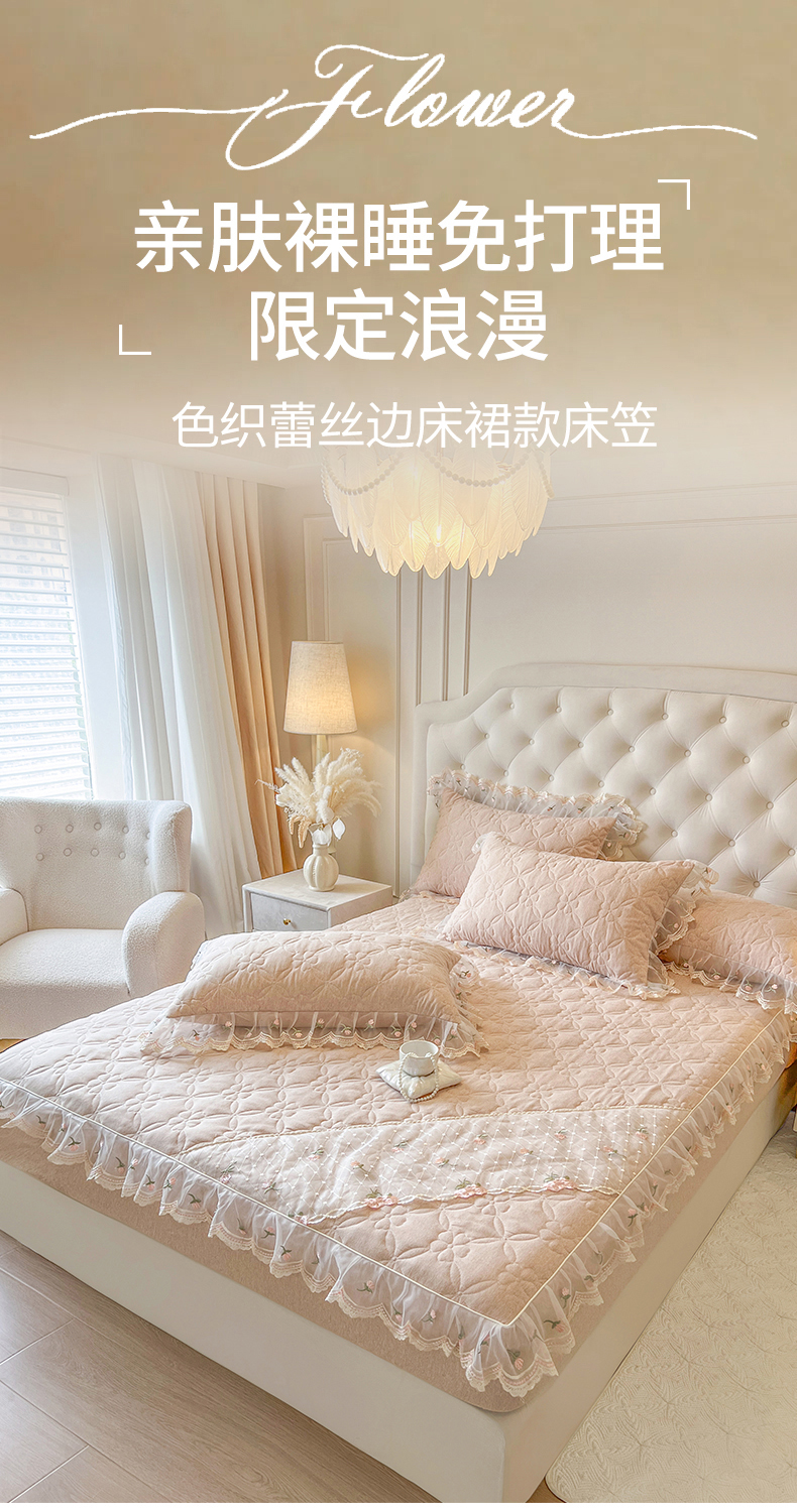 • 91家纺网 家纺一手货源 找家纺 (总)网红馆(ck家纺) 2026新款全棉蕾丝花边床裙款床笠晨暮花间系列,绯红,粉色,麦绿,米色,浅紫,雾蓝