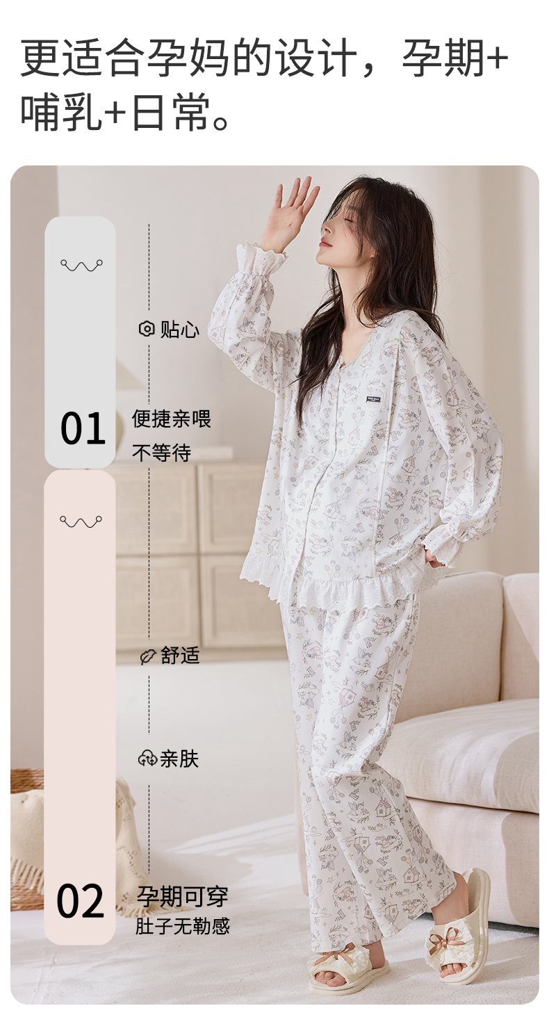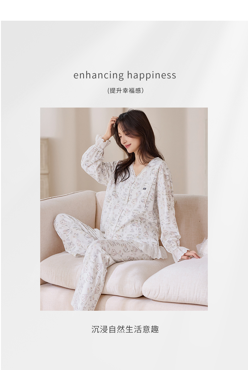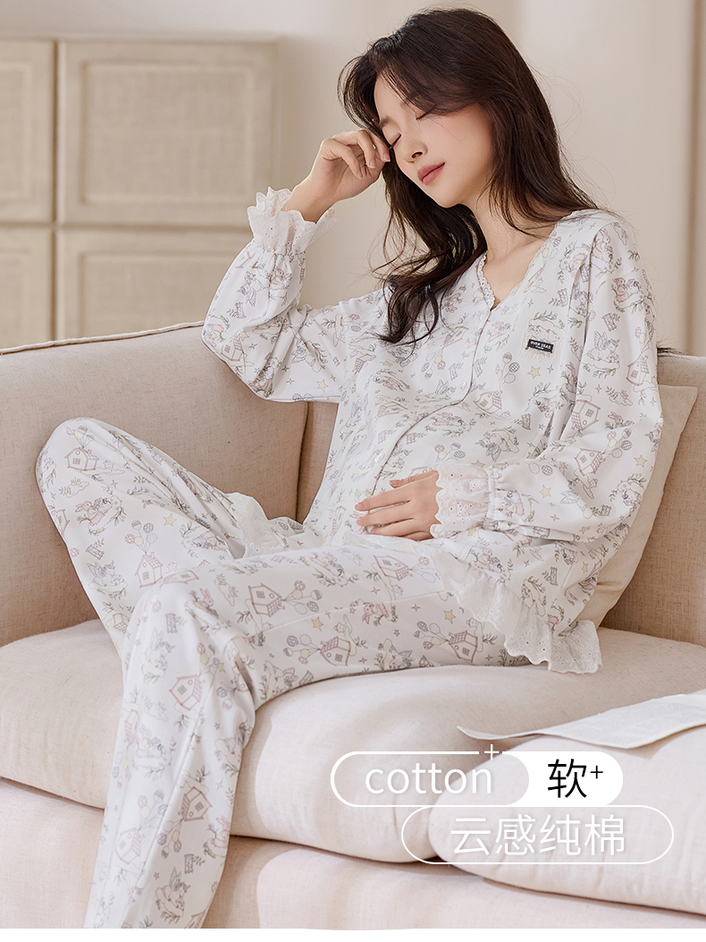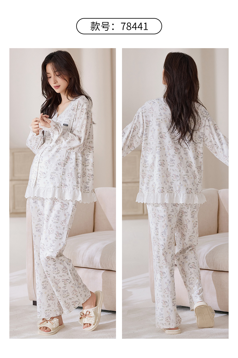 商品名称:洛兰沙家居馆 2026春秋季新款小清新针织全棉纯棉100%翻领开衫双长孕妇月子服睡衣女 翻领套装4