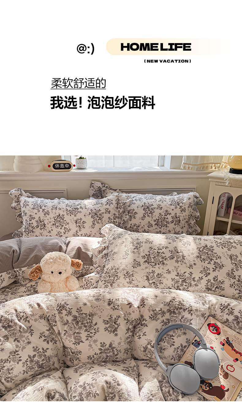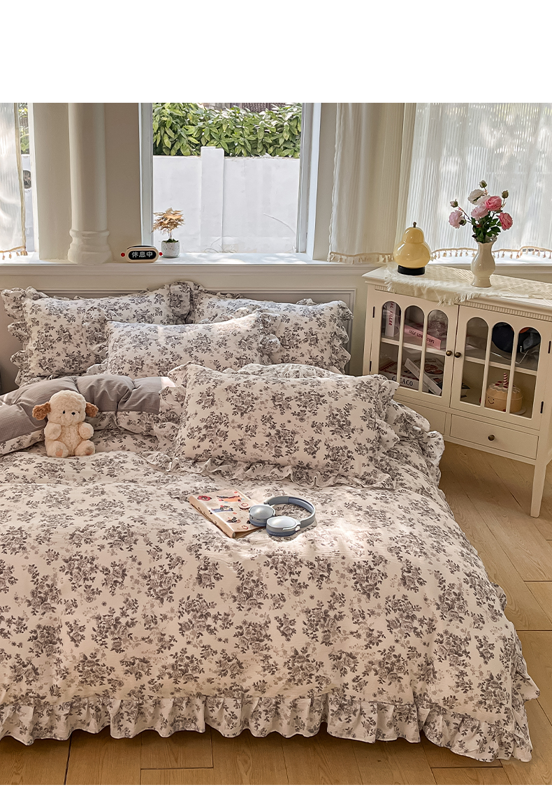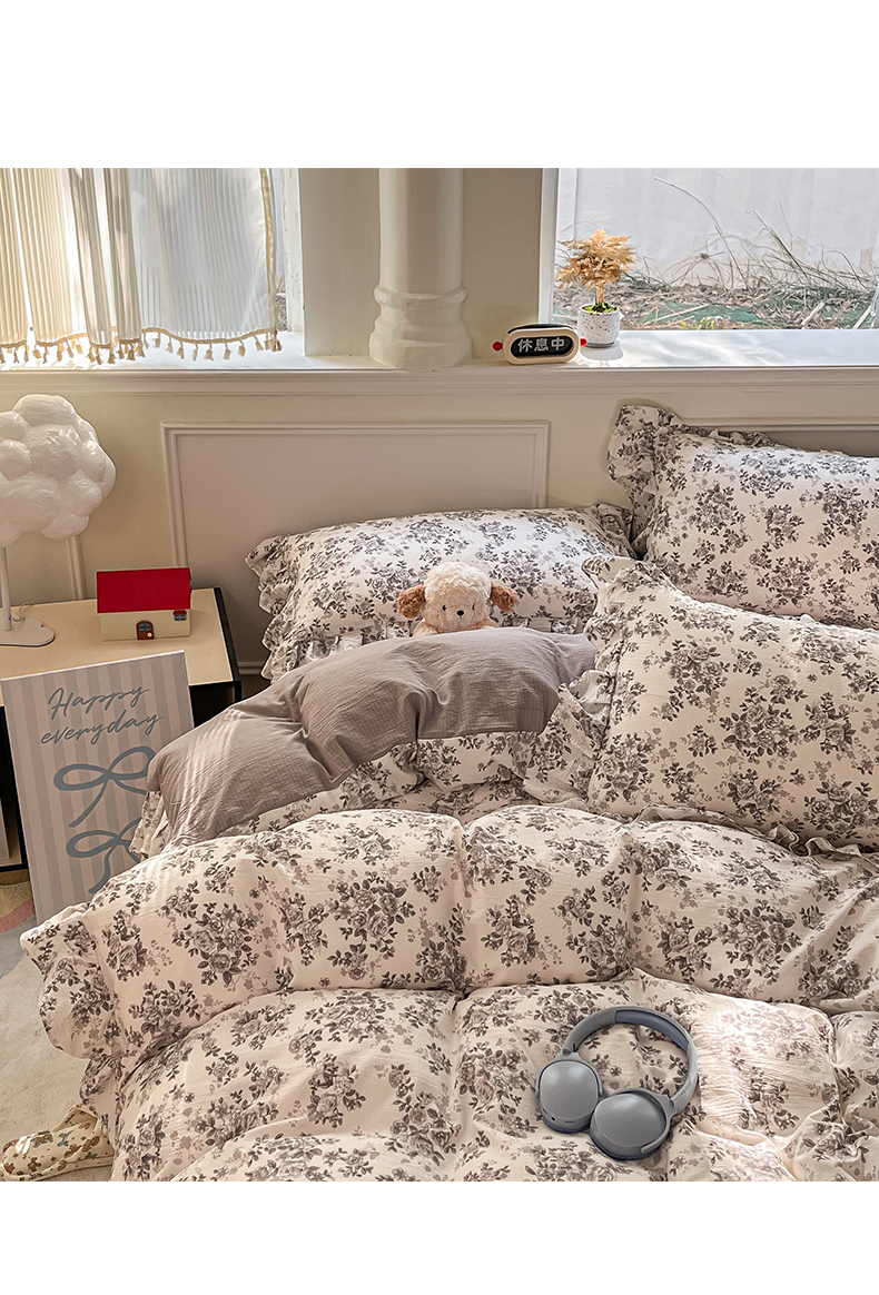 当前位置: 91家纺网 > 商品网购 > 床品套件 > 四件套 > 其它四件套 > 摩妮卡 2026新款泡泡纱韩版印花花边四件套 水墨玫瑰