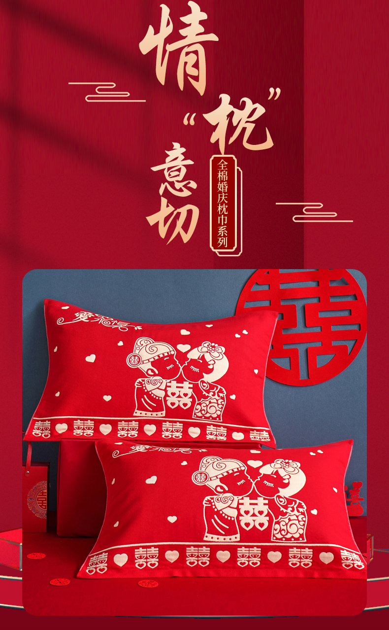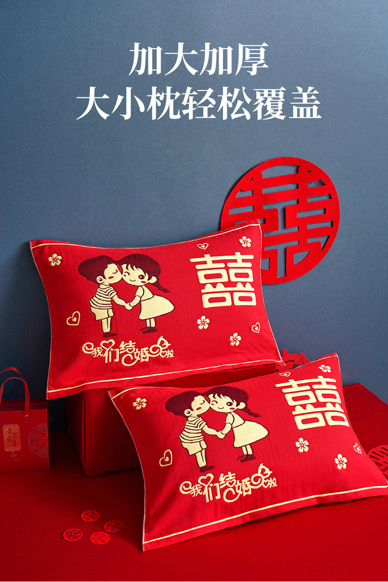 朴尔家纺-毛巾被 2026新款全棉40股结婚大红多层纱布透气情侣婚庆枕巾 永结同心