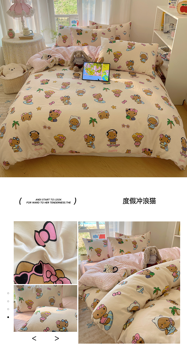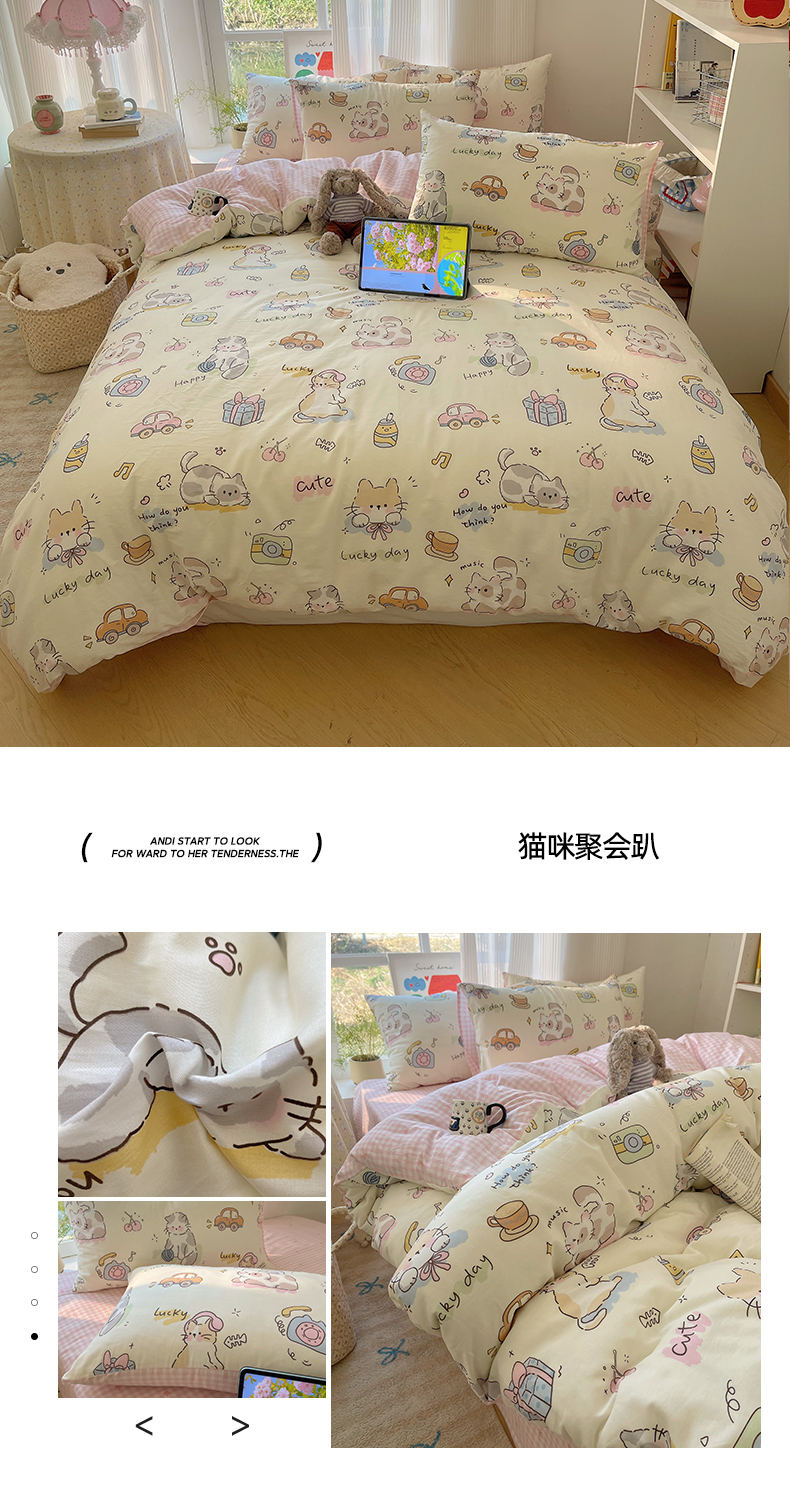 (总)六巷胡同 2026新款INS减龄可爱风卡通全棉四件套(第二系列),豹纹黑皮猫,粉格趣味犬,度假冲浪猫,海盐豹纹猫,爱心汉堡喵,假日蛋糕犬,猫咪聚会趴,蓝调波点兔,蓝格美拉犬,萝莉樱桃猫,汪星人派对,小熊周末集,星星萝莉猫