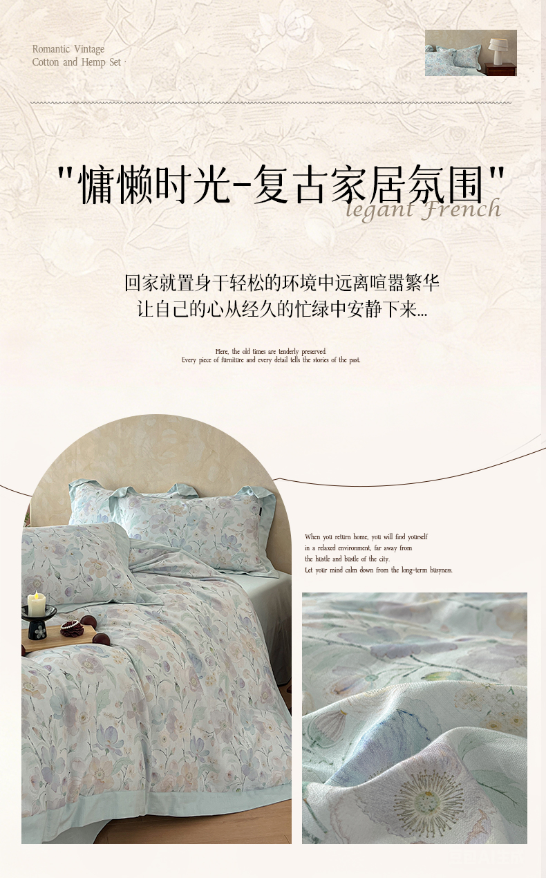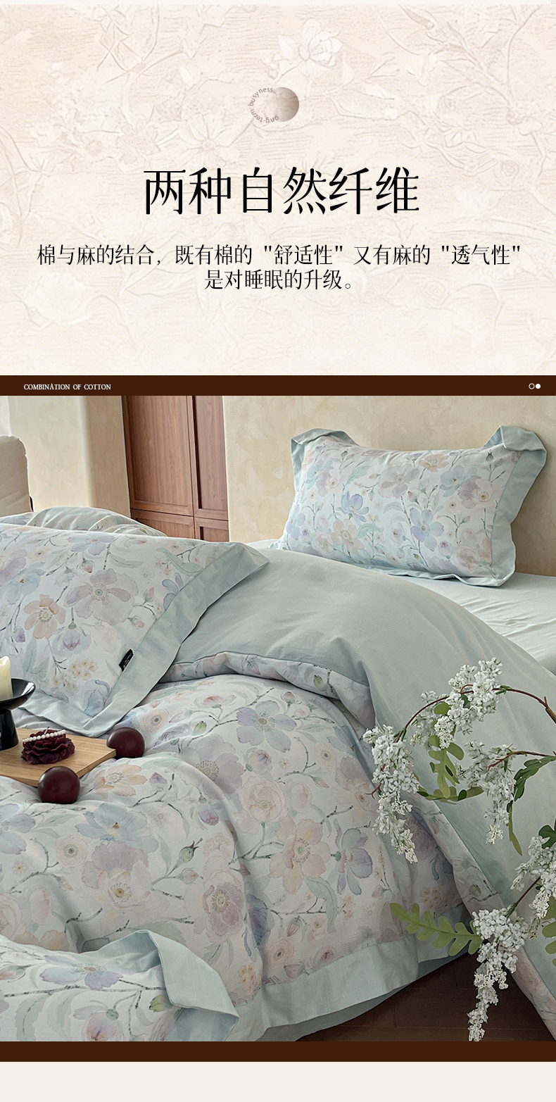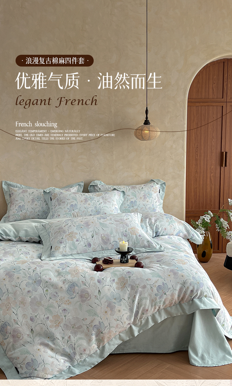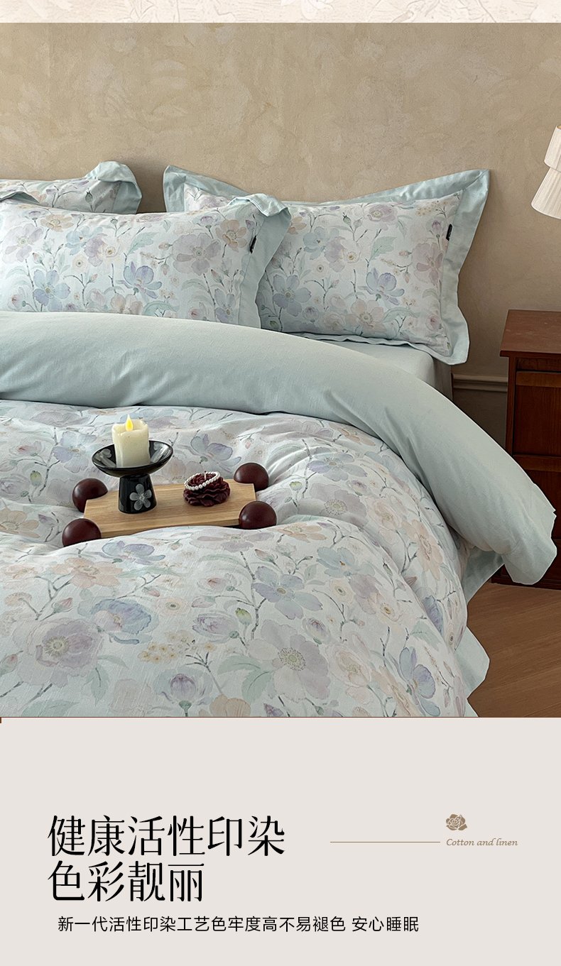 (总)金昱纺 2026新款拼角工艺款数码印花棉麻四件套,薇光-兰,布拉格-兰,辰梦-绿,恋恋时光-紫,梦幻巴黎-灰,岁晚-咖,万川-咖,叶璃-咖