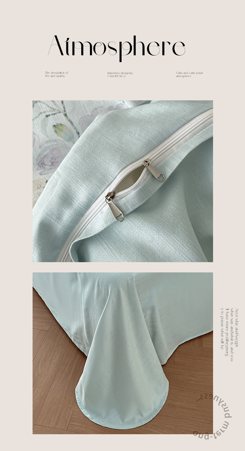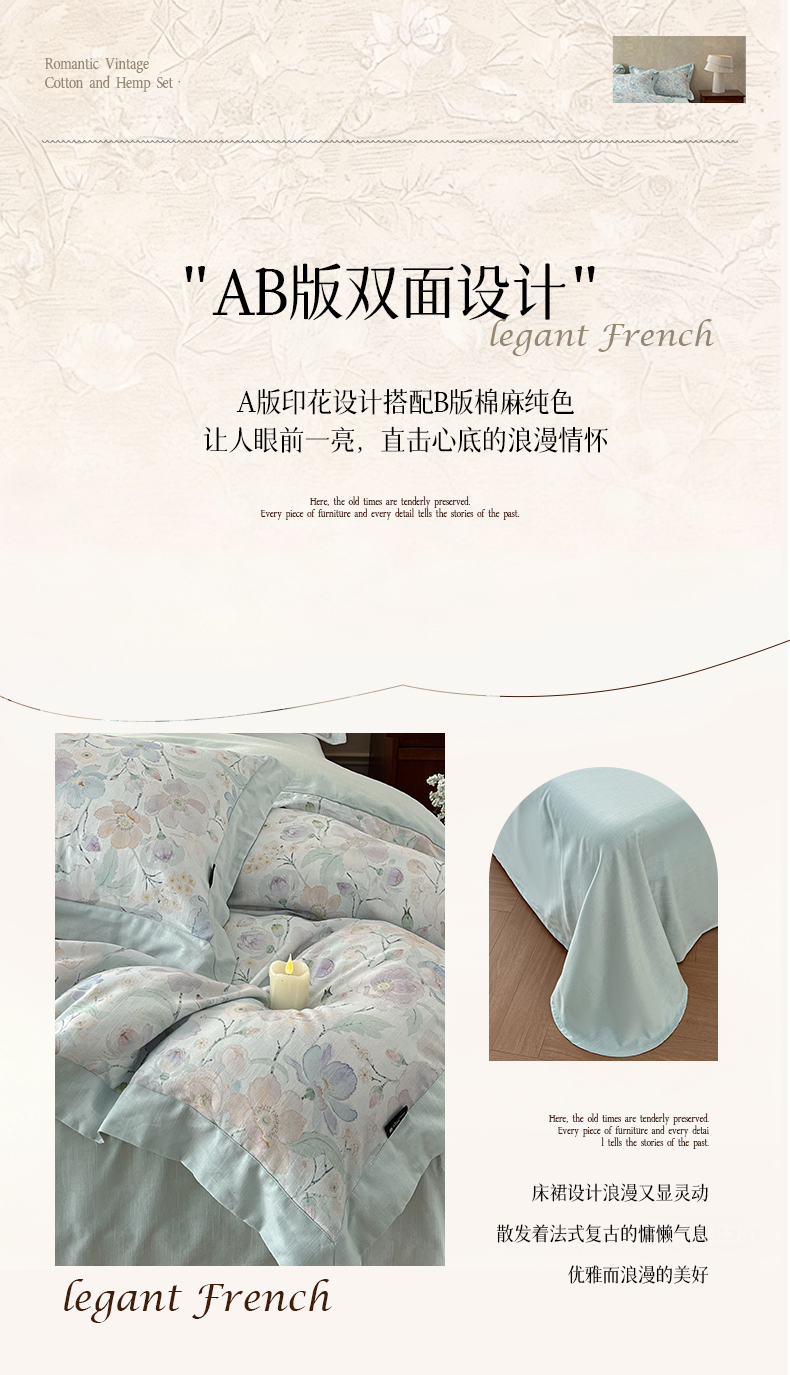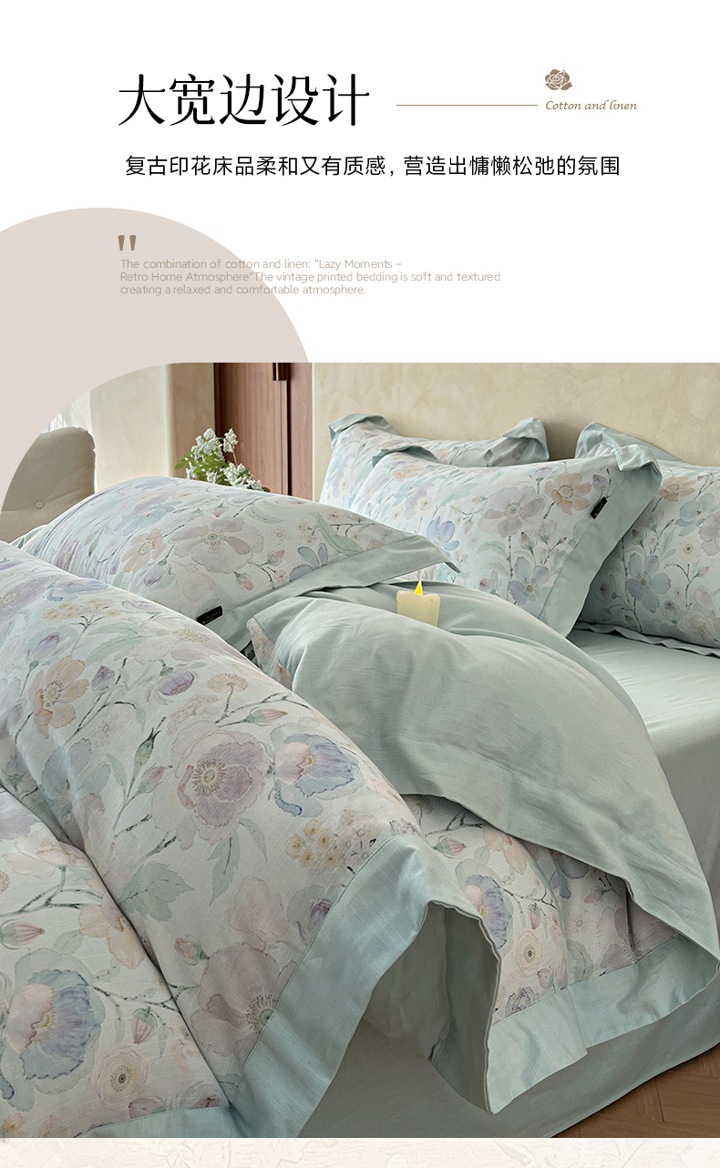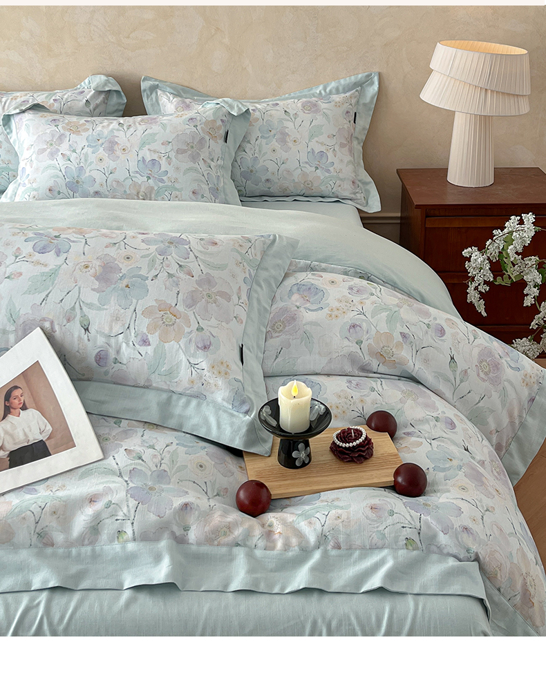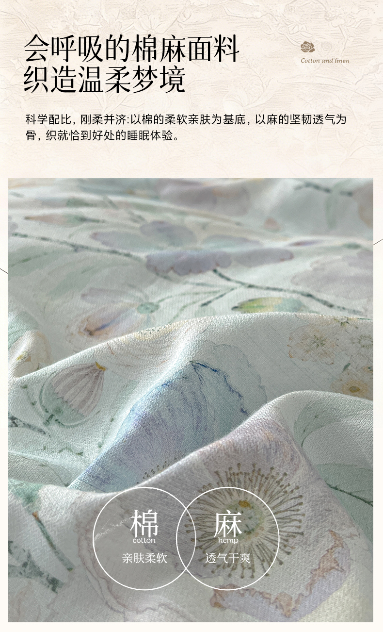 (总)金昱纺 2026新款拼角工艺款数码印花棉麻四件套,薇光-兰,布拉格-兰,辰梦-绿,恋恋时光-紫,梦幻巴黎-灰,岁晚-咖,万川-咖,叶璃-咖