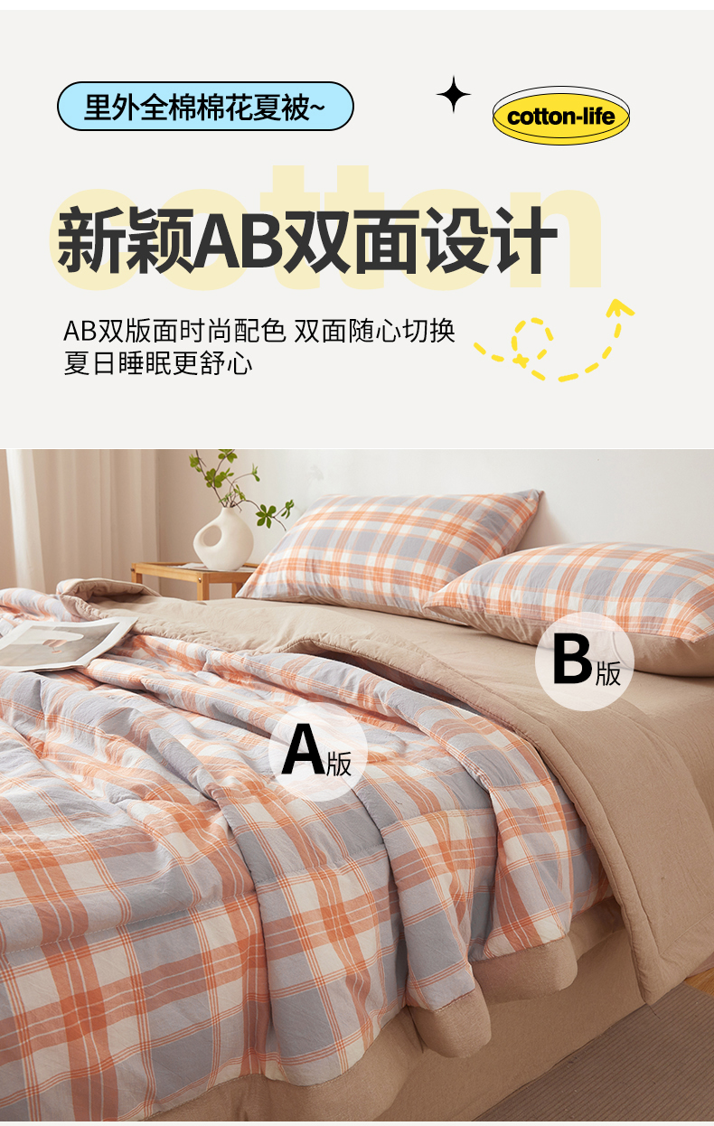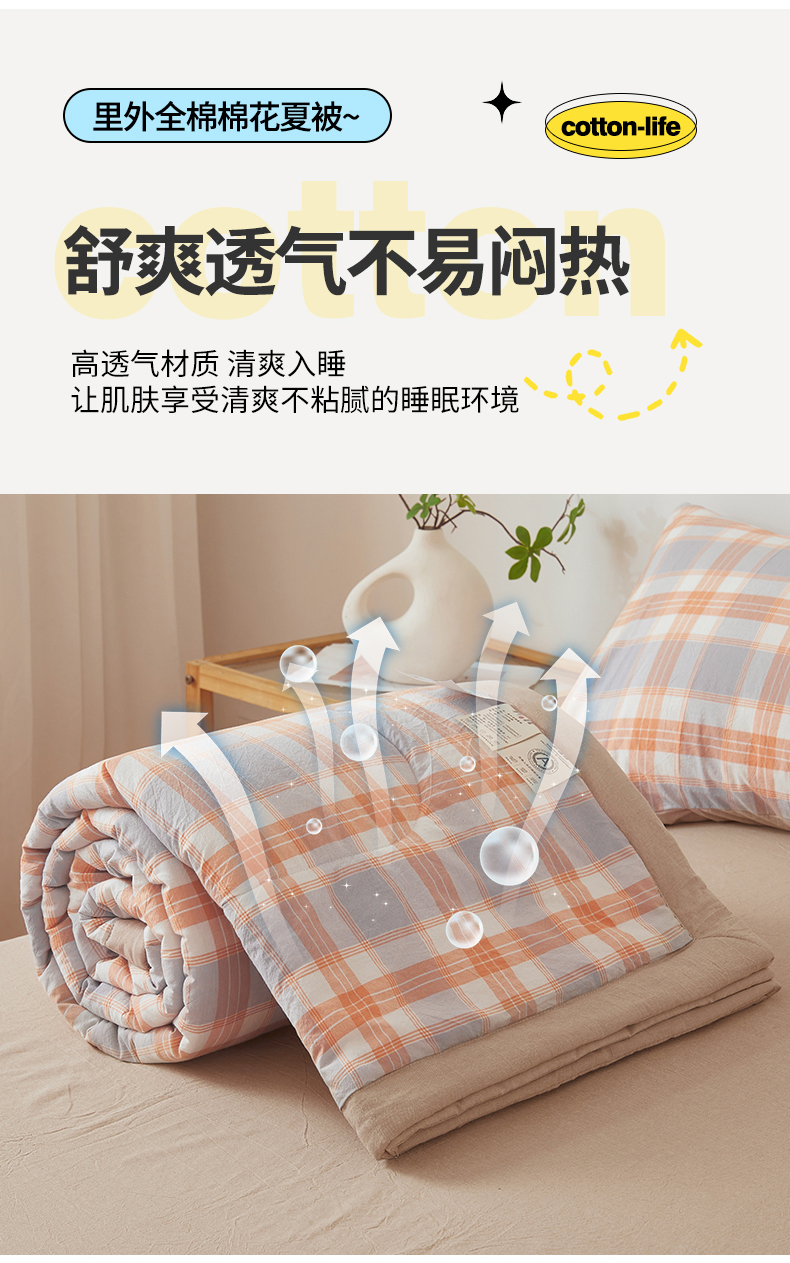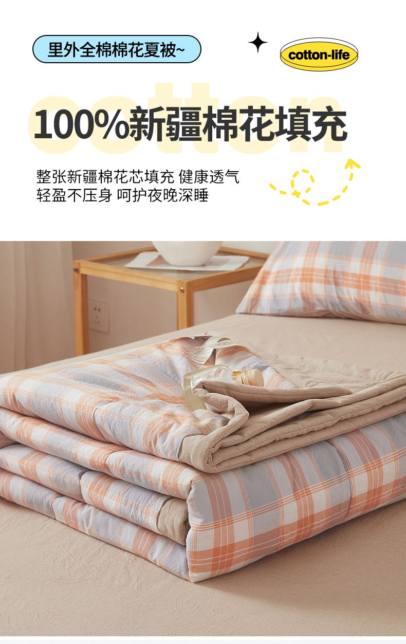 2026新款A类里外全棉夏凉被100%新疆棉纯棉全棉填充无印格子款空调被全棉夏被 里外全棉-桔灰格