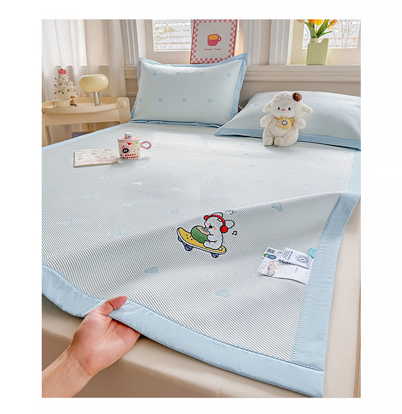 (总)梦卡迪 2026新款A类爱心卡通凉感豆豆绣花床席,滑板小狗-蓝,胡萝卜小兔-粉,三只小马-灰,三只熊猫-绿,幸运小狗-咖