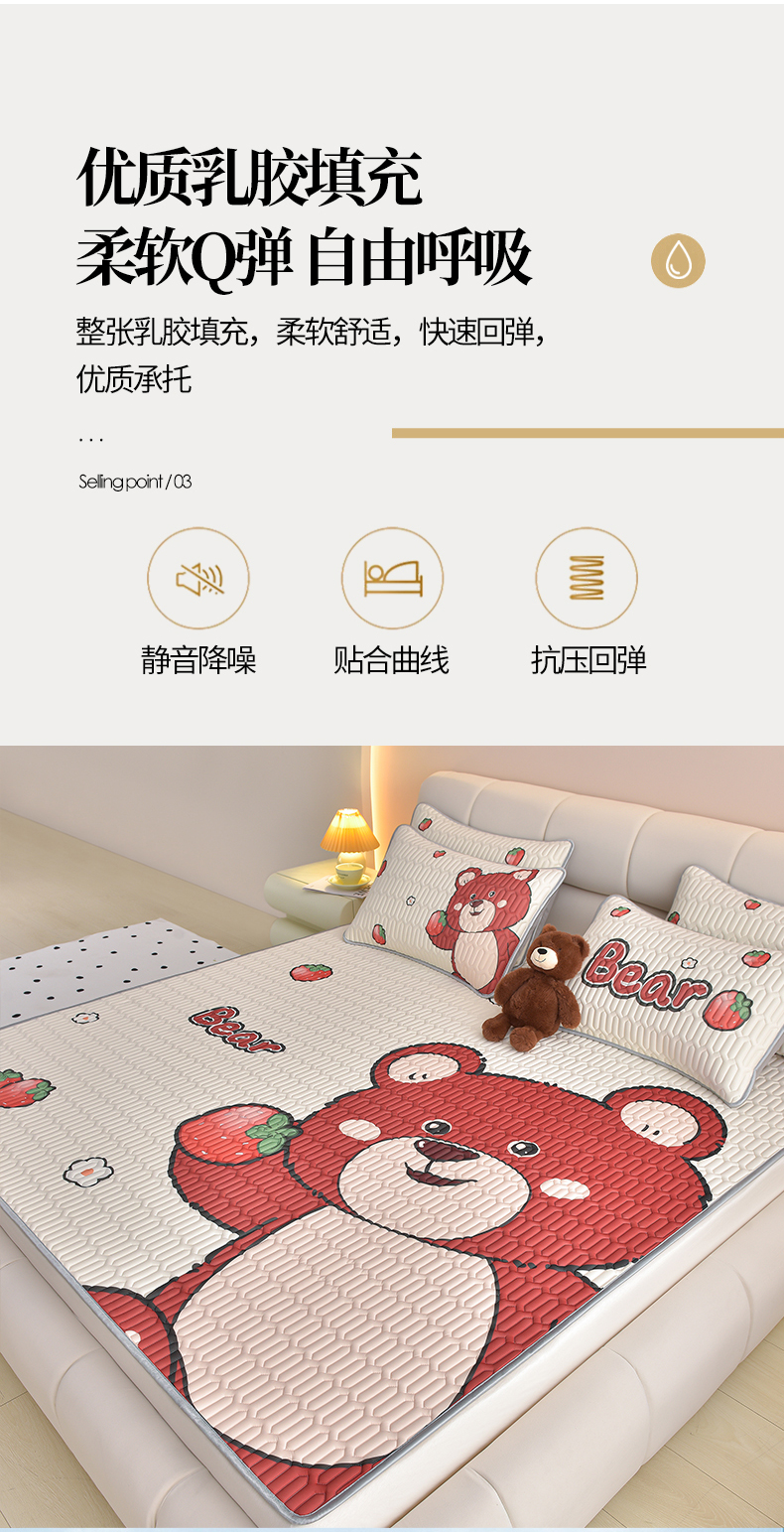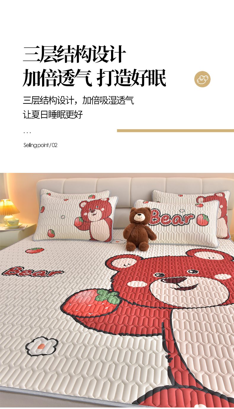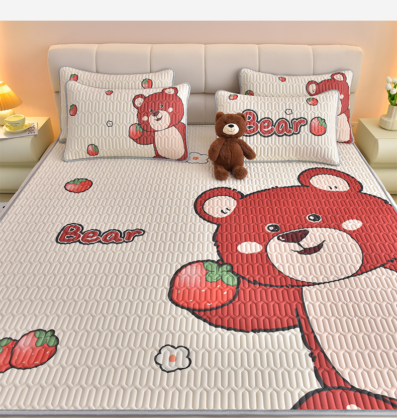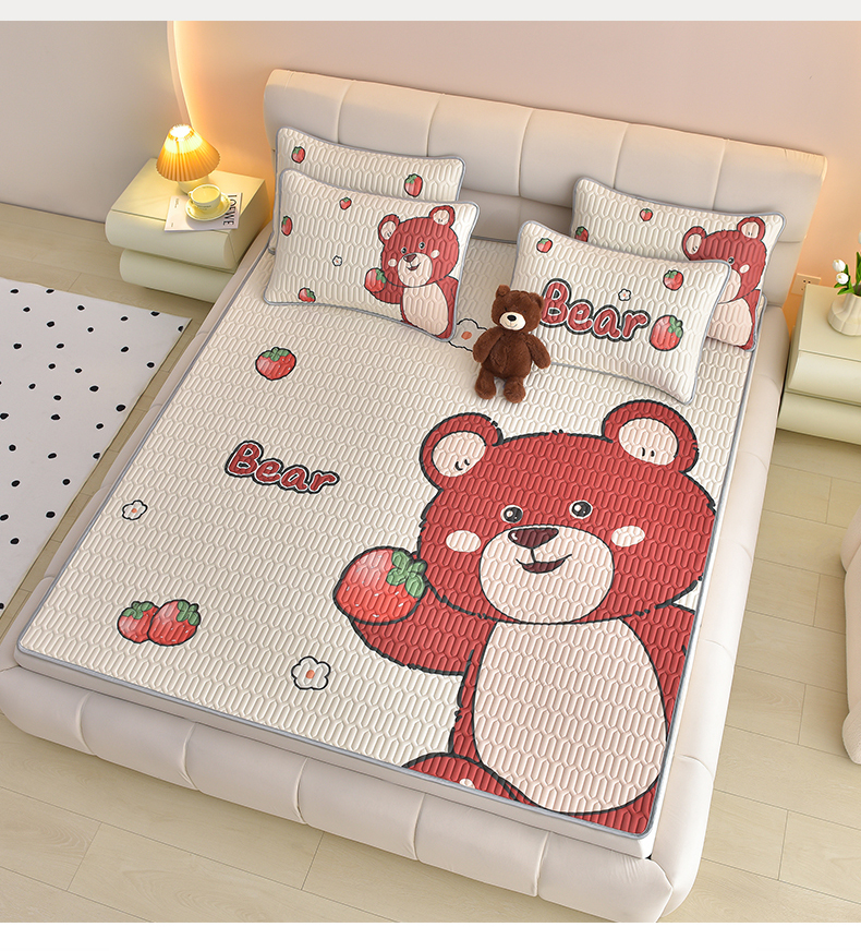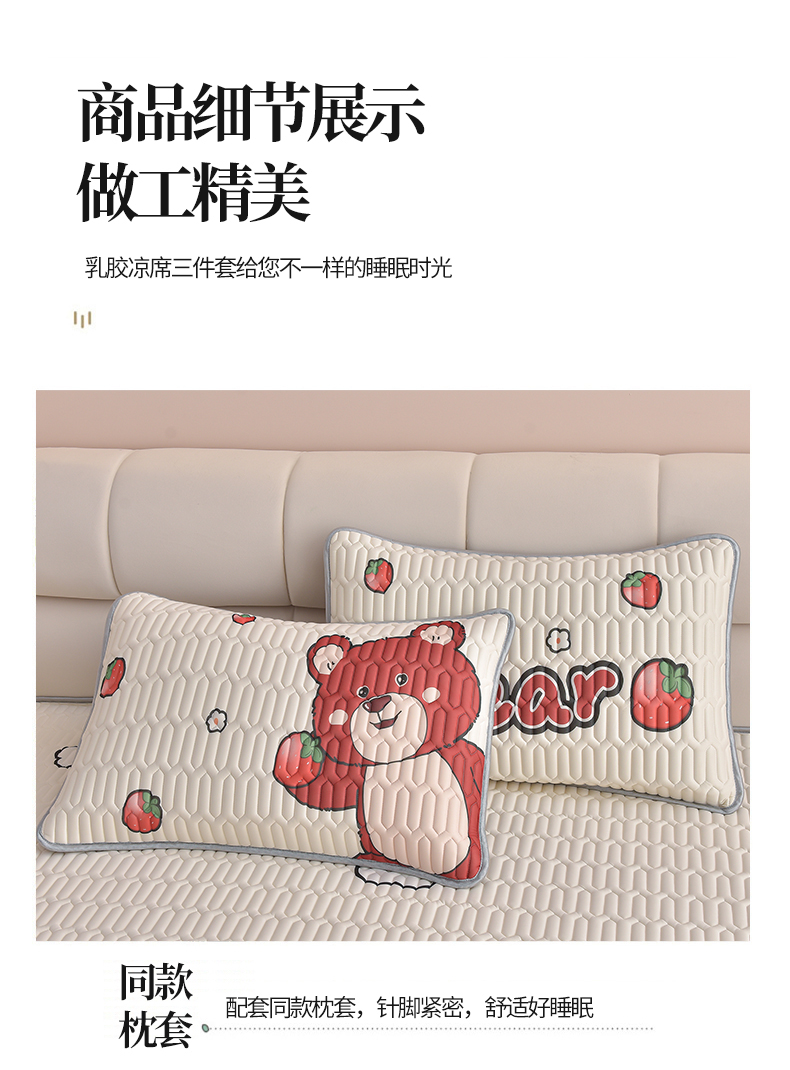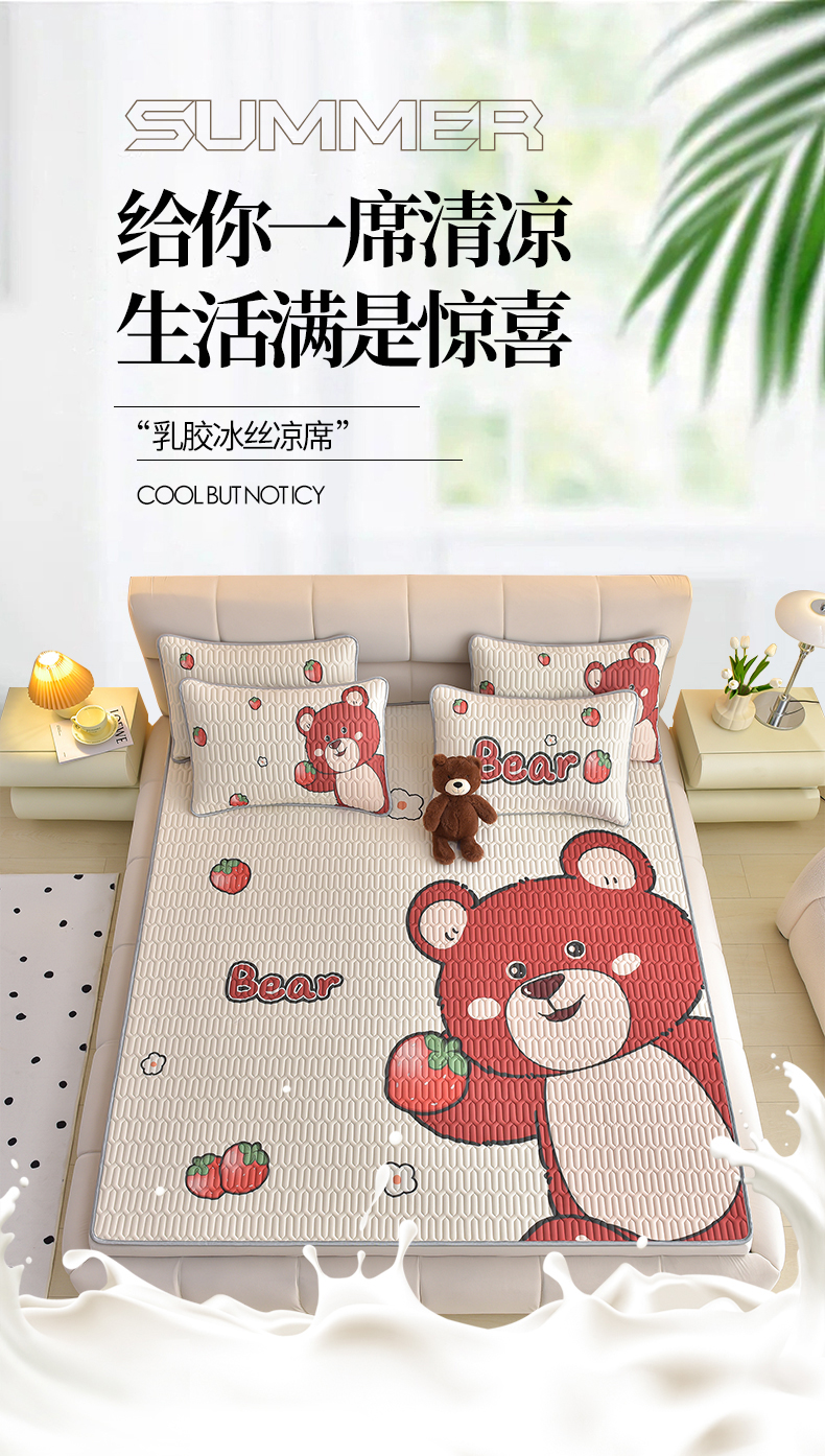 商品名称:炫拼家纺 2026新款凉感丝大版卡通乳胶凉席三件套 草莓园小熊