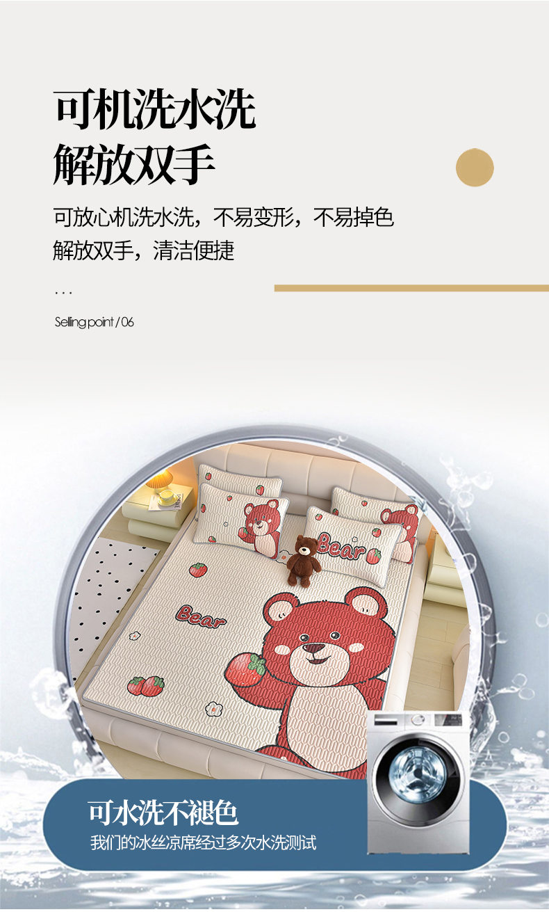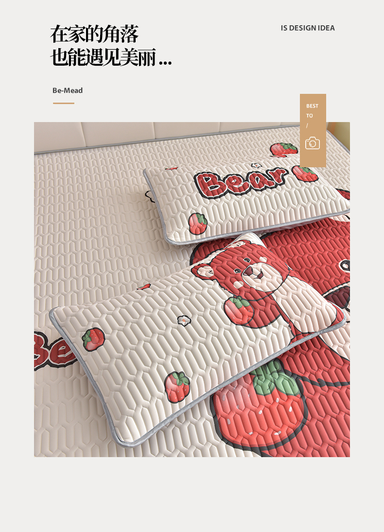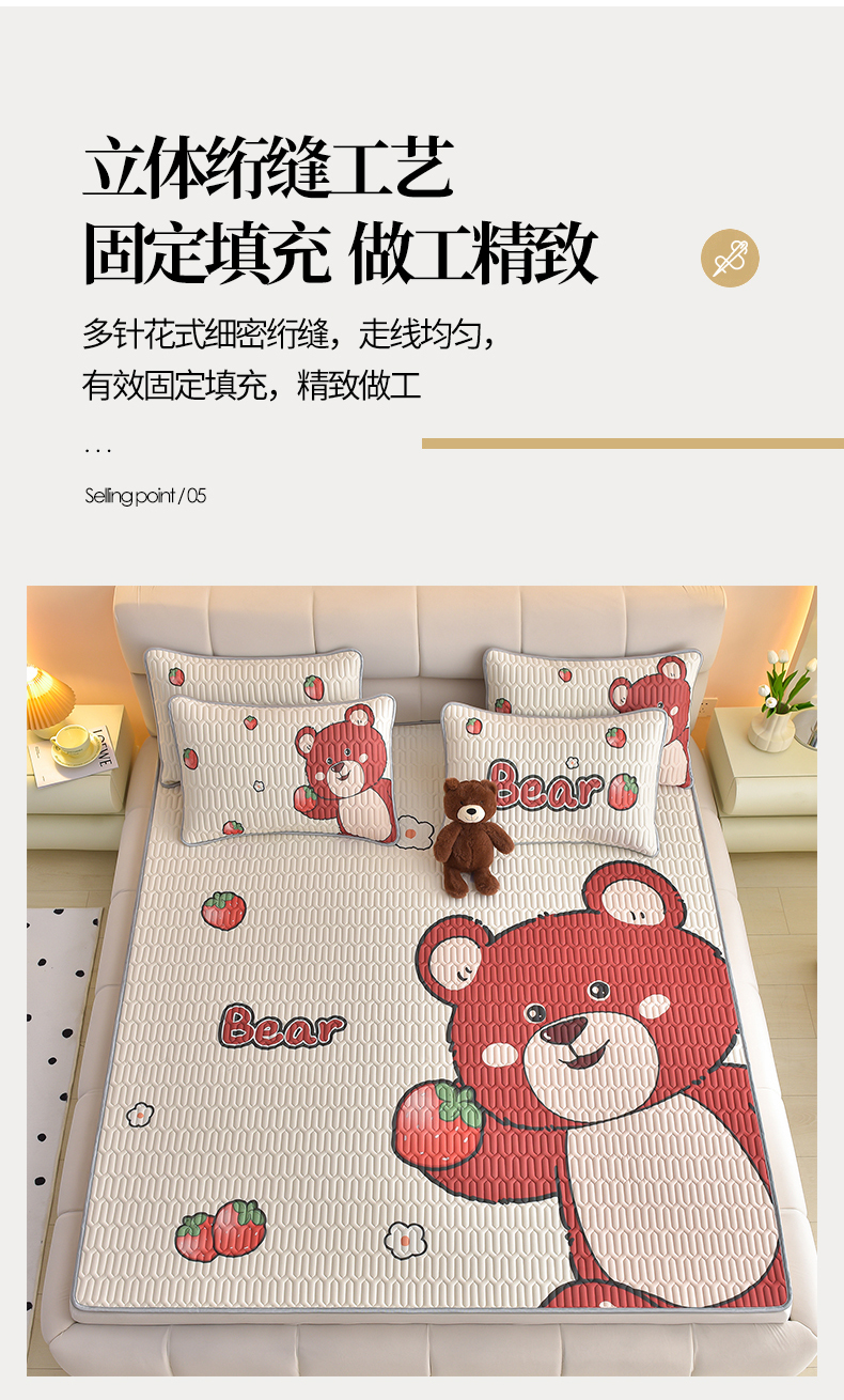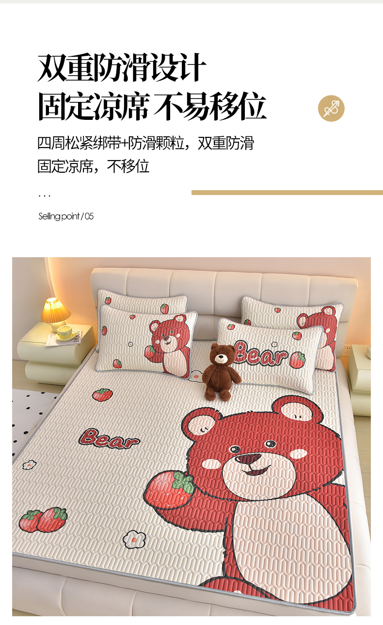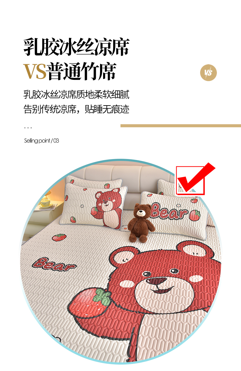 商品名称:炫拼家纺 2026新款凉感丝大版卡通乳胶凉席三件套 草莓园小熊