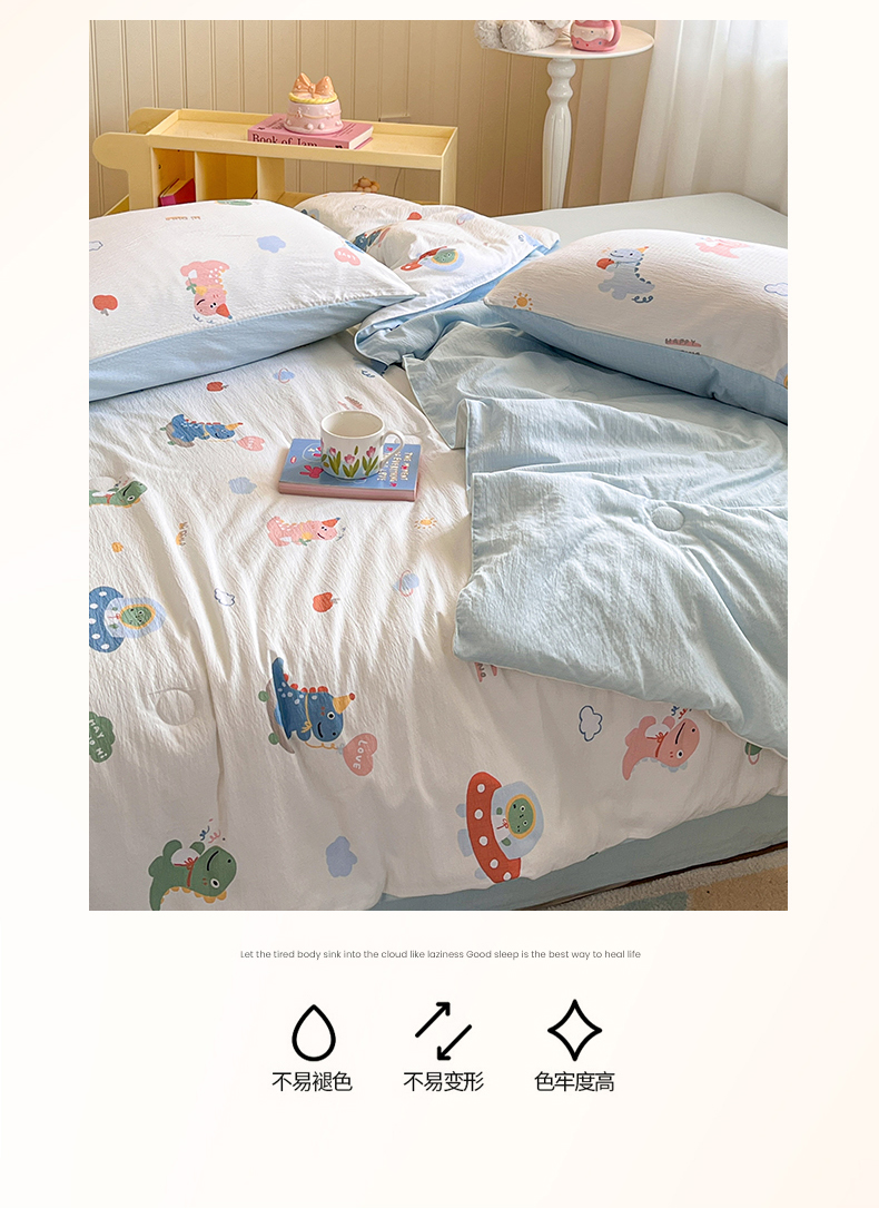 • 91家纺网 家纺一手货源 找家纺 盛秋家纺 2026新款皱皱纱印花夏被-萝拉 恐龙游记+天空蓝