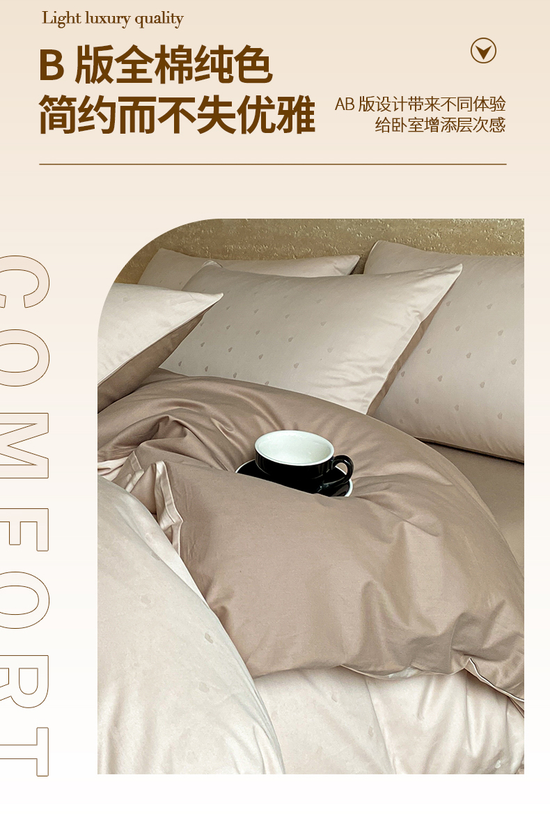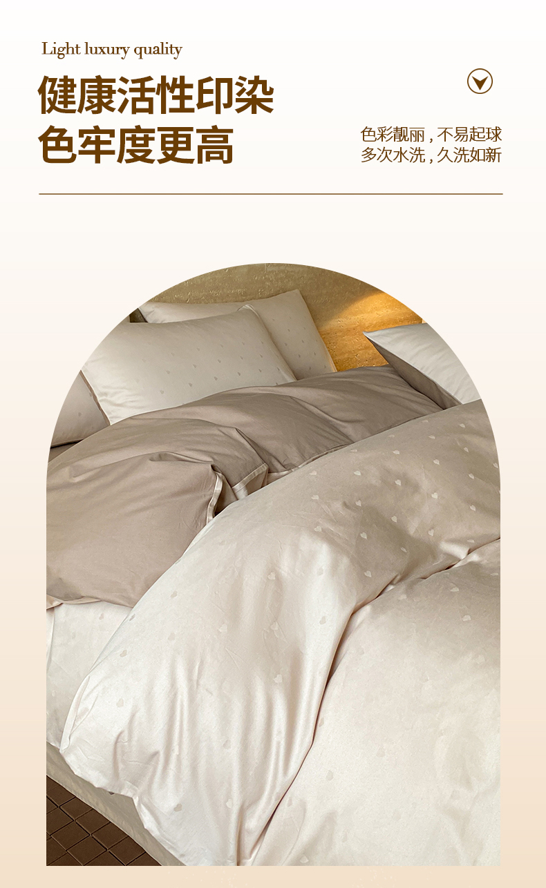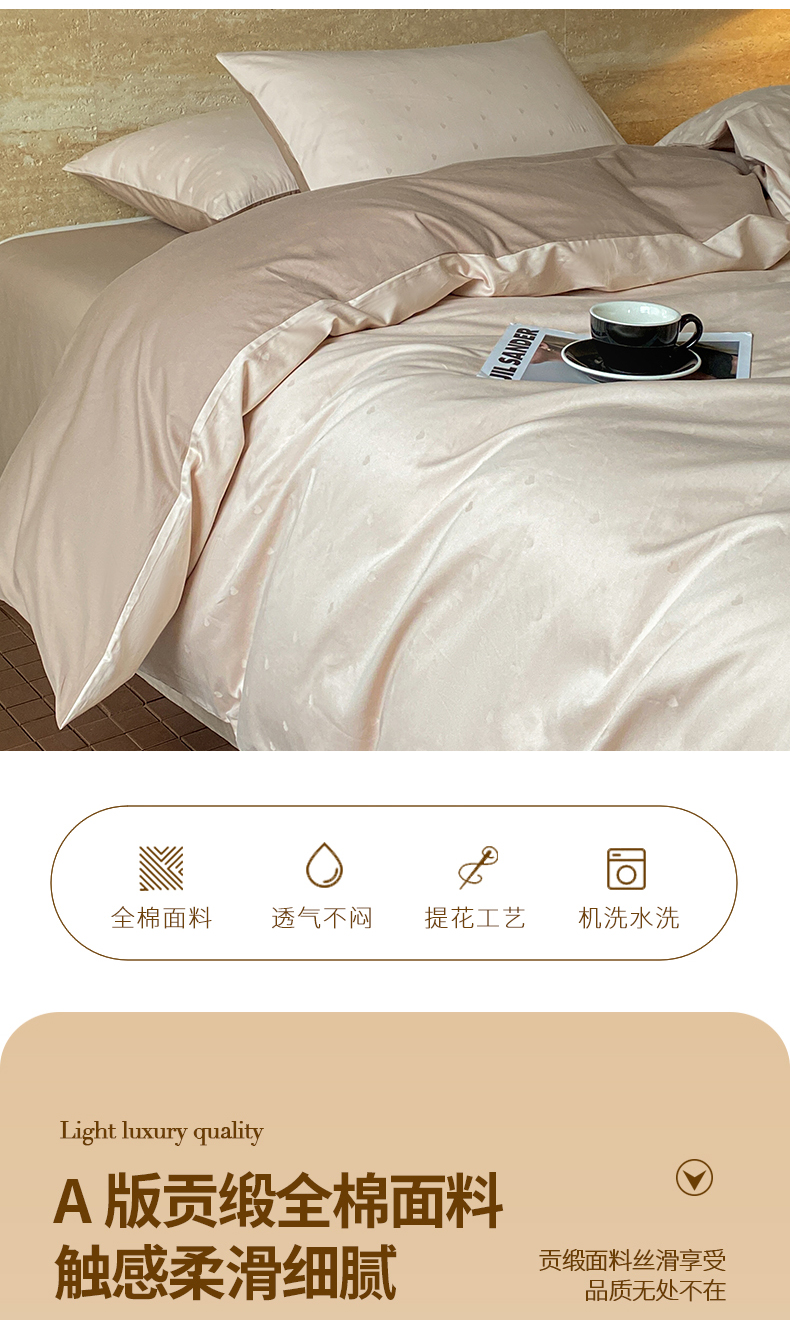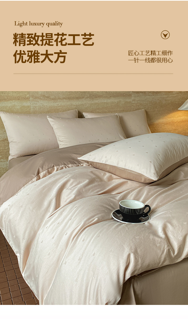 当前位置: 91家纺网 > 商品网购 > 床品套件 > 四件套 > 全棉普通四件套 > 琪格格纺织 2026新款纯棉全棉60s贡缎轻奢大提花四件套 纯棉贡缎 小爱心浅咖