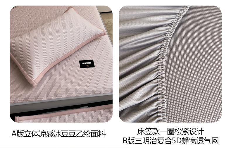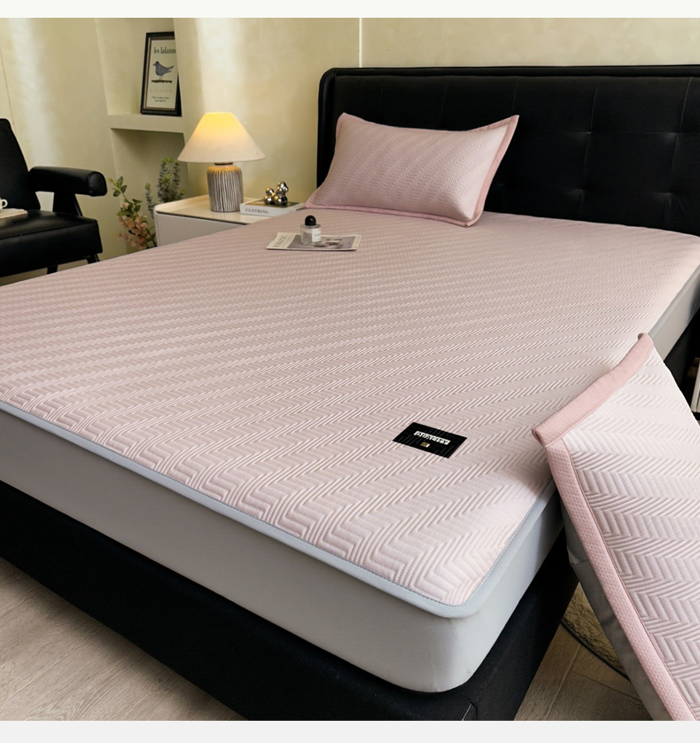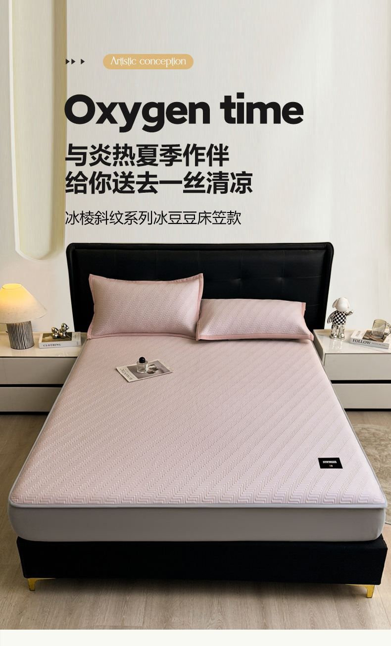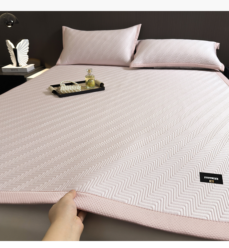 • 91家纺网 家纺一手货源 找家纺 慕木家纺 2026新款A类高克重三明治复合乙纶提花冰豆豆凉席床笠冰棱斜纹系列(提供买家秀) 冰棱斜纹-粉床笠款