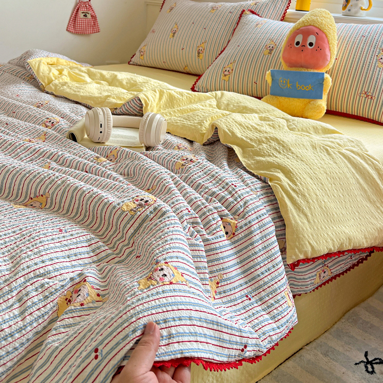 (总)恒尚居 2026新款A类泡芙纱贝壳边夏被四套件空调被三角针绣边夏被夏被四件套,【波点奶芙】小花边,【彩虹木马】小花边,【费尔岛小狗】小花边,【粉糖泡泡猫】小花边,【兰格奶狗】小花边,【奶黄星星人】小花边,【细格木马】小花边,【阳光条纹】小花边,【字母喵喵】小花边