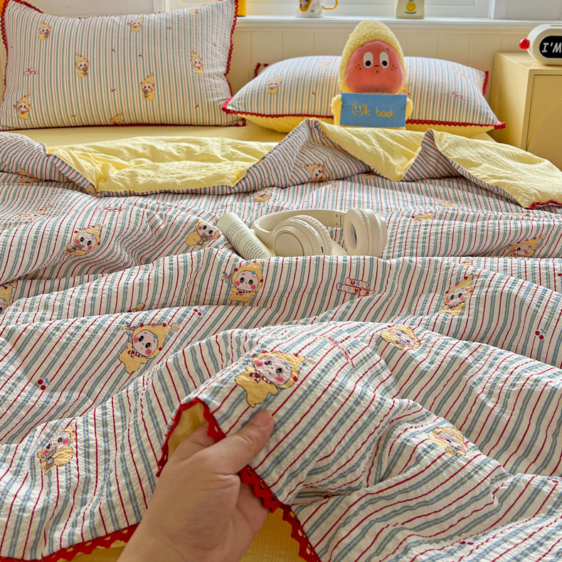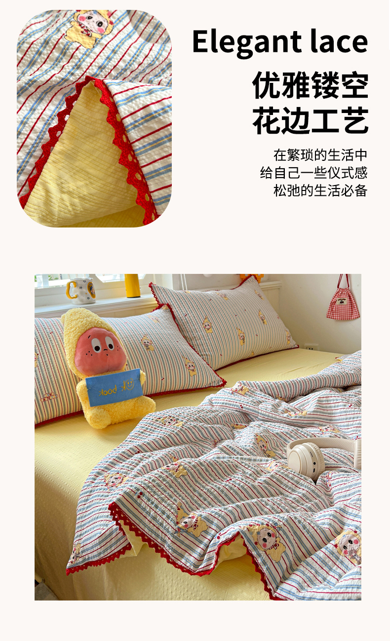 商品名称:恒尚居 2026新款A类泡芙纱贝壳边夏被四套件空调被三角针绣边夏被夏被四件套 【阳光条纹】小花边