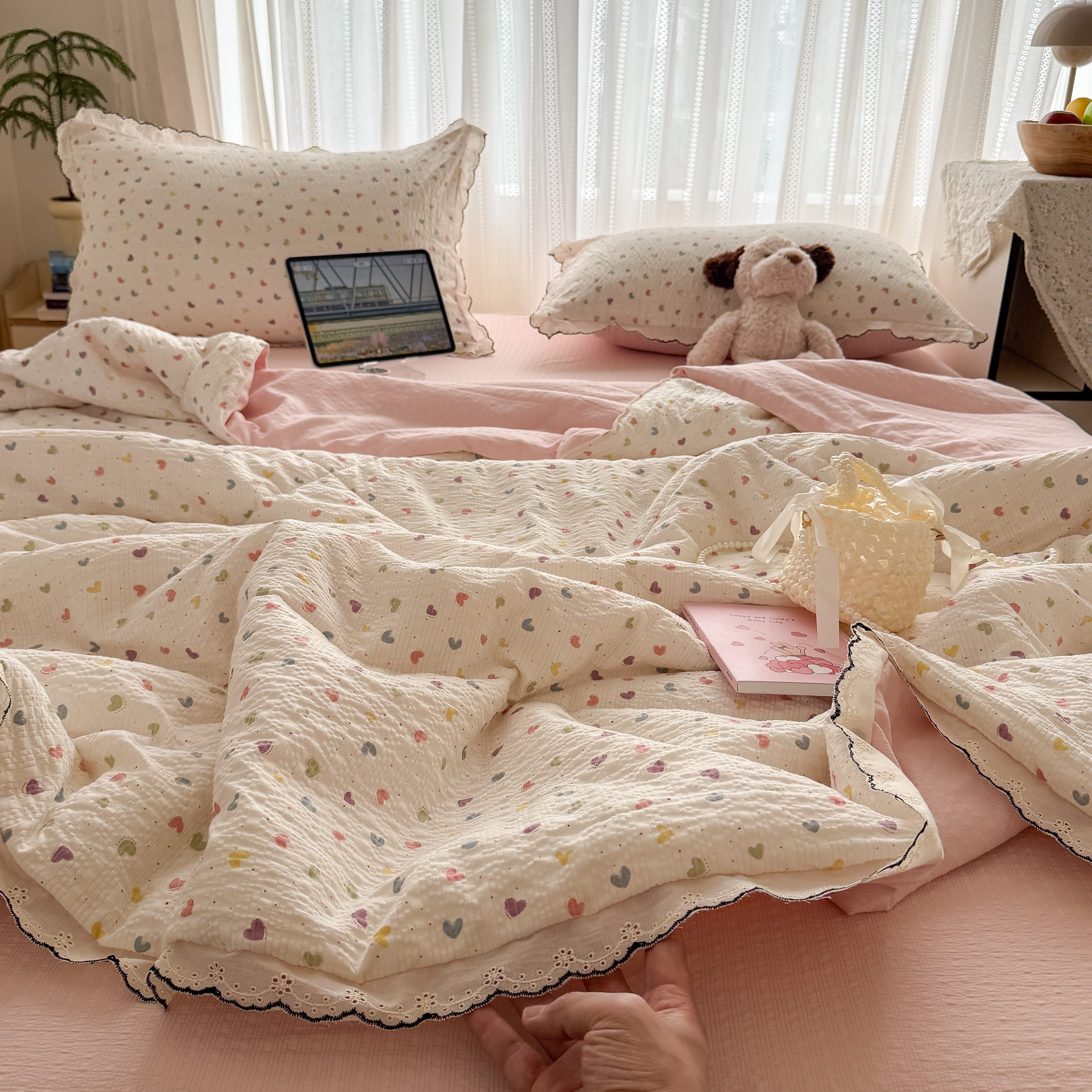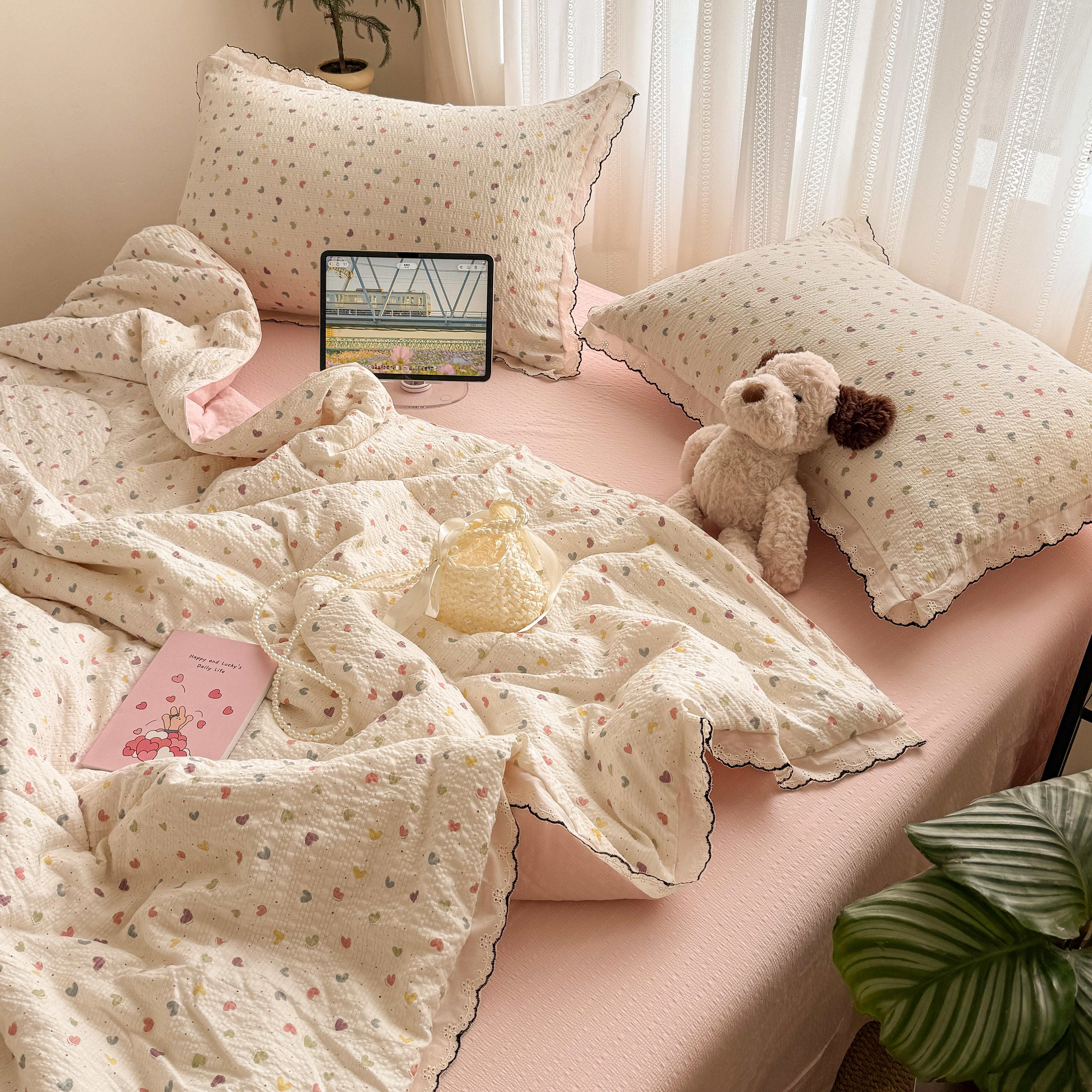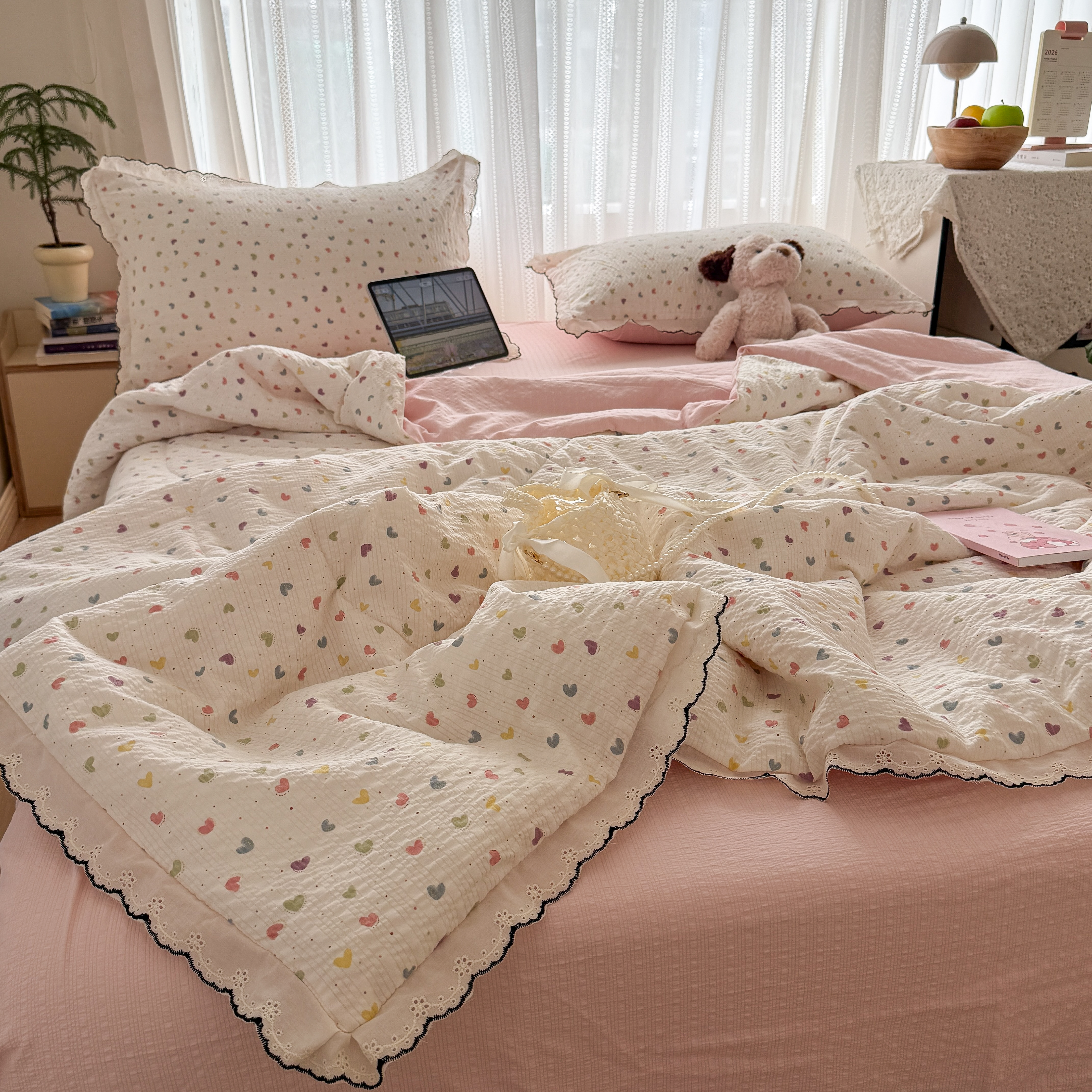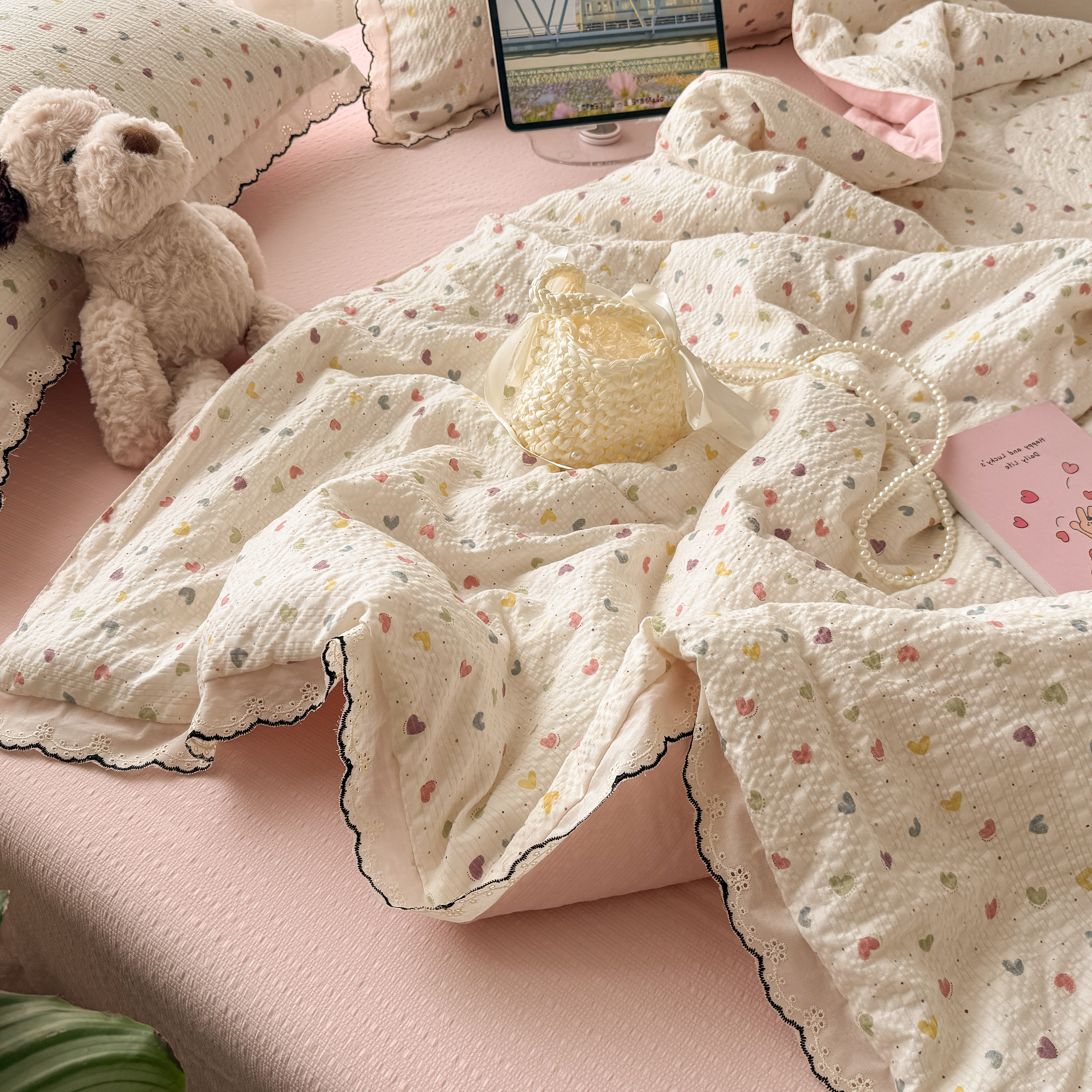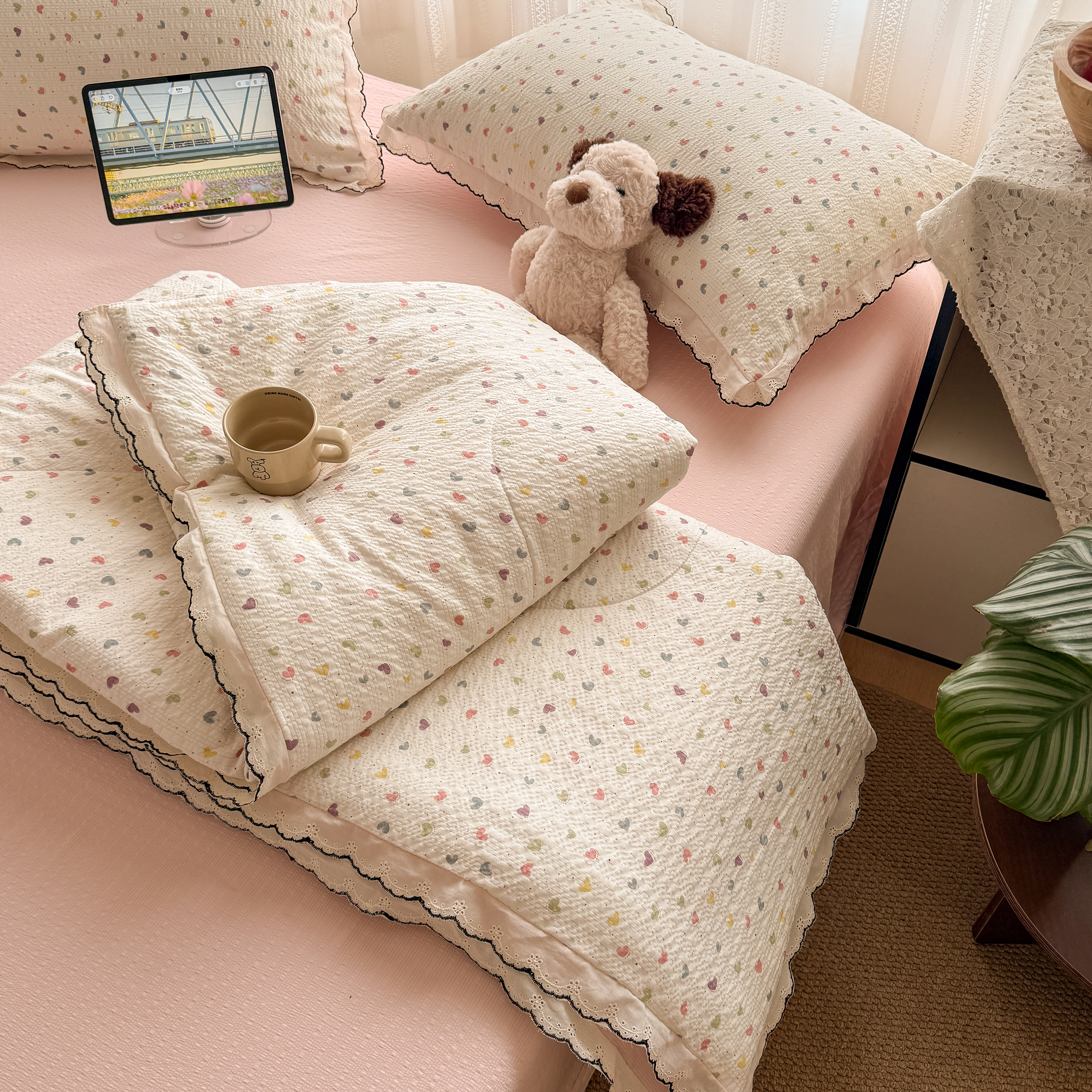 欧尚 2026新款蕾丝花边夏被款四件套 彩心点点